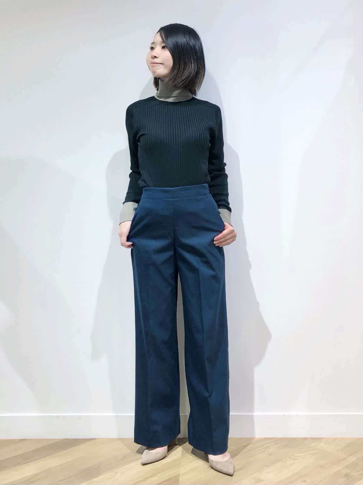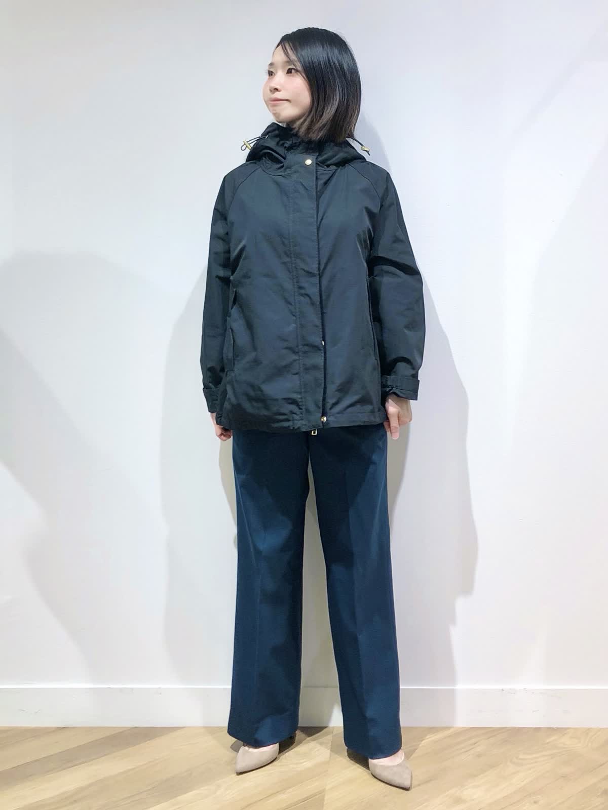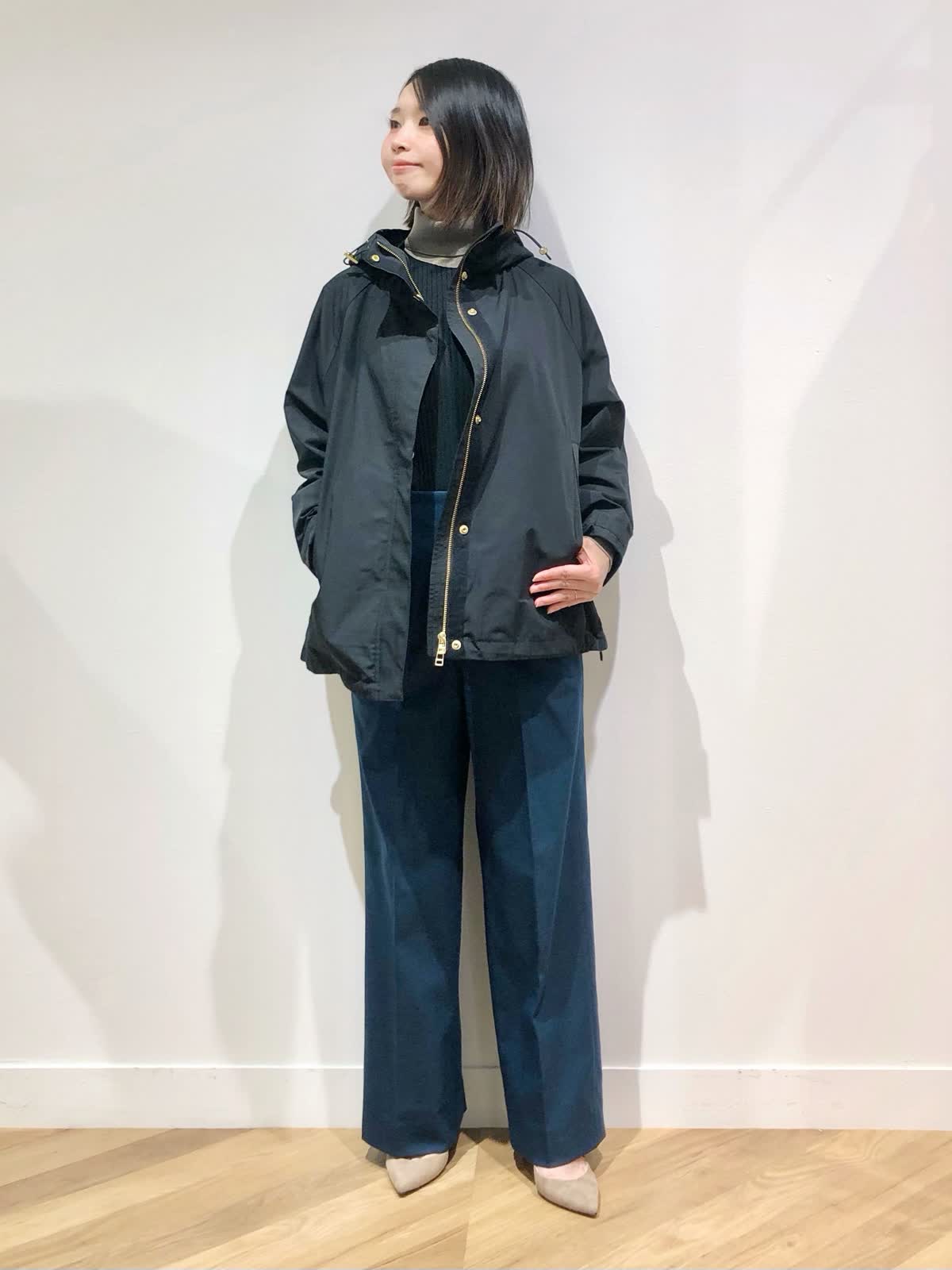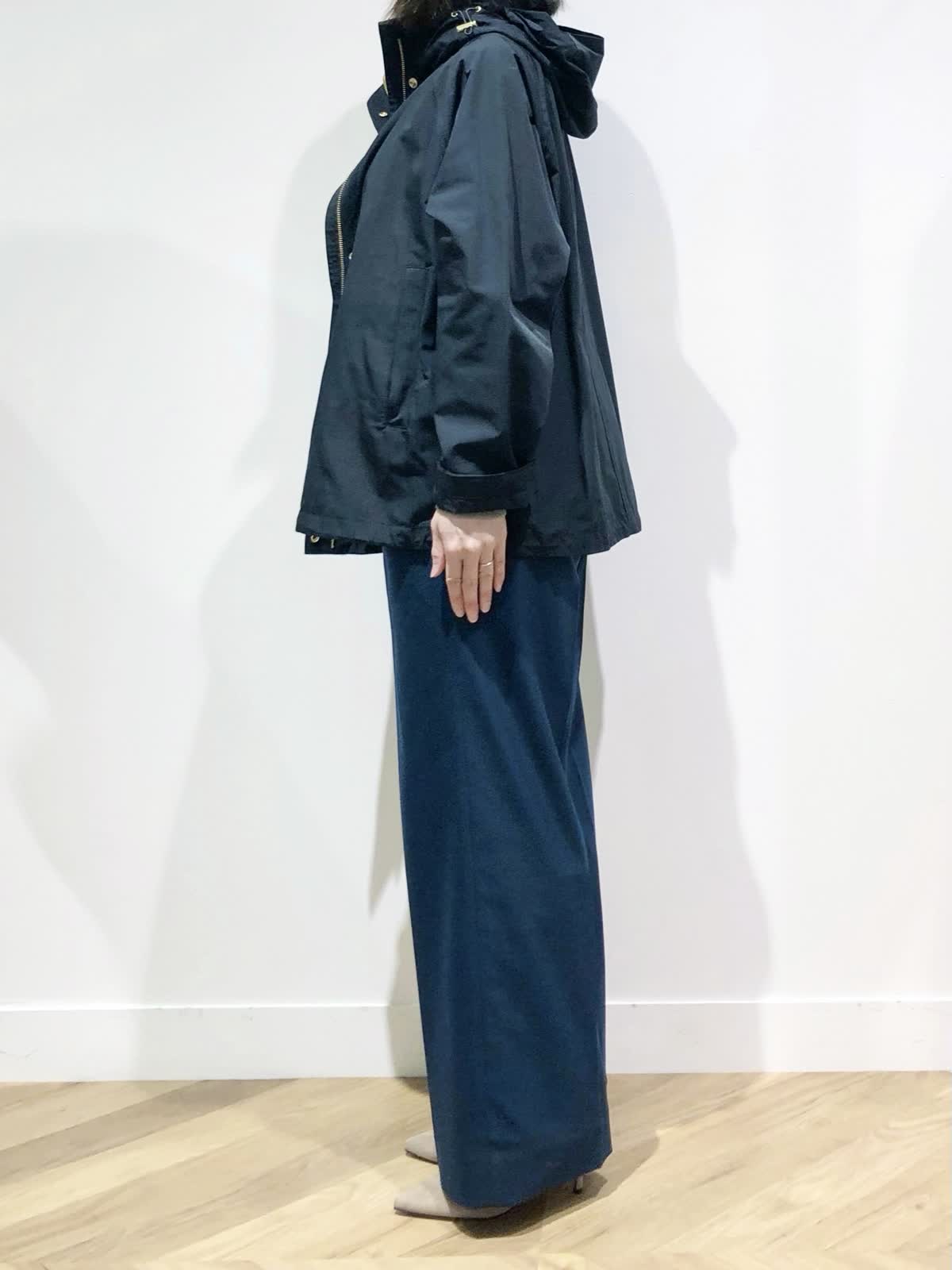 【着用サイズ】ブルゾン:7号、ニット:9号、パンツ:5号【着用カラー】ブルゾン:ブラック、ニット:スミクロ、パンツ:ダークネイビー 肌寒くなる季節におすすめのマウンテンパーカーはブラックにゴールドのジップが大人な印象。軽い着心地で秋のお出掛けからデイリー使いにぴったりです。毎年人気のリブタートルにセミワイドパンツを合わせた大人カジュアルスタイリングに。