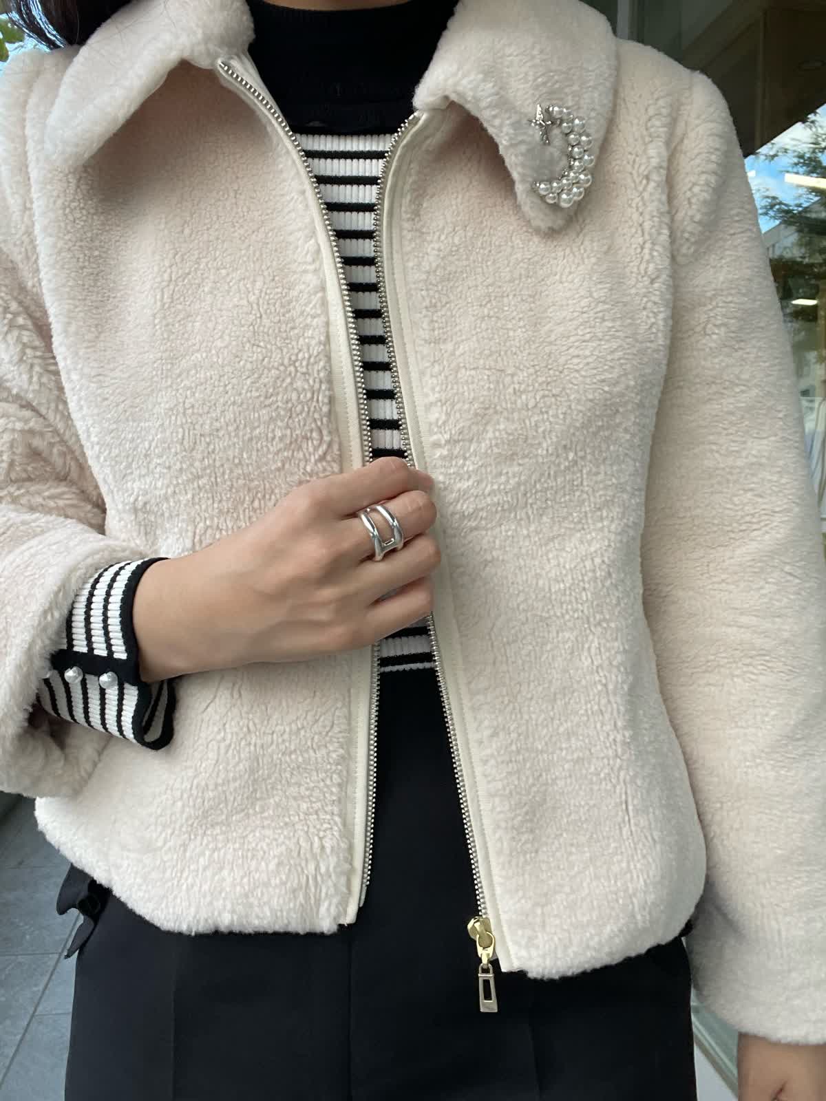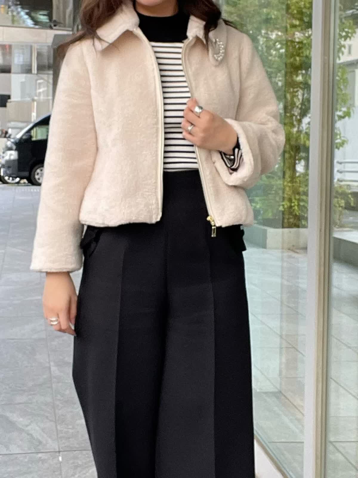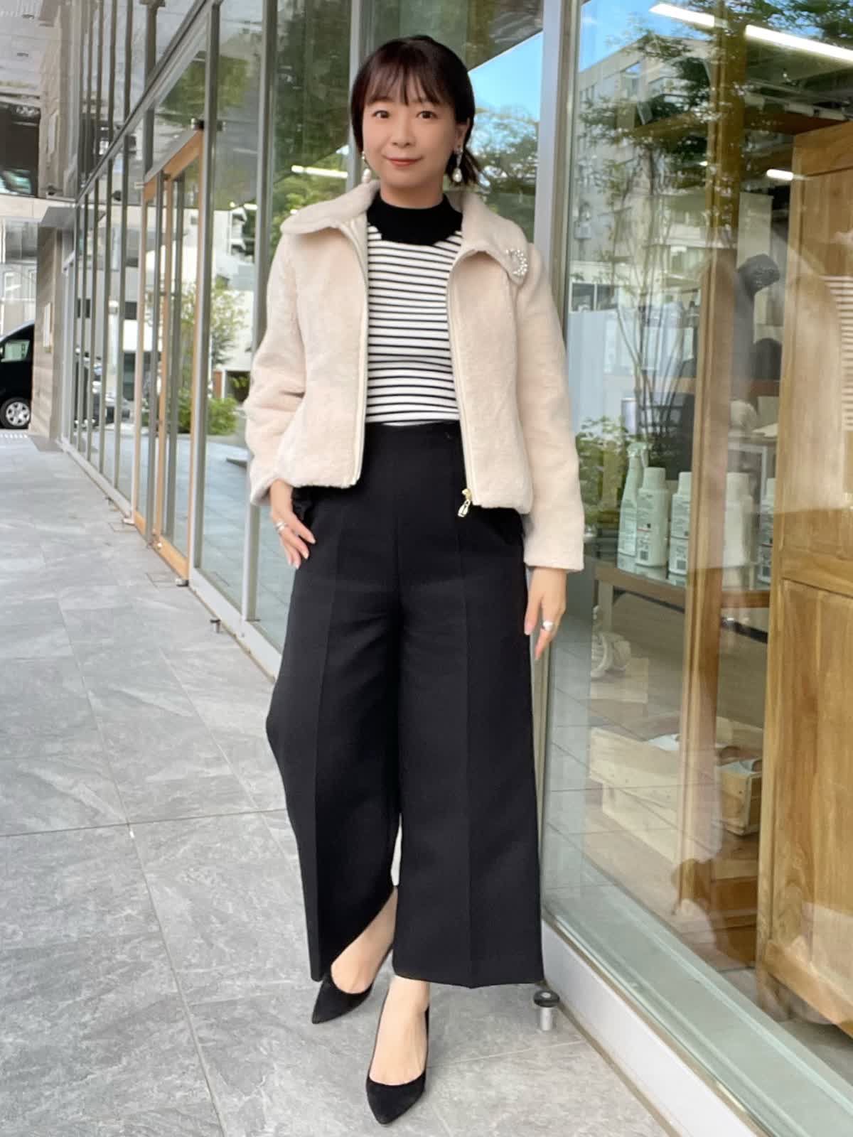 【着用サイズ】全て9号 【着用カラー】ブルゾン:ベージュ ニット:ボーダー パンツ:ブラック 大人ガーリーカジュアルスタイル ふわふわな素材のエコファー素材のブルゾンは驚くほどの軽さと、ふわふわ素材でもコンパクトなデザインですっきり着れる優秀アイテム。ワンピースにはもちろう、パンツ合わせでレディカジュアルスタイルの完成です。