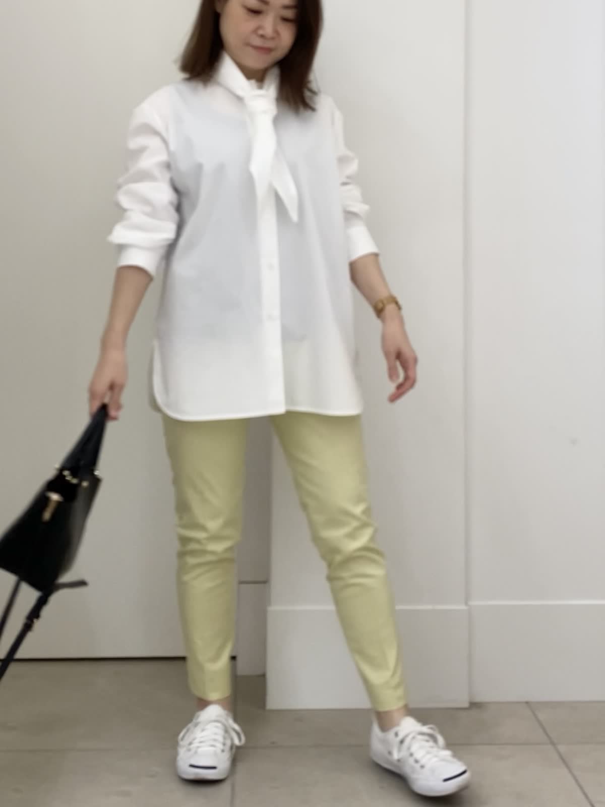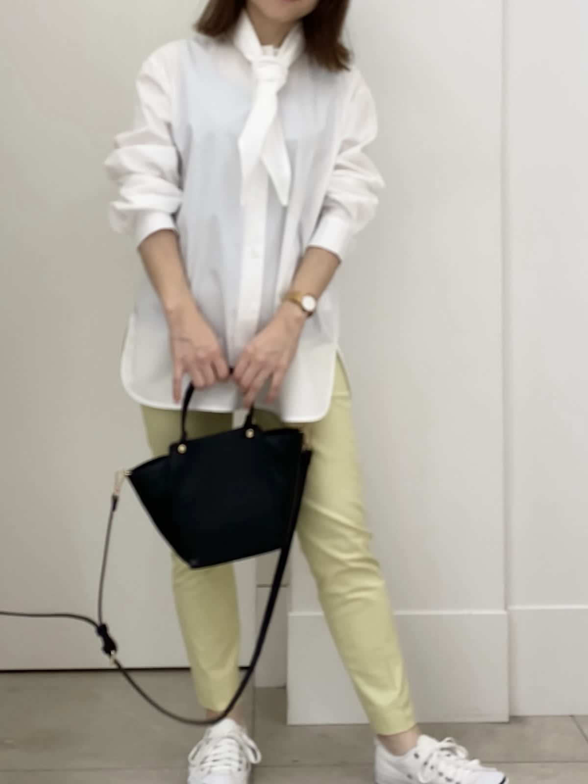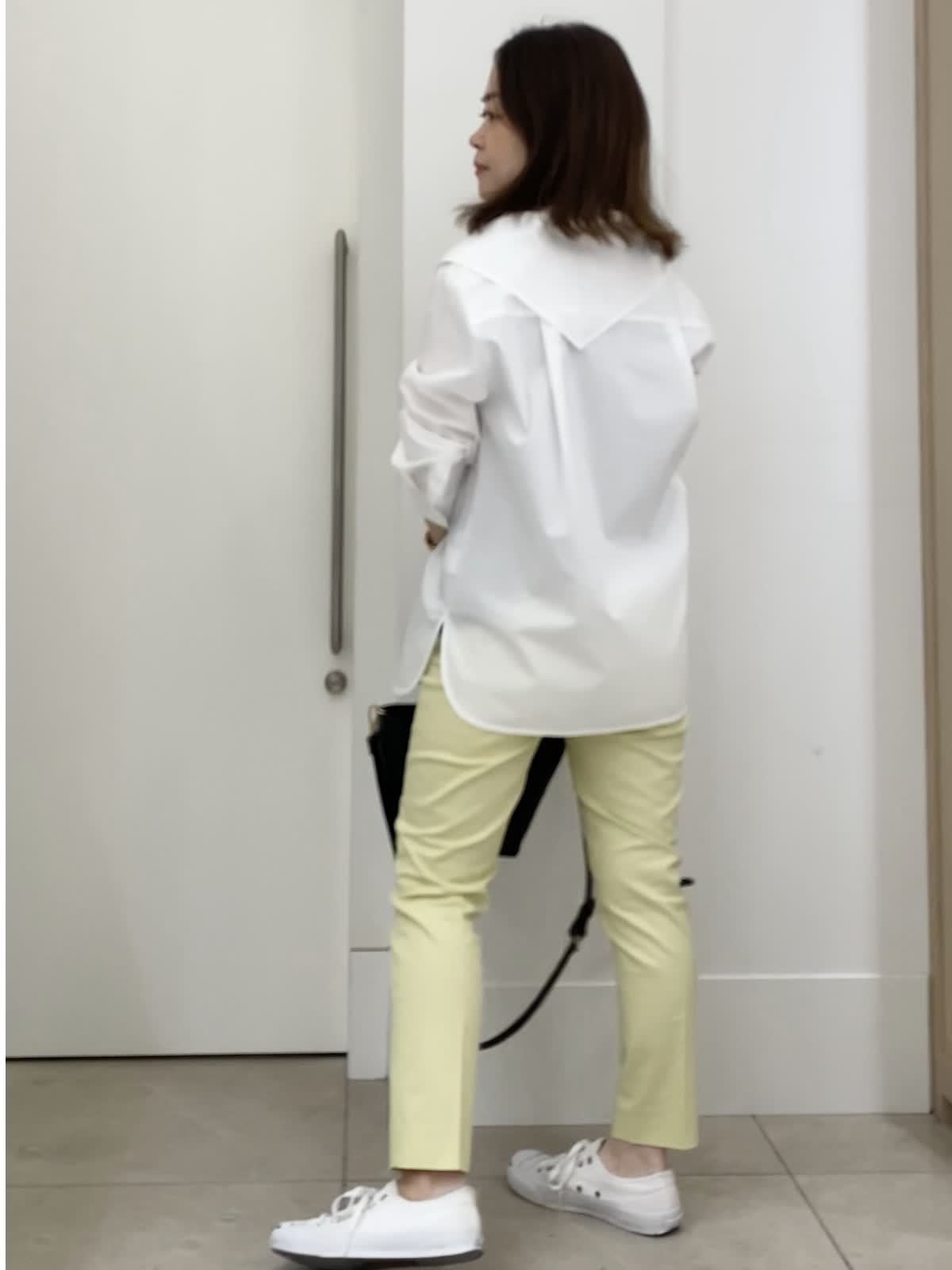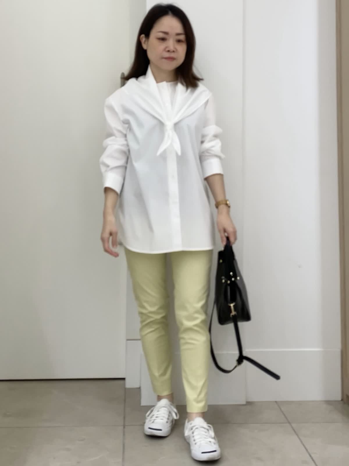 【着用サイズ/カラー】ブラウス:9号/ホワイト パンツ:5号/イエロー 小柄さん向けパンツコーデ イッツの定番パンツは5号サイズからあるので、小柄さんにもオススメ!普段パンツは敬遠しがちですが、イッツの5号サイズなら着丈もピッタリ。ふくらはぎの周りが細めなので、シルエットもすっきり。普段のサイズ感で選んで大丈夫ですが、ピッタリ見えるのが苦手な方はワンサイズUPしても。