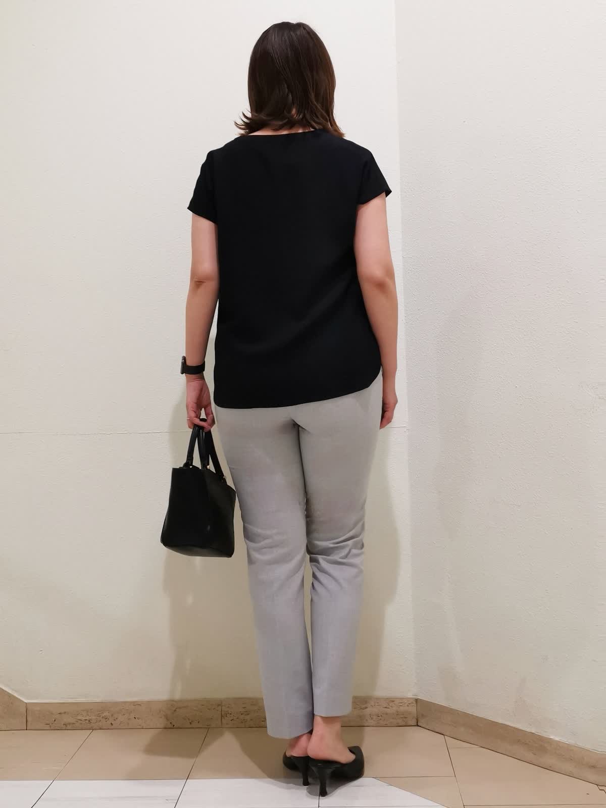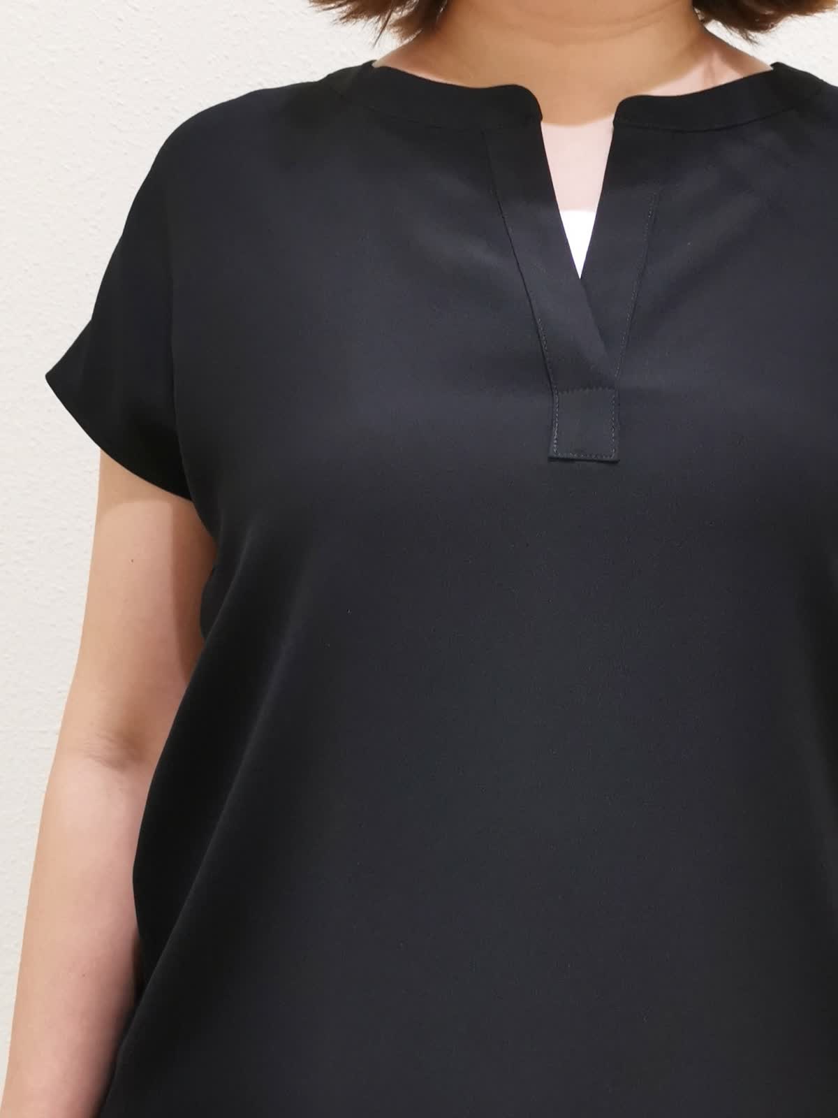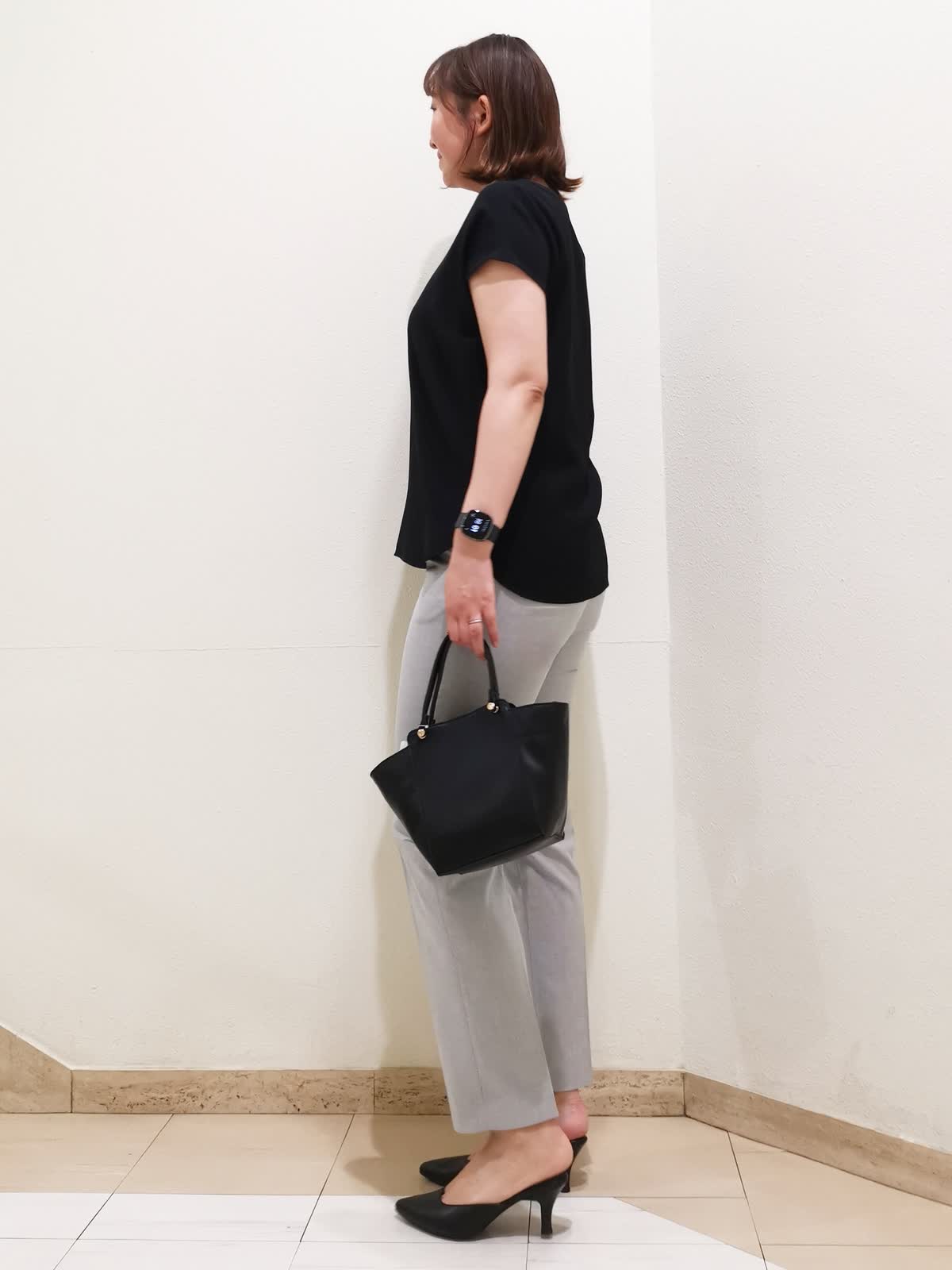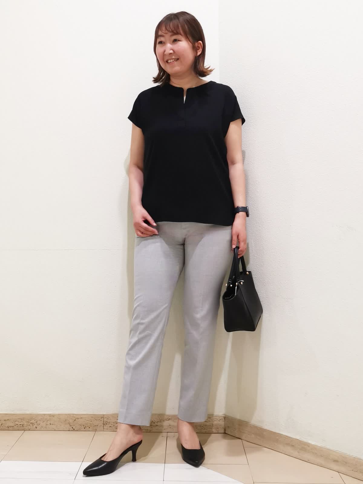 【着用サイズ】ブラウス:フリー タンクトップ、パンツ:11号【着用カラー】ブラウス:ブラック タンクトップ、パンツ:グレー 通勤コーディネートです。きちんと感のある素材のブラウスは、1枚でもジャケットのインナーとしても着やすいデザイン。襟元はスキッパーなので、サテンのタンクトップを合わせれば、顔映りを明るく見せてくれます。パンツはシーズンレスで履ける素材で、シワになりにくく洗えるのでデイリー使いにピッタリです。身長166cmの私が履いて、くるぶしにかかる位の丈です。