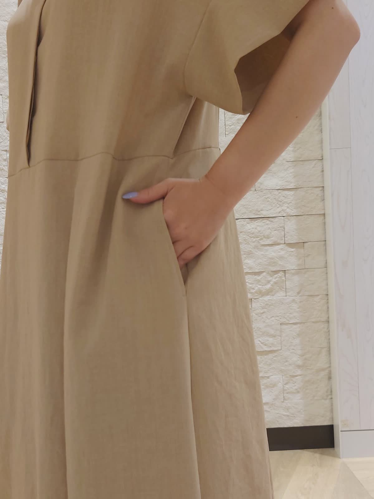 【着用カラー/サイズ】ワンピース:ベージュ/フリー カーディガン:ダークブラウン/フリー バッグ:ブラック シワになりにくい麻調のワンピースは夏のおでかけにぴったり。 肌離れも良く涼しくお召しいただけます。 画像のようにカーディガン合わせもオススメですが、長めの袖丈で1枚でも着ていただきやすいです。
