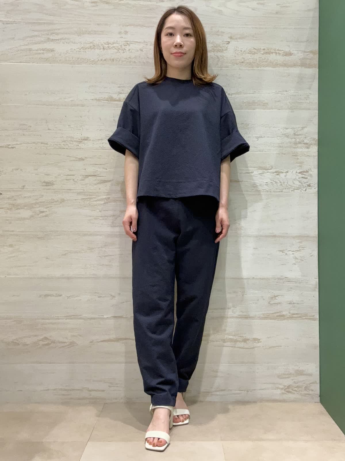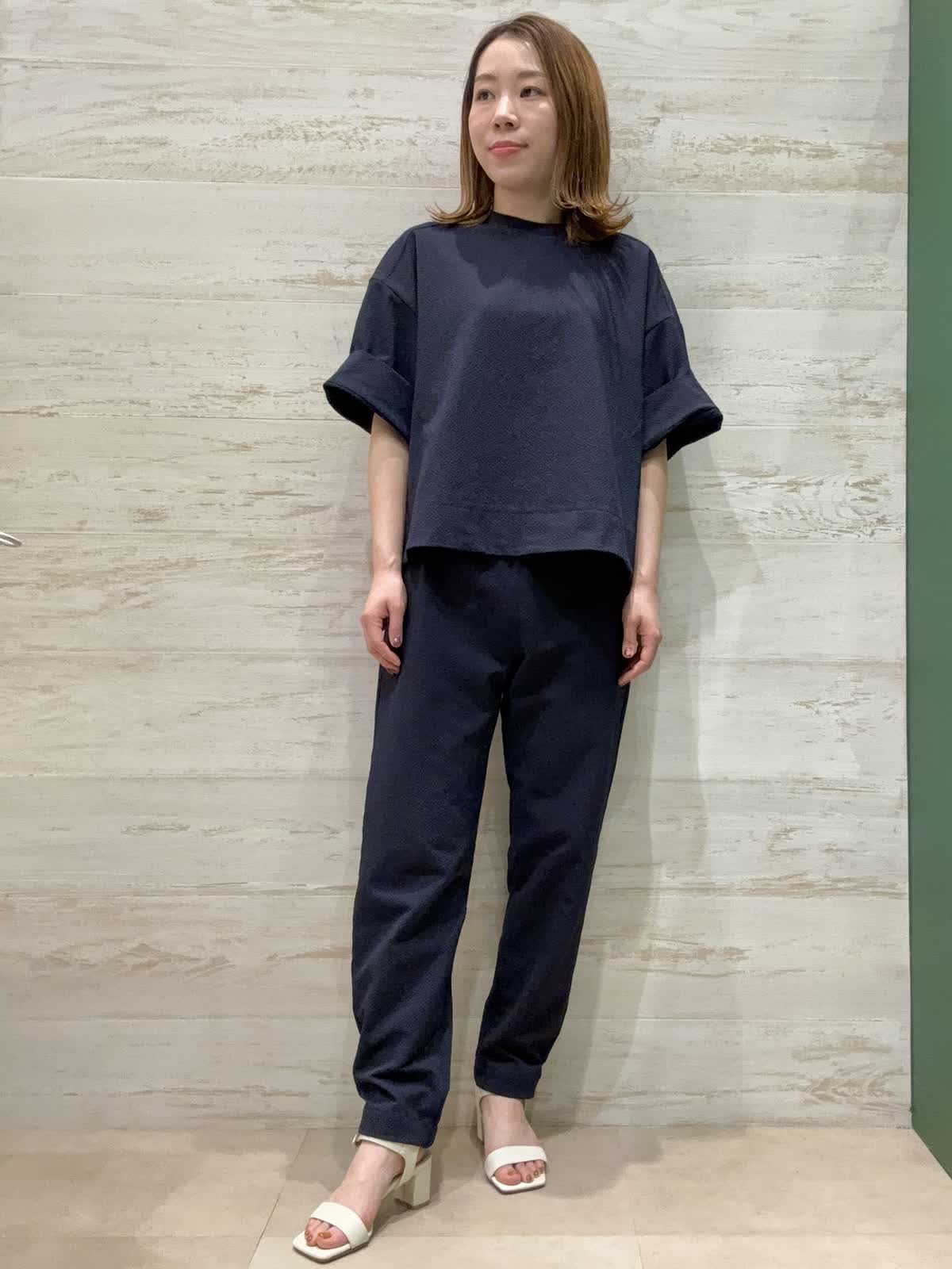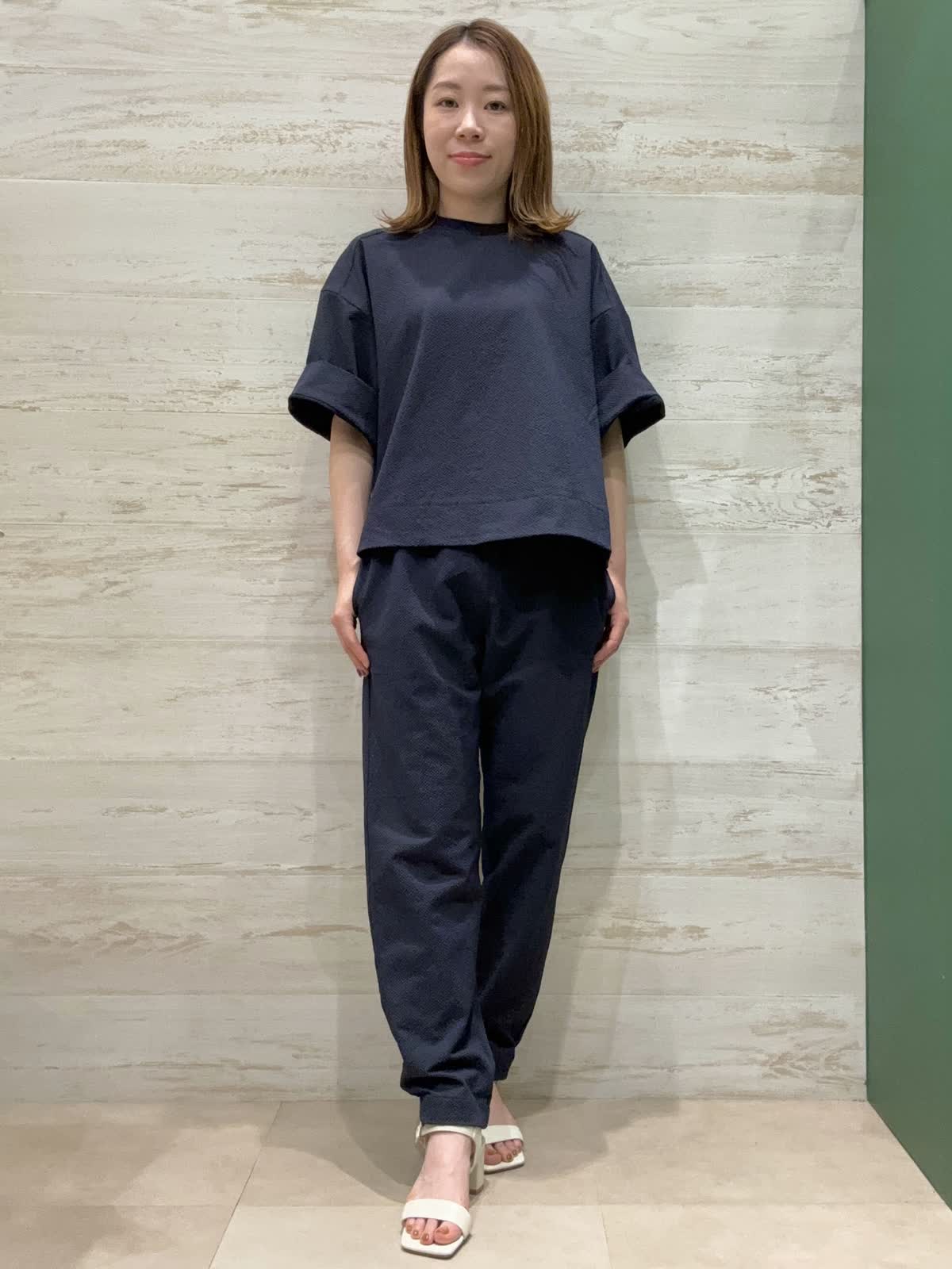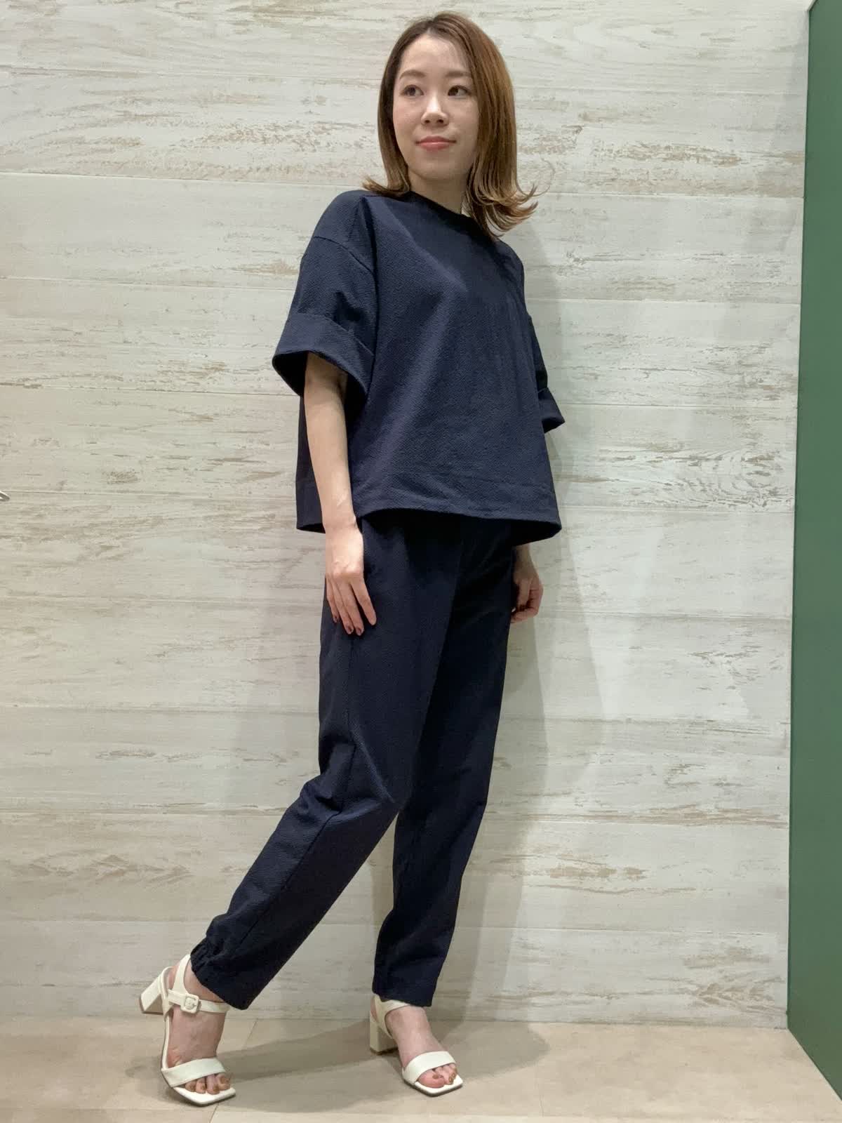 【着用カラー】カットソー:ネイビー パンツ:ネイビー 【着用サイズ】カットソー:フリー パン ツ:9号 サッカー素材の凹凸感が肌に張り付かずとても涼しく着ていただくことができます。お袖も肘まで隠れるので安心丈になっています。 パンツはウエストゴムで楽ちんで幅感も太すぎずスッキリと履けるのでジョグパンツ初心者の方でも合わせやすいです。