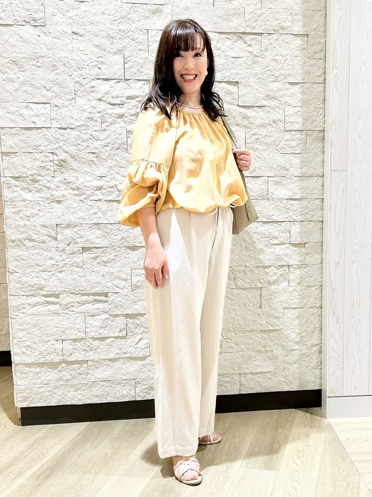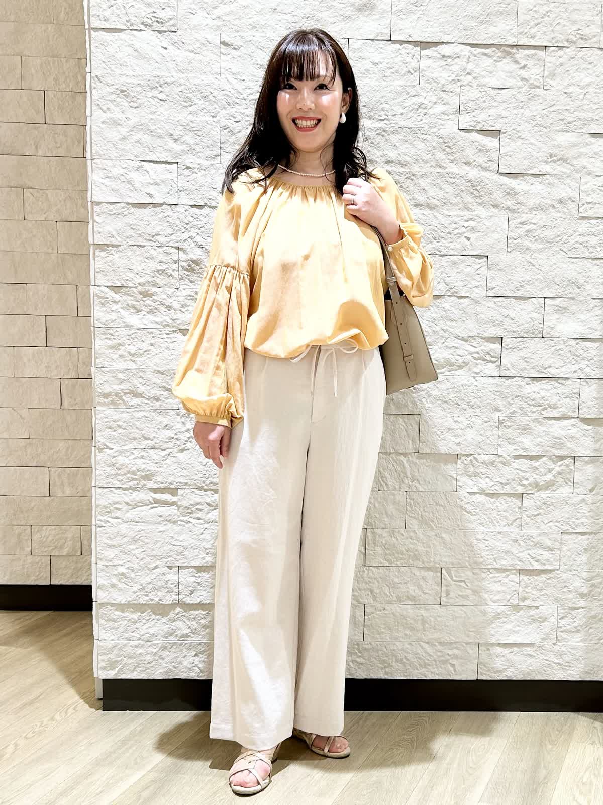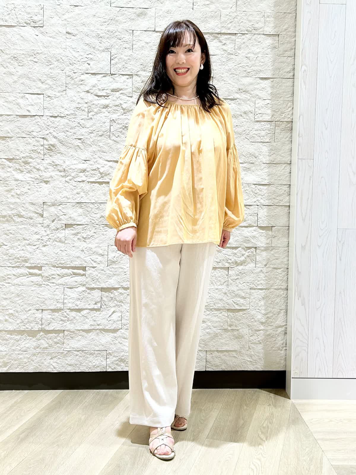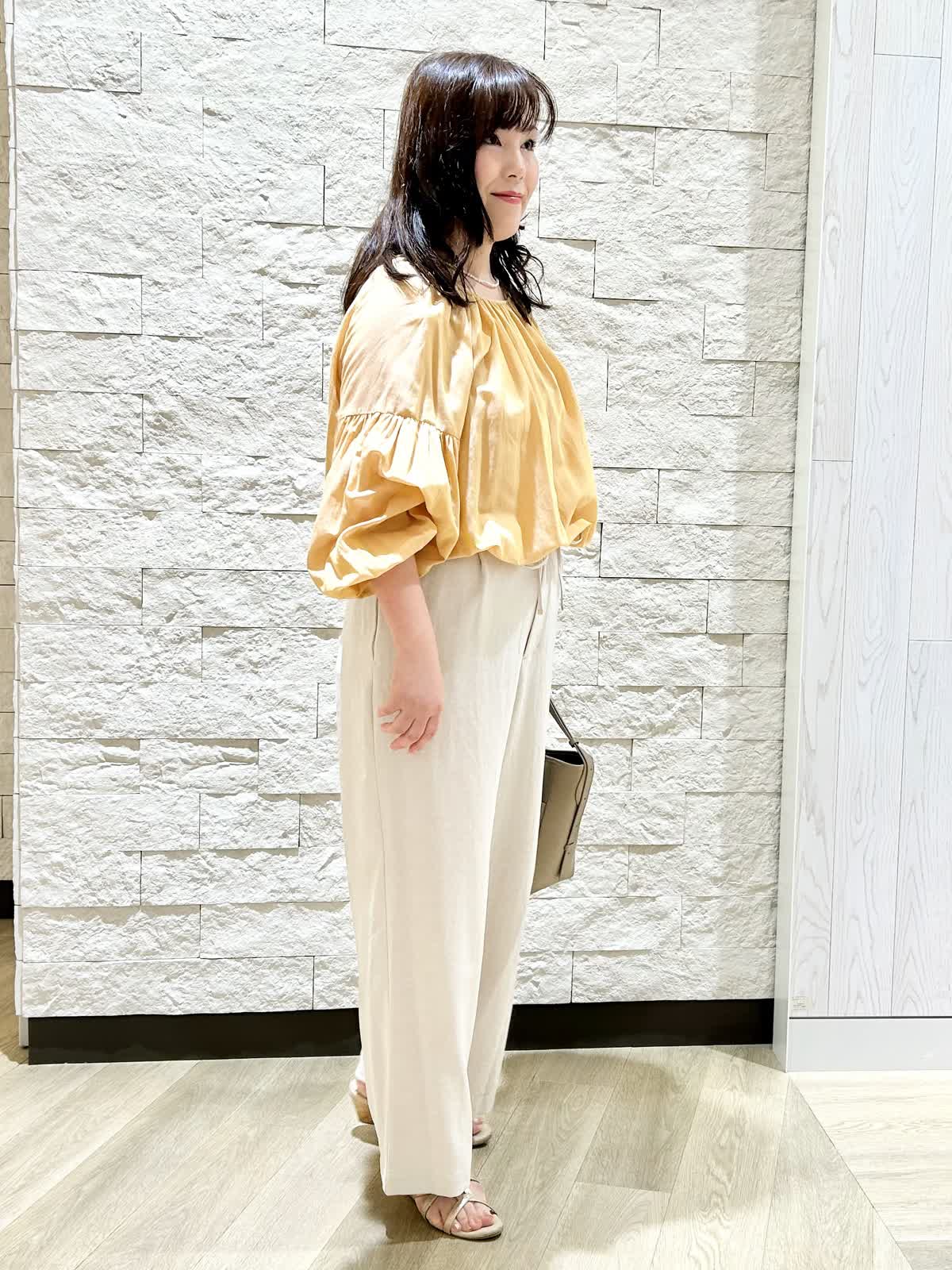 【着用カラー.サイズ】 アイテム:ブラウス カラー:イエロー サイズ:フリー アイテム:パンツ カラー:ベージュ サイズ:11号 ブラウスは長袖ですがとても薄くて軽い素材で涼しいです。パンツも薄くてサラッとしています。夏におすすめの素材で、自宅で手洗いできますしノーアイロンで大丈夫です。