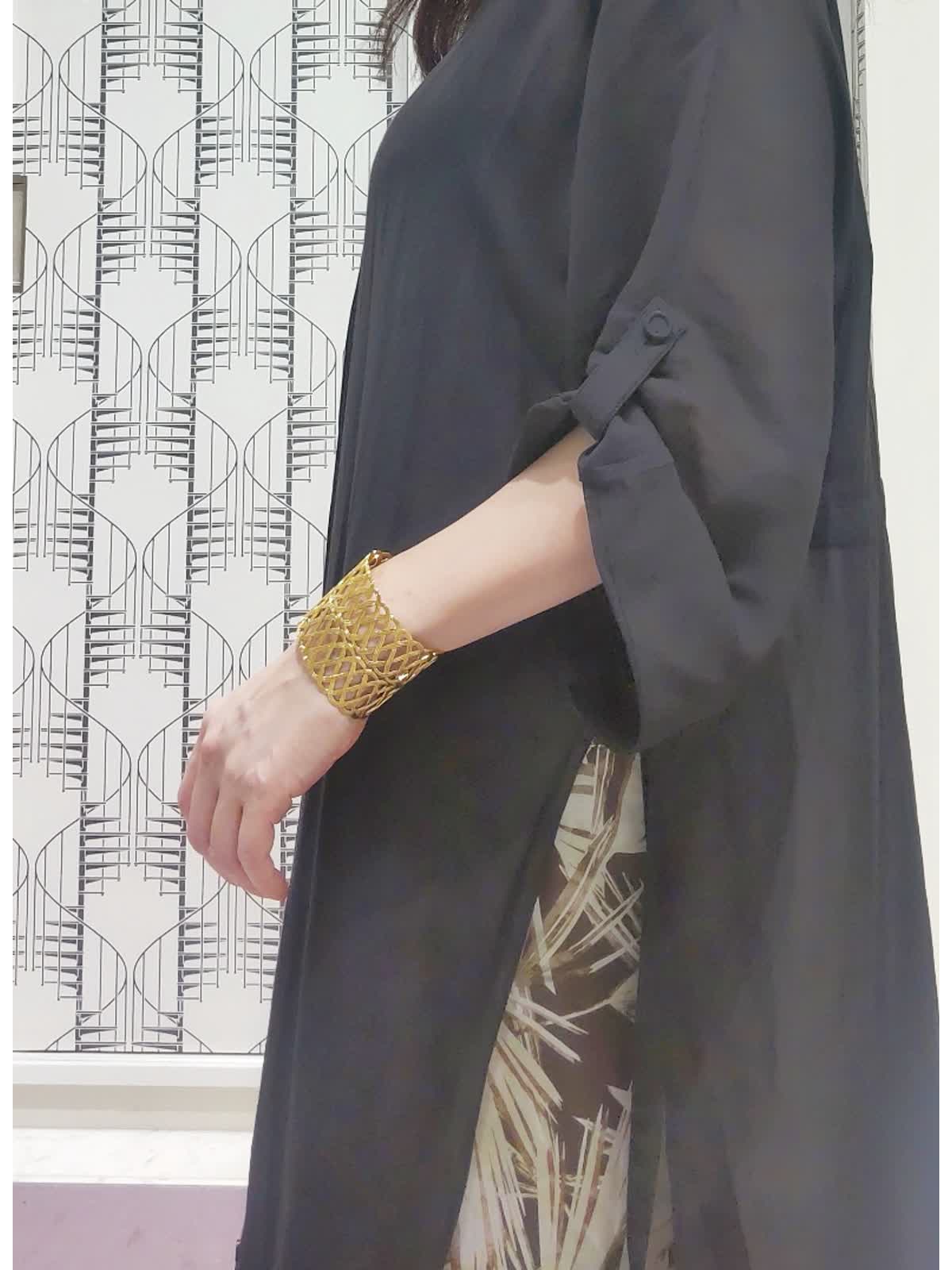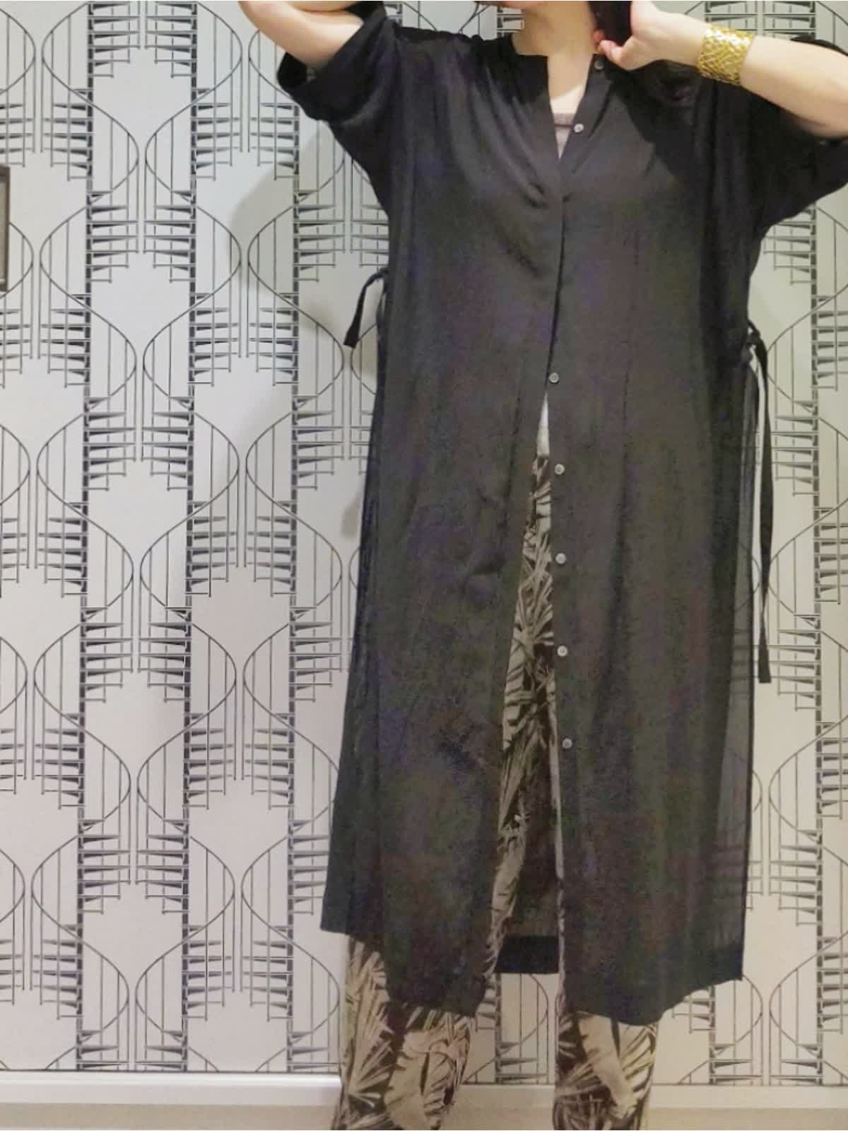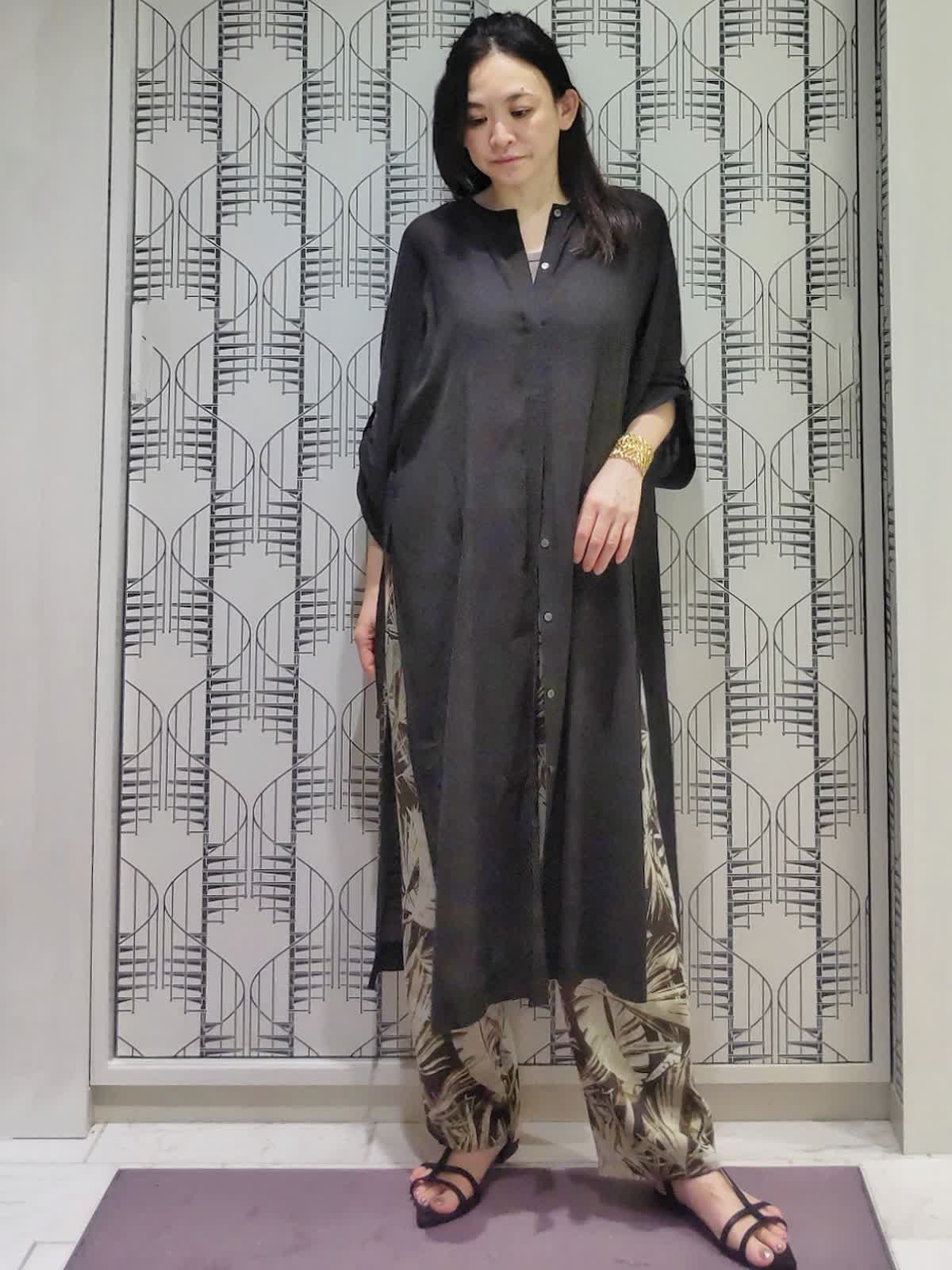 夏らしいボタニカルプリントパンツにシャツワンピースを羽織った、リゾートにもピッタリな大人カジュアルスタイリング。