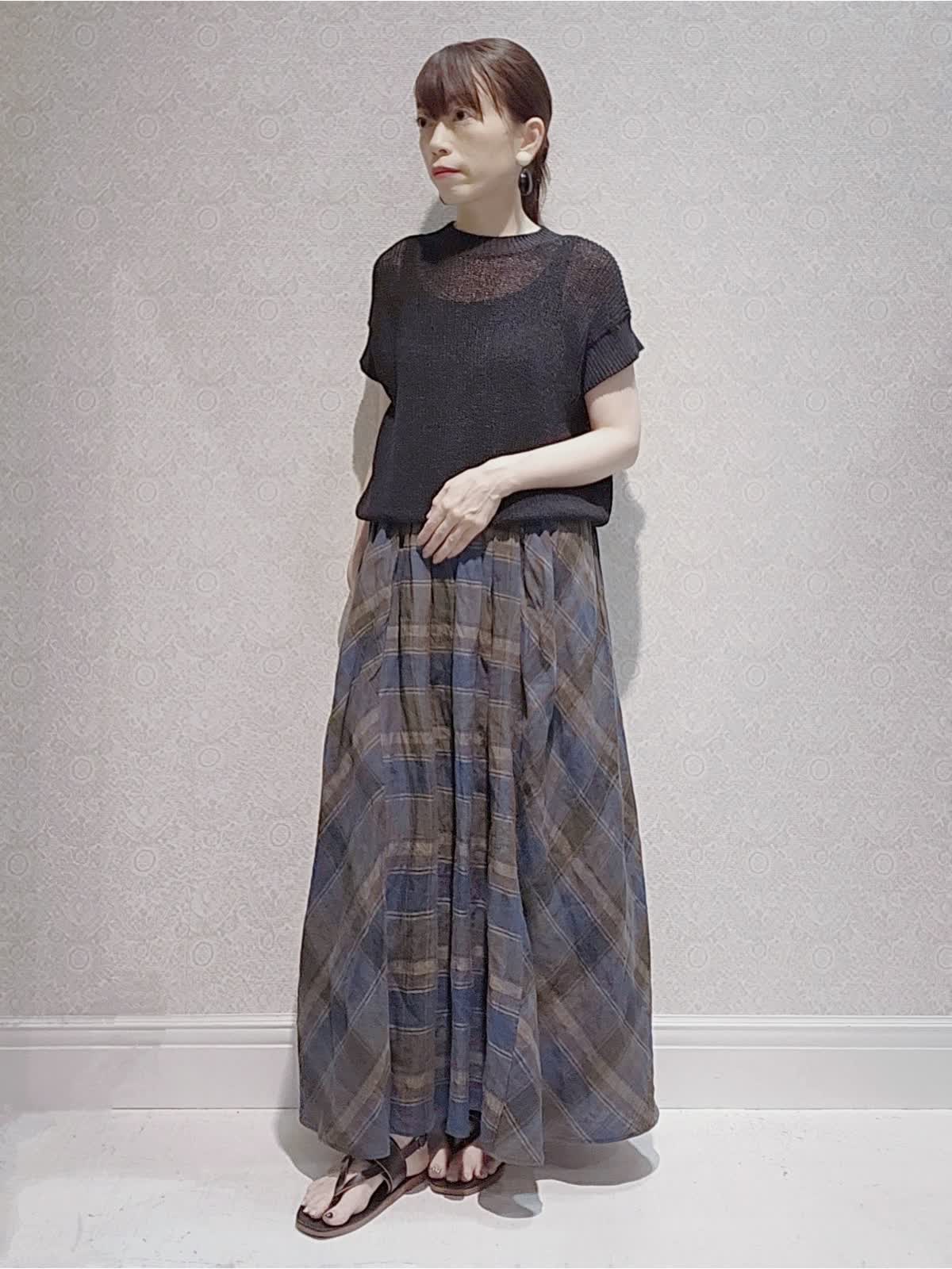 【着用サイズ】ニット:9号 スカート:9号 【着用カラー】 カットソー: ブラック スカート:ネイビー 和紙を仕様したシアー感のあるニットはとても軽い着心地。 コンパクトな丈感ですっきり着て頂け、スカートやパンツの素材やデザインでオンオフ両方のスタイルを楽しんで頂けます。