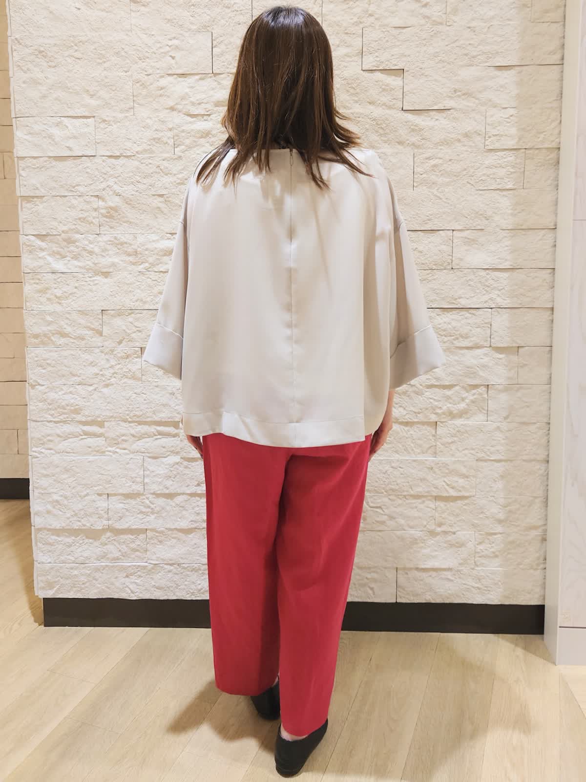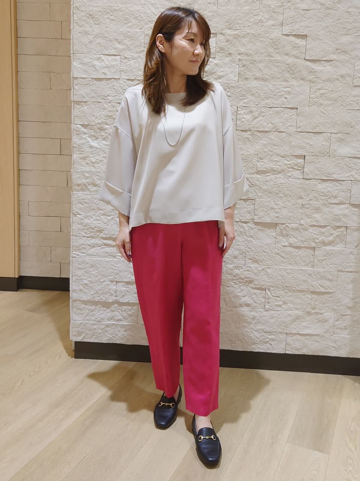 【着用カラー/サイズ】ブラウス:ベージュ/フリー パンツ:チェリーピンク/9号 ネックレス:シルバー/フリー 柔らかい素材のブラウスはパンツ合わせで通勤に、スカート合わせでお出かけにと自由自在な万能アイテム。パンツはワンサイズですがウエストゴムでどなたでも穿きやすいデザインです。