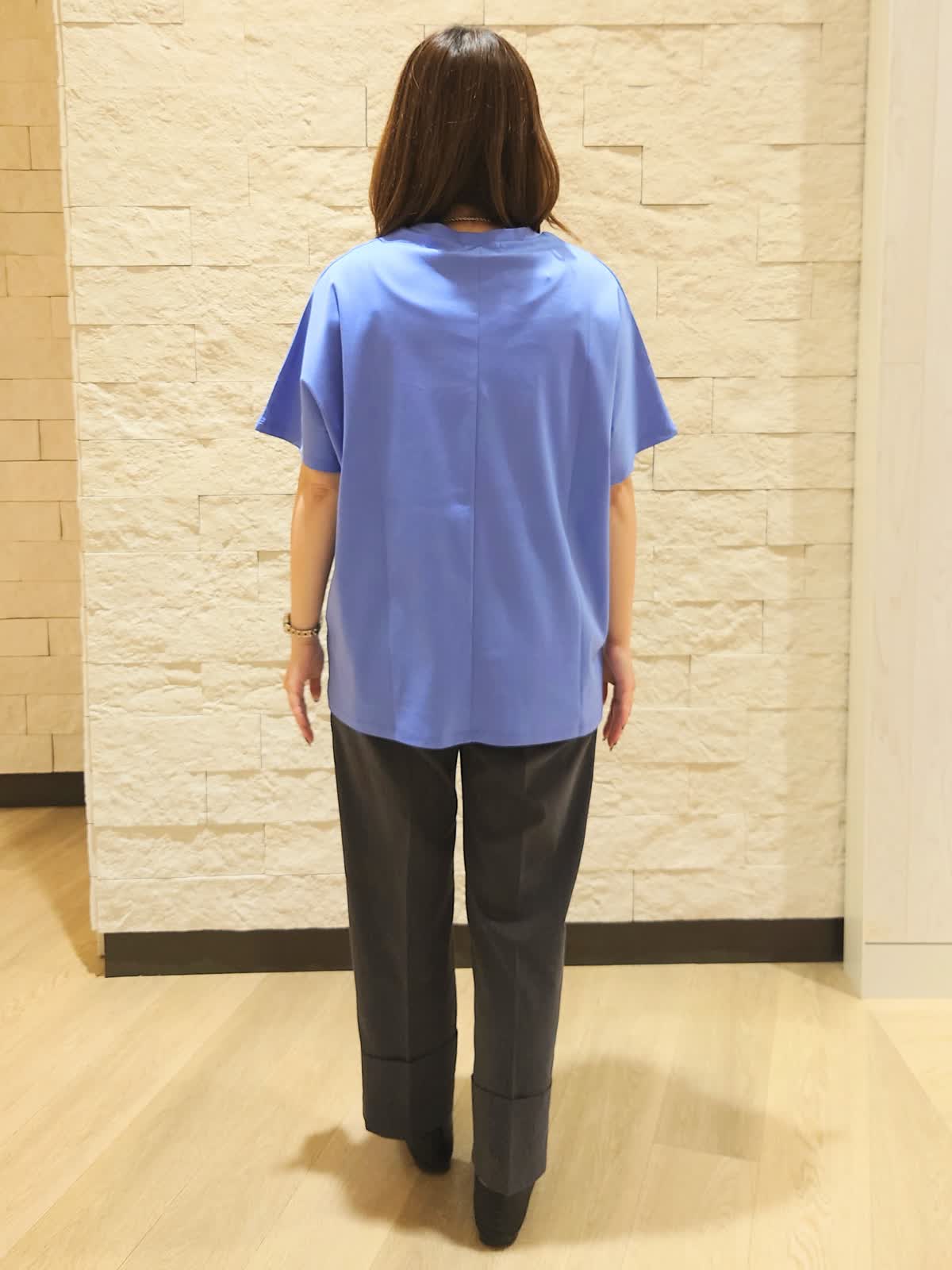 【着用カラー/サイズ】カットソー:ブルー/フリー パンツ:インディゴ/9号 接触冷感のカットソーとサラッとした素材のパンツは休日のコーディネートにぴったり。パンツは普段7号ですが、ワンサイズ上げて少しゆったりと合わせました。すっきり穿くのがお好きな方はジャストサイズがおすすめです。