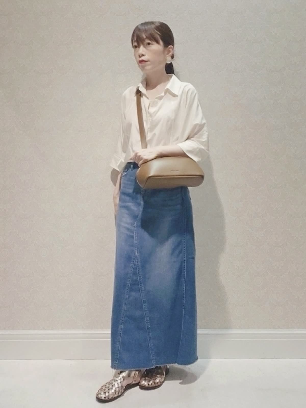 【着用サイズ】ブラウス:9号 スカート:5号 【着用カラー】 ブラウス:オフホワイト スカート:インディゴ キュプラ混のブラウスはさらっとした着心地、光沢感がありオンオフ両方のスタイリングで着まわしして頂けます。 伸縮性のあるデニムスカートは裾に向けフレアラインで足さばきしやすく、とても柔らかい履き心地です。