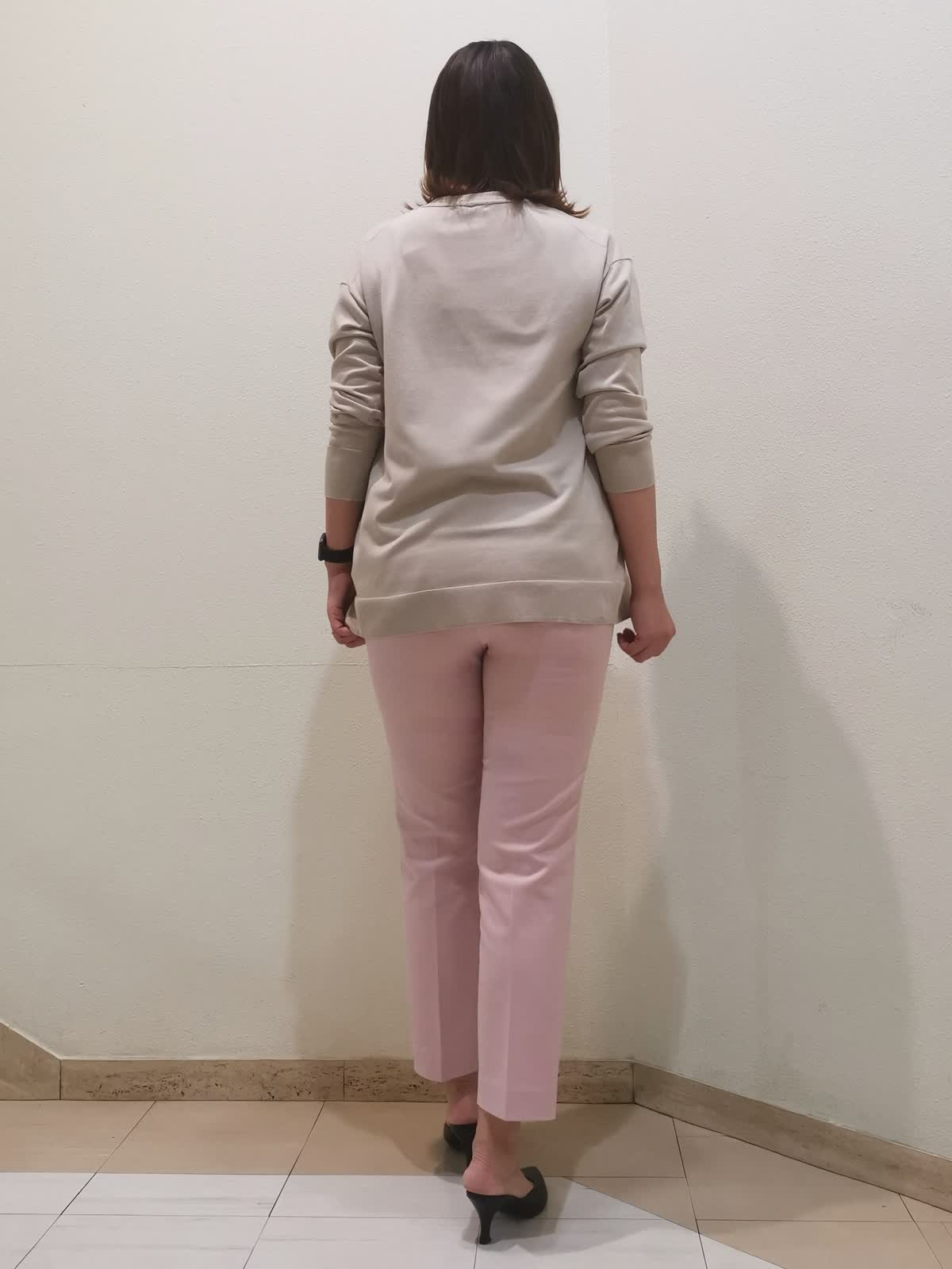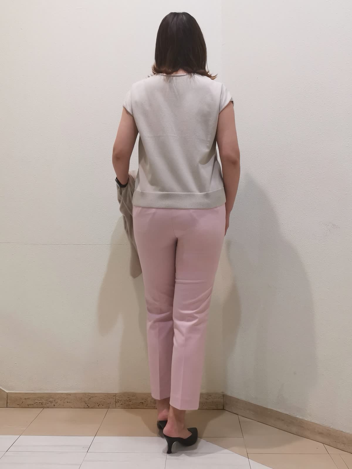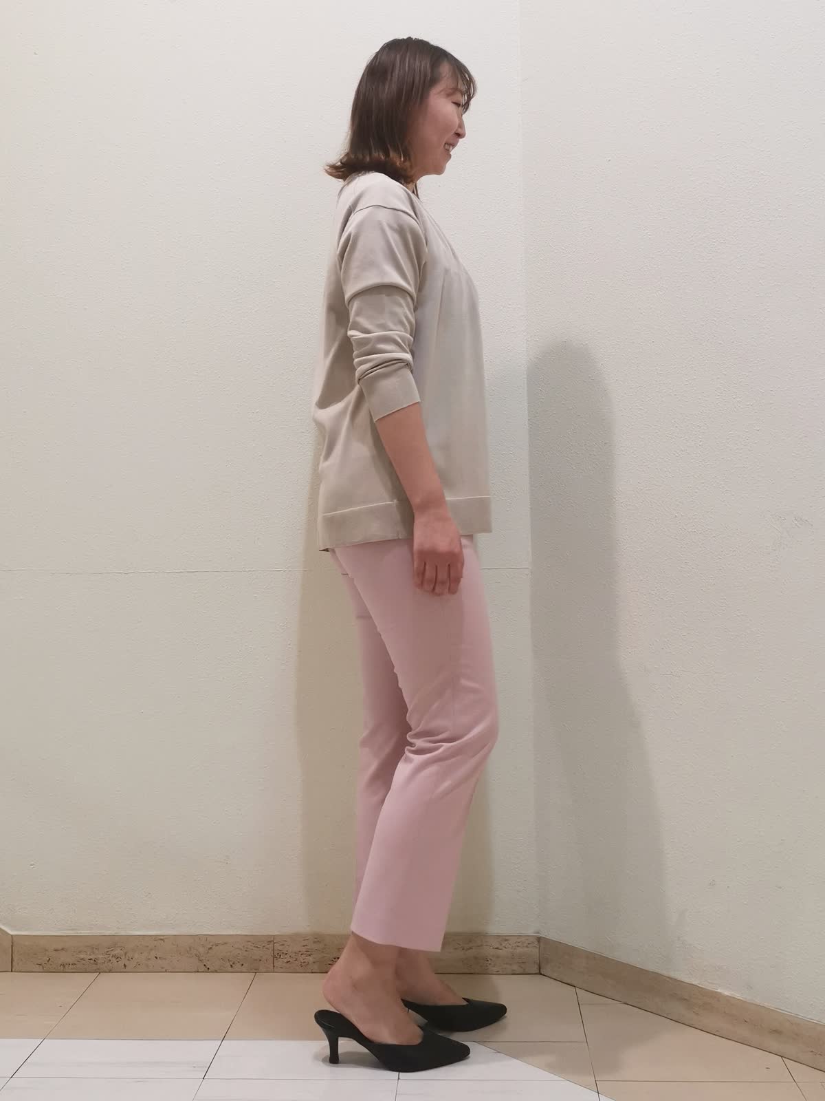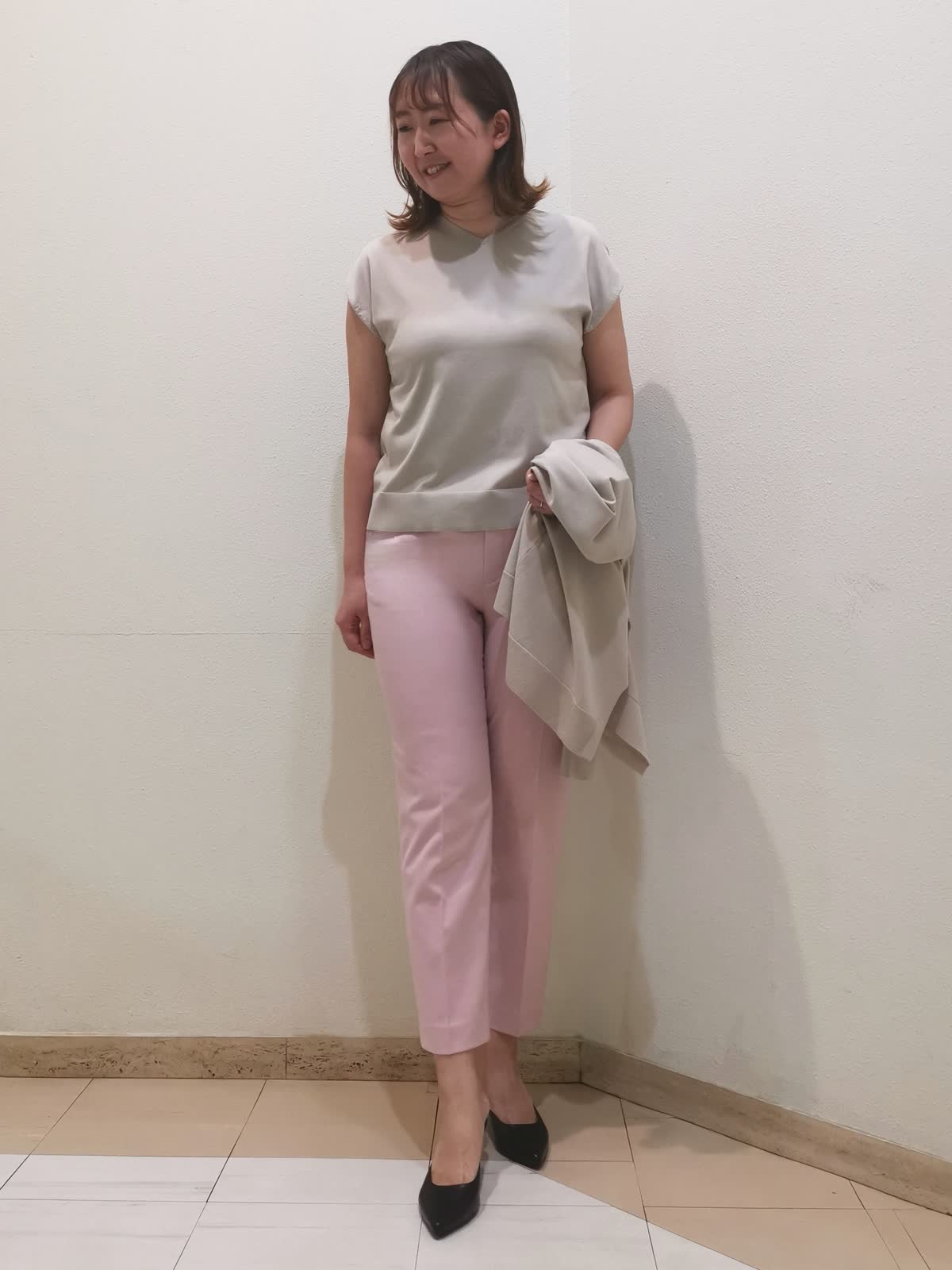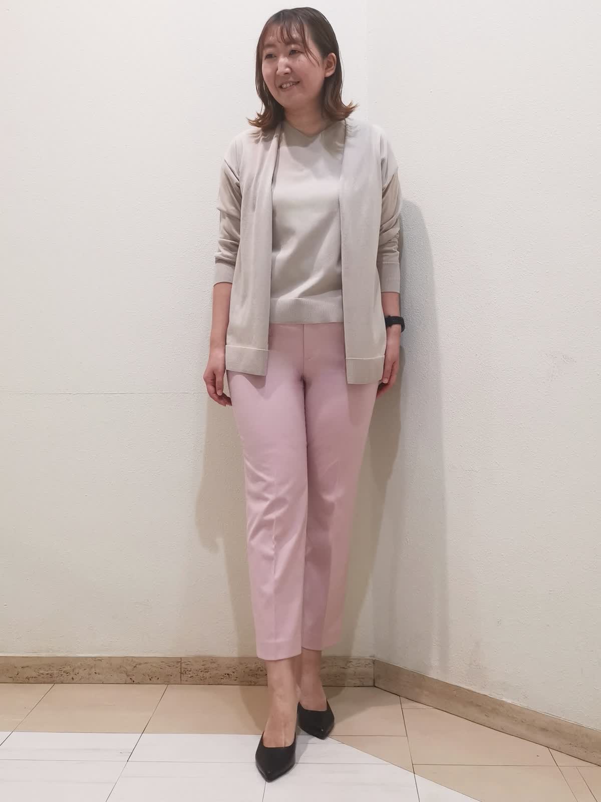 【着用サイズ】ニット、カーディガン:フリー パンツ:11号【着用カラー】ニット、カーディガン:ベージュ パンツ:ピンク オフィスカジュアルスタイルです。アンサンブルニットは、季節の変わり目に重宝する万能アイテム。別々にも着られるので、1セットあると着回ししやすいです。カーディガンはロング丈でも長すぎないので、スカートやワンピースの羽織りにも使えます。パンツは柔らかく、とても履きやすいです。洗ってもシワができにくく、イージーケアな素材です。