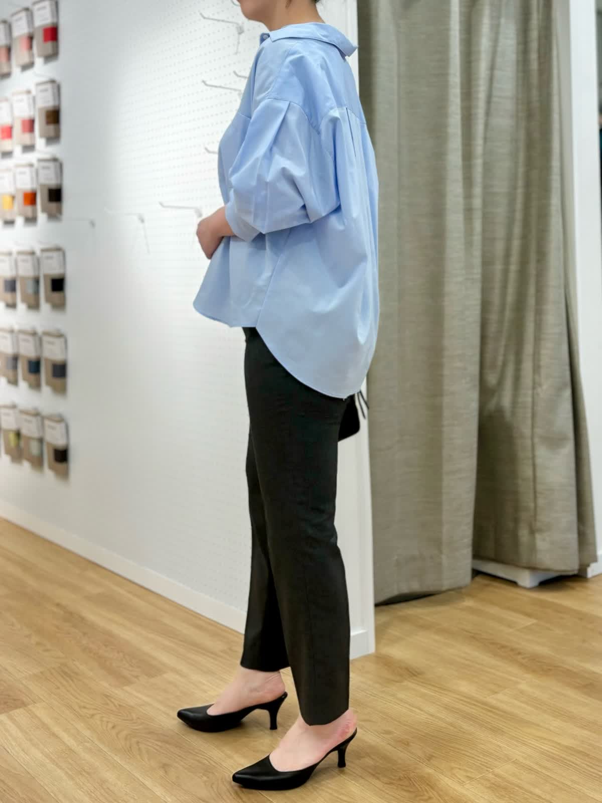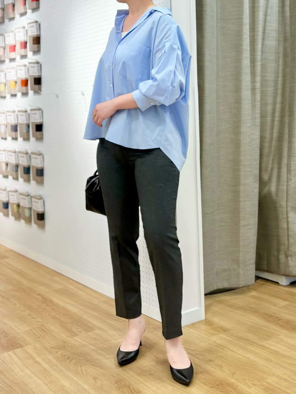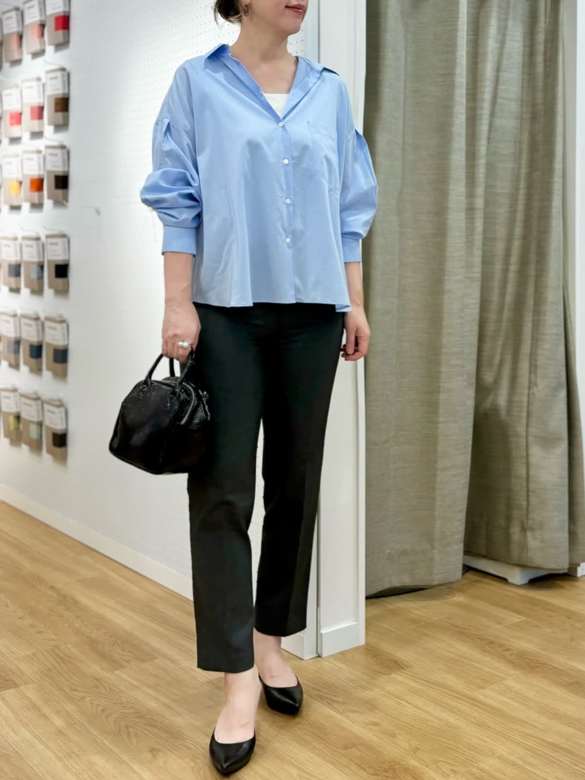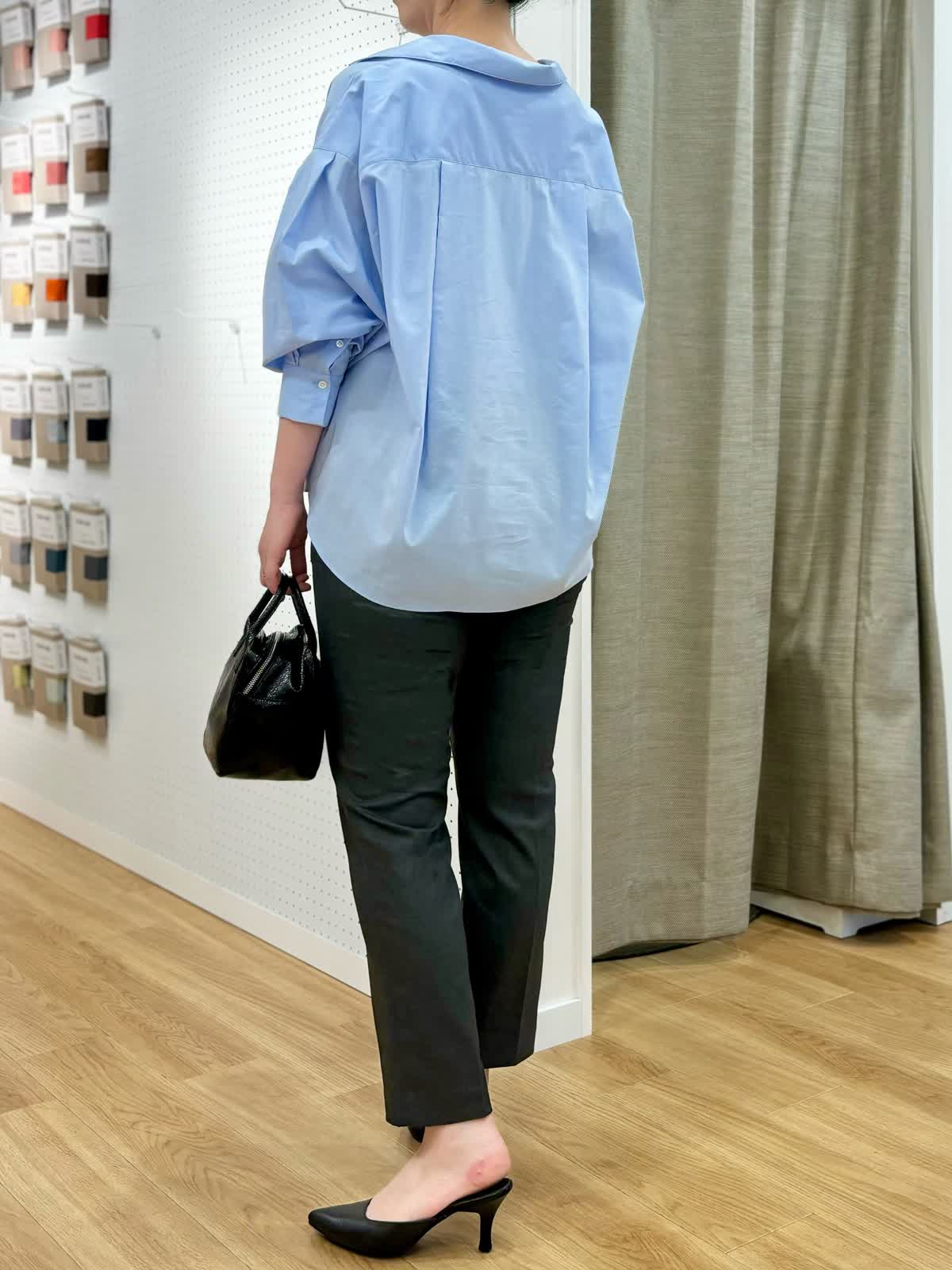 【着用カラー/サイズ】ブラウス:サックス/フリー パンツ:チャコールグレー/11号 タンクトップ:グレー/11号 オフィスカジュアルコーデ。スビン綿を使用したブラウスは とても軽く、微光択な生地が品良くきちんとしたスタイリングにおすすめです。袖口をたくしあげると筒袖部分がふんわりとボリュームが出せて立体感を楽しめます。ストレッチの効いたパンツはイッツの人気定番パンツで毎日の通勤服に役立ちます。