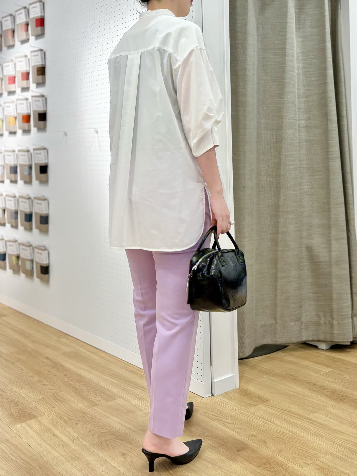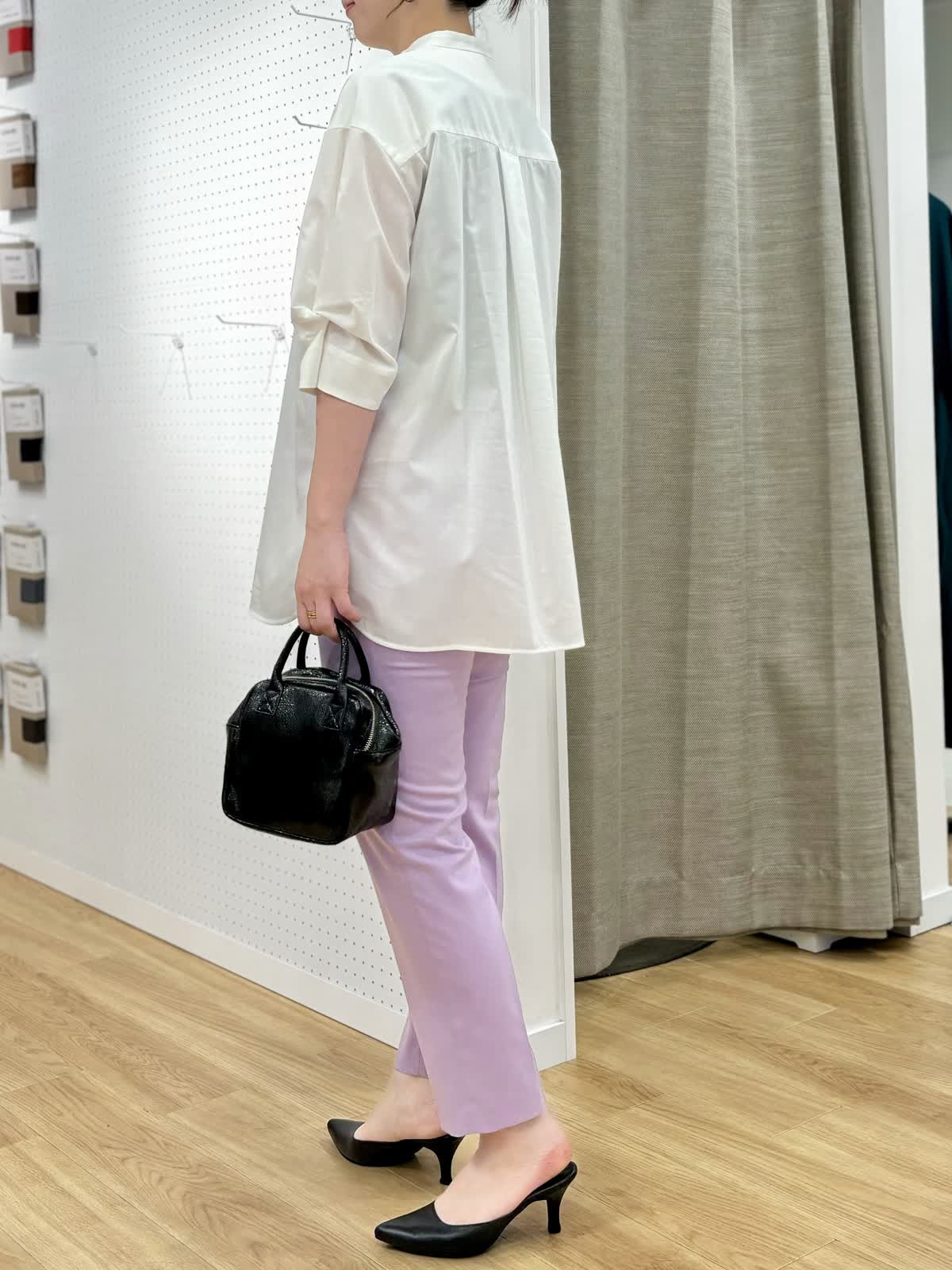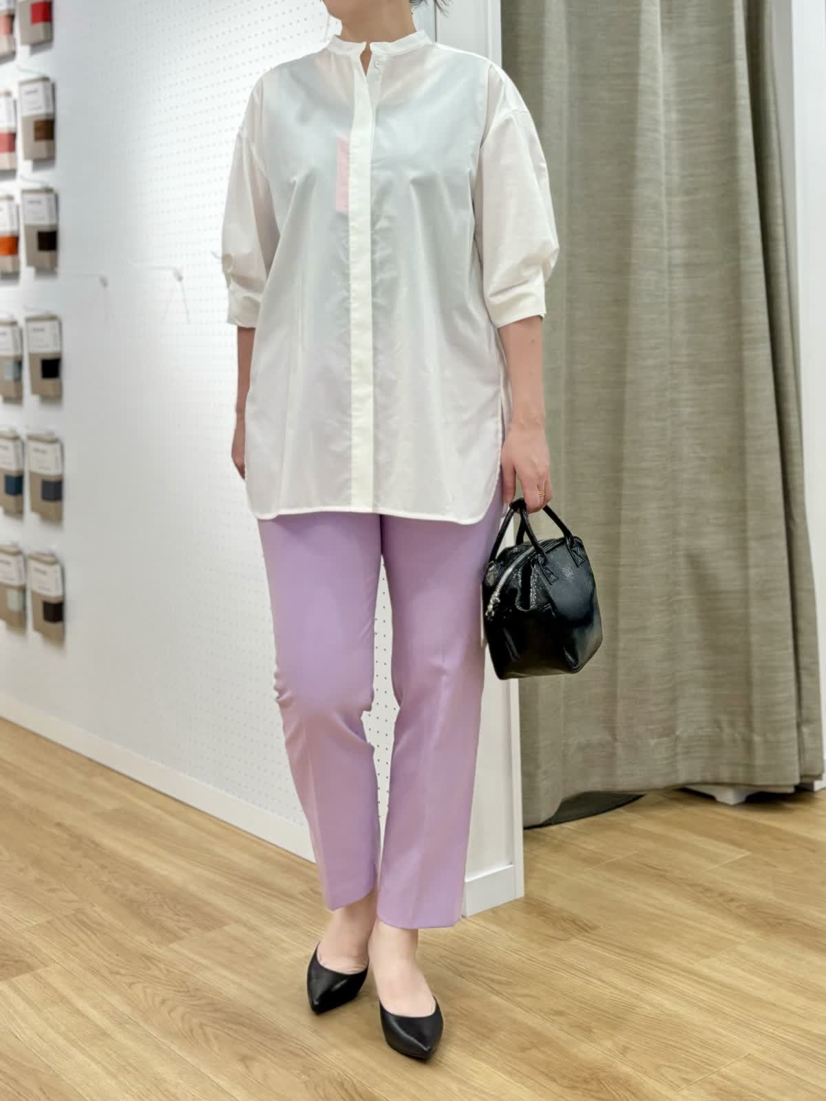 【着用カラー/サイズ】ブラウス:オフホワイト/フリー パンツ:パープル/11号 週始まりの打ち合わせにオフィスコーデ。袖口のツイストが1枚でも着映えるブラウスはスビン綿を使用、とても軽く、微光択な生地が品良くきちんとしたスタイリングにおすすめです。ストレッチの効いたパンツはイッツの人気定番パンツで毎日の通勤服に役立ちます。