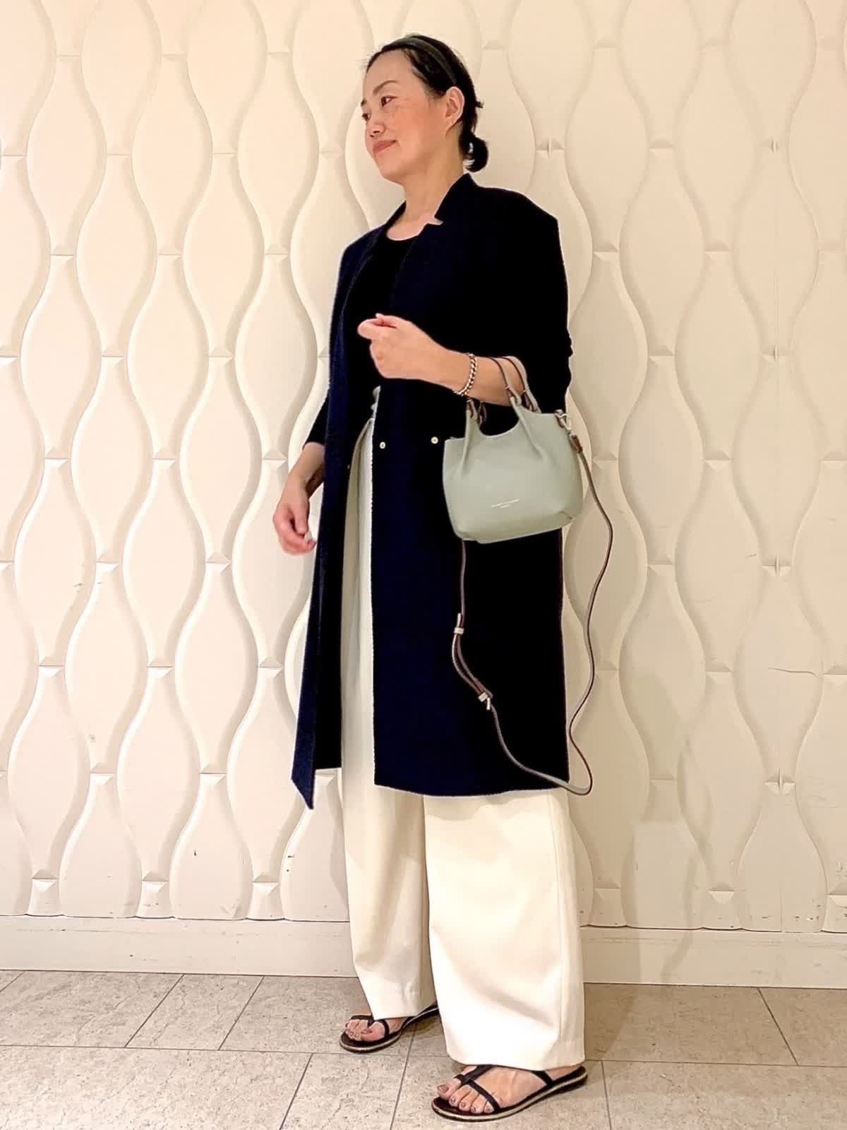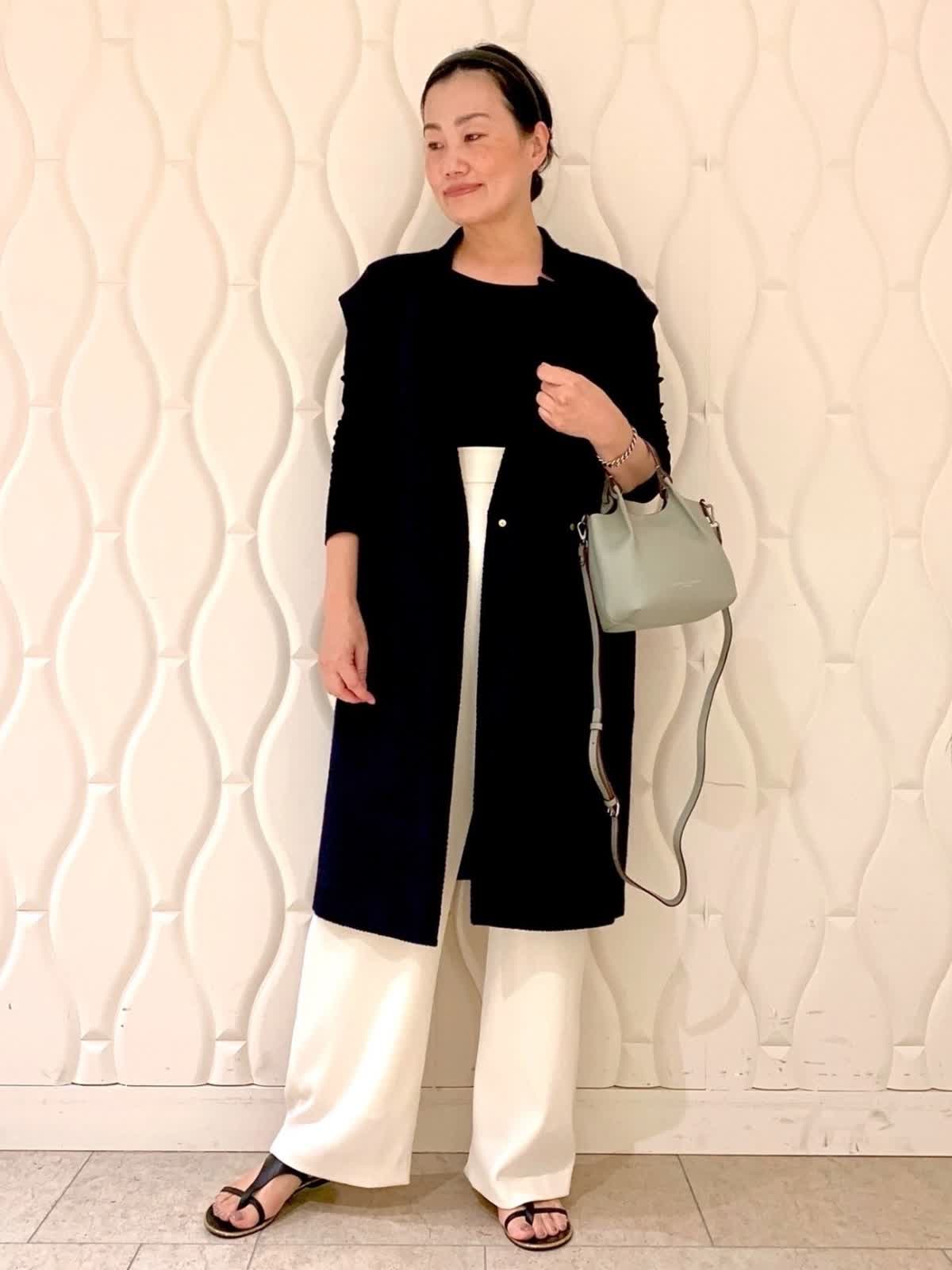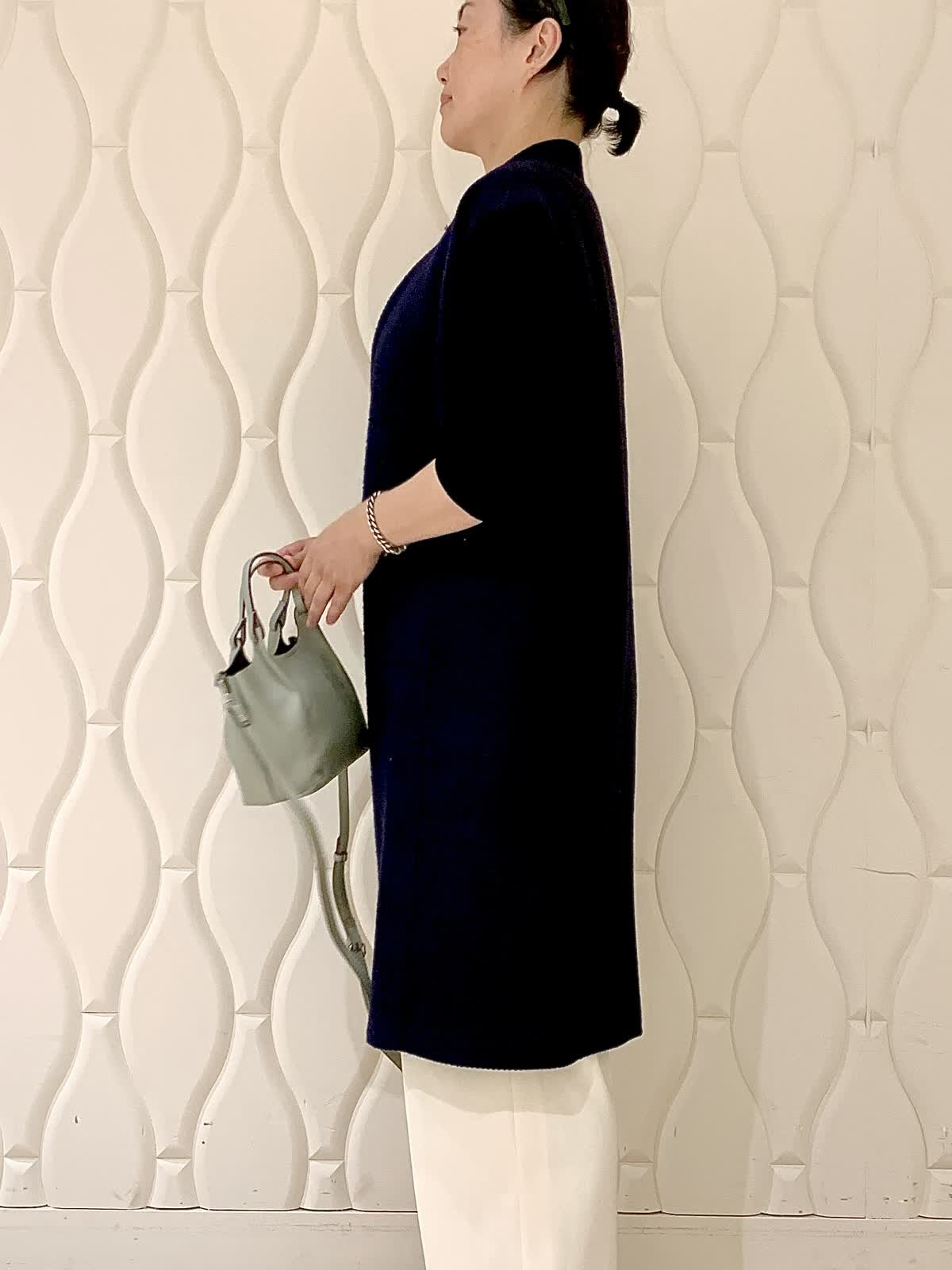 【着用サイズ】ジレ、カットソー:9号 パンツ11号 【着用カラー】ジレ:ネイビー カットソー:ブラック パンツ:オフホワイト バッグ:グレー 襟ぐりの刻みカッティングがありそうで無いデザインのジレはさらっと羽織るだけでオシャレ度アップ。素材は柔らかなツイード、重さもさほど気になりません。脚長効果絶大なラップパンツは着ジワも気にならずほぼ通年で愛用できる1本です。