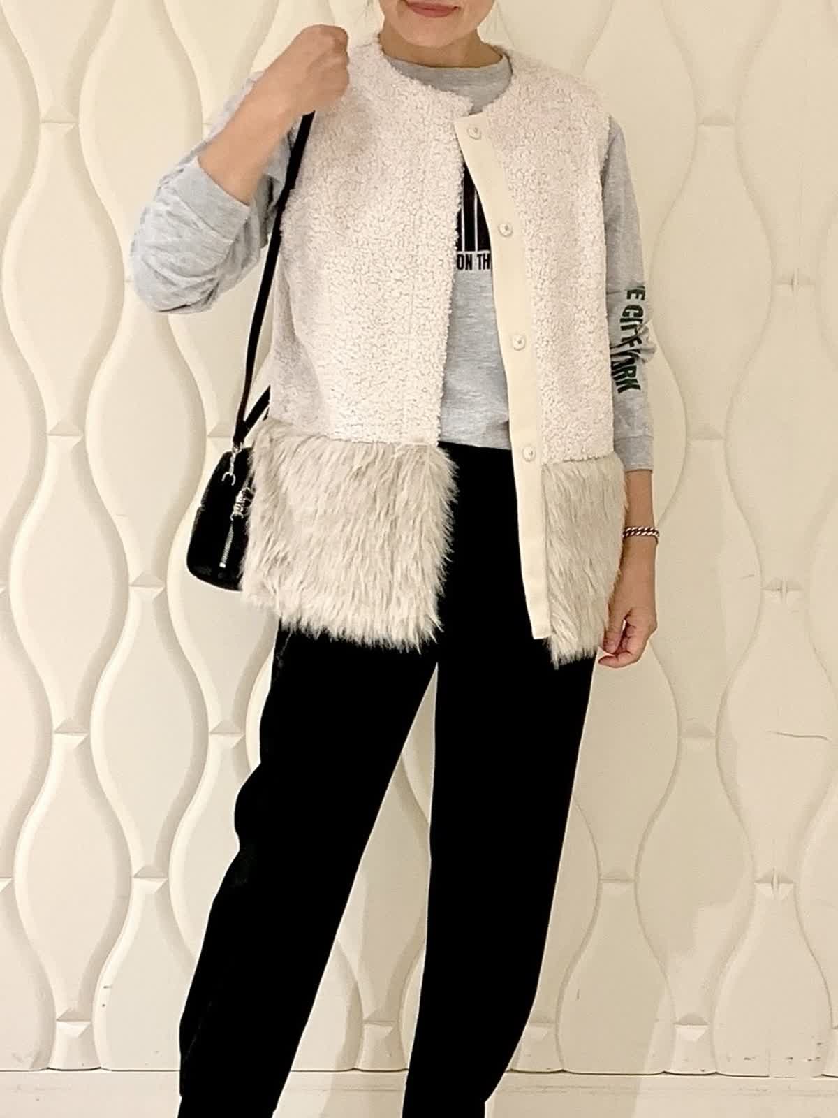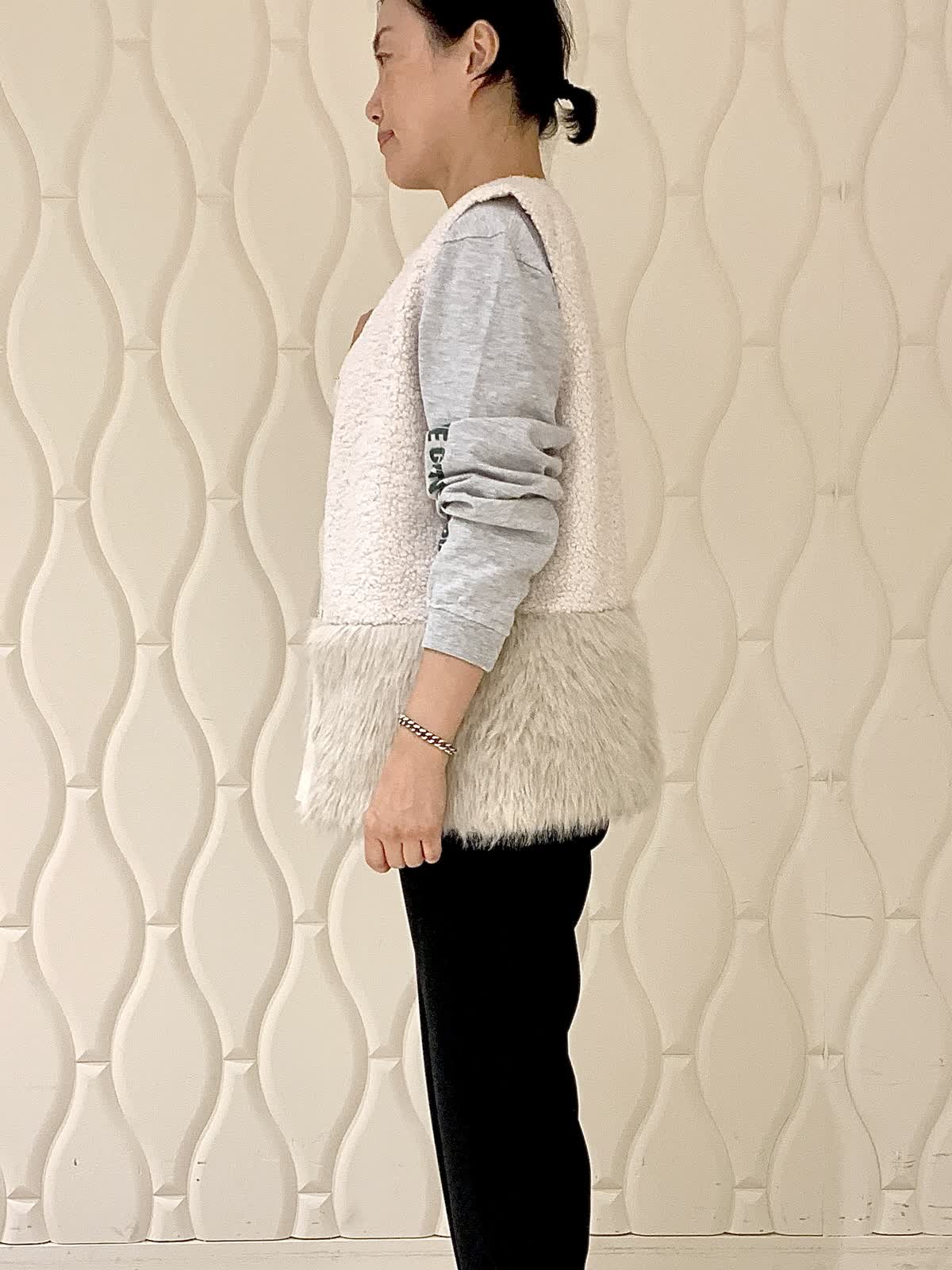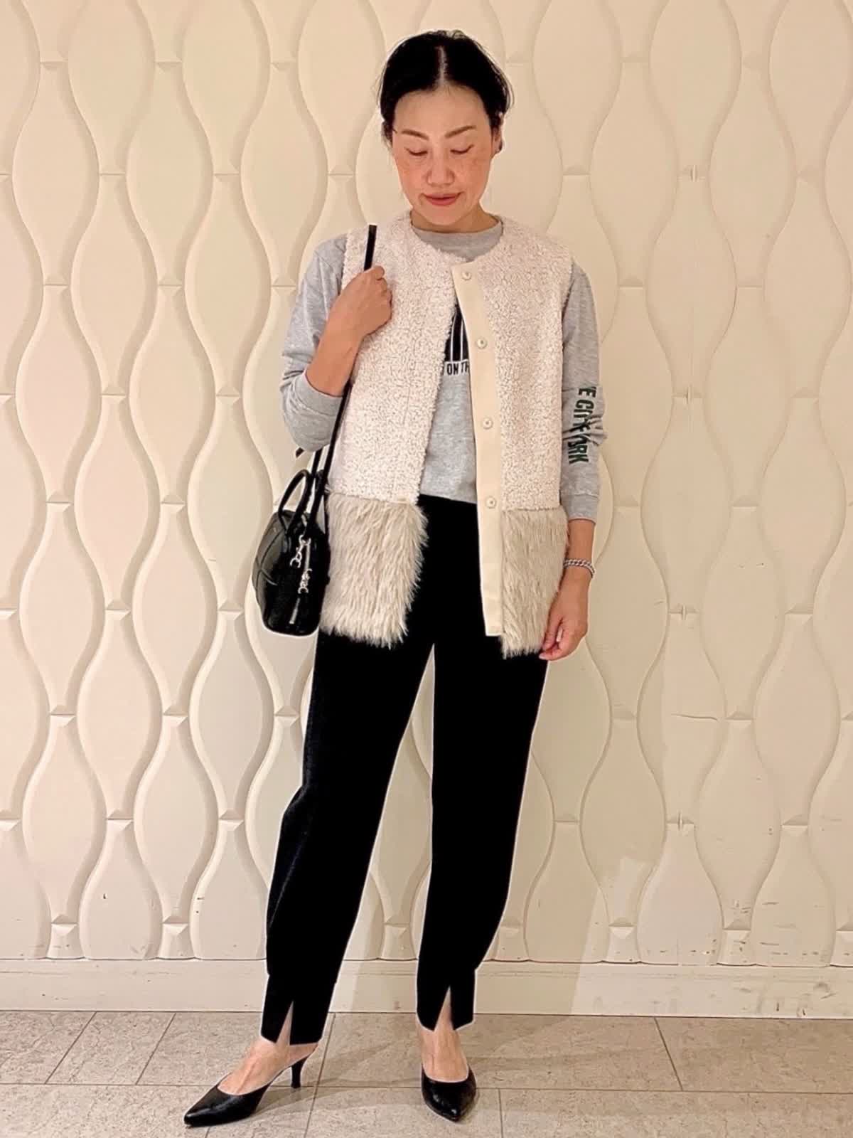 【着用サイズ】全て9号 【着用カラー】ジレ:オフホワイト カットソー:グレー パンツ:ブラック バッグ:ブラック ボアとエコファーのコントラストが効いたジレ。こんなラフでスポーティな休日スタイルにも綺麗めなオフィススタイルにも合う振り幅の広いアイテムです。軽い着心地も魅力でインナーを変えて長く楽しめそうです。
