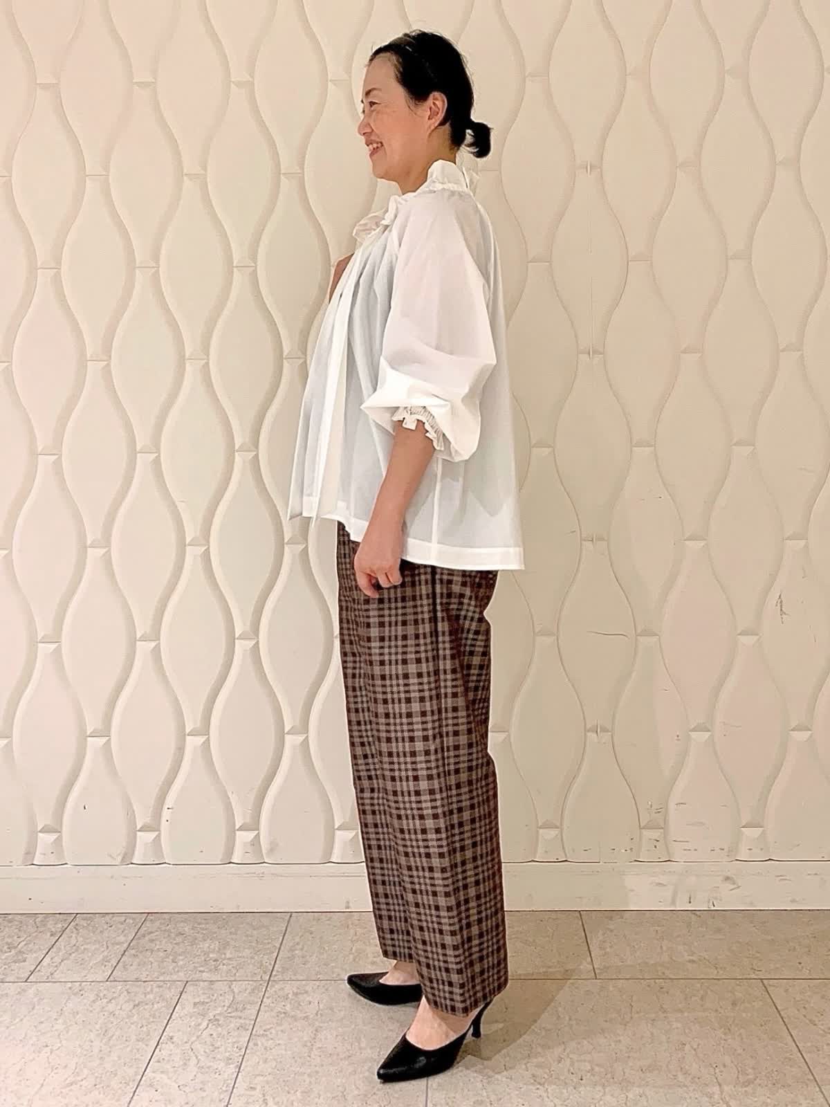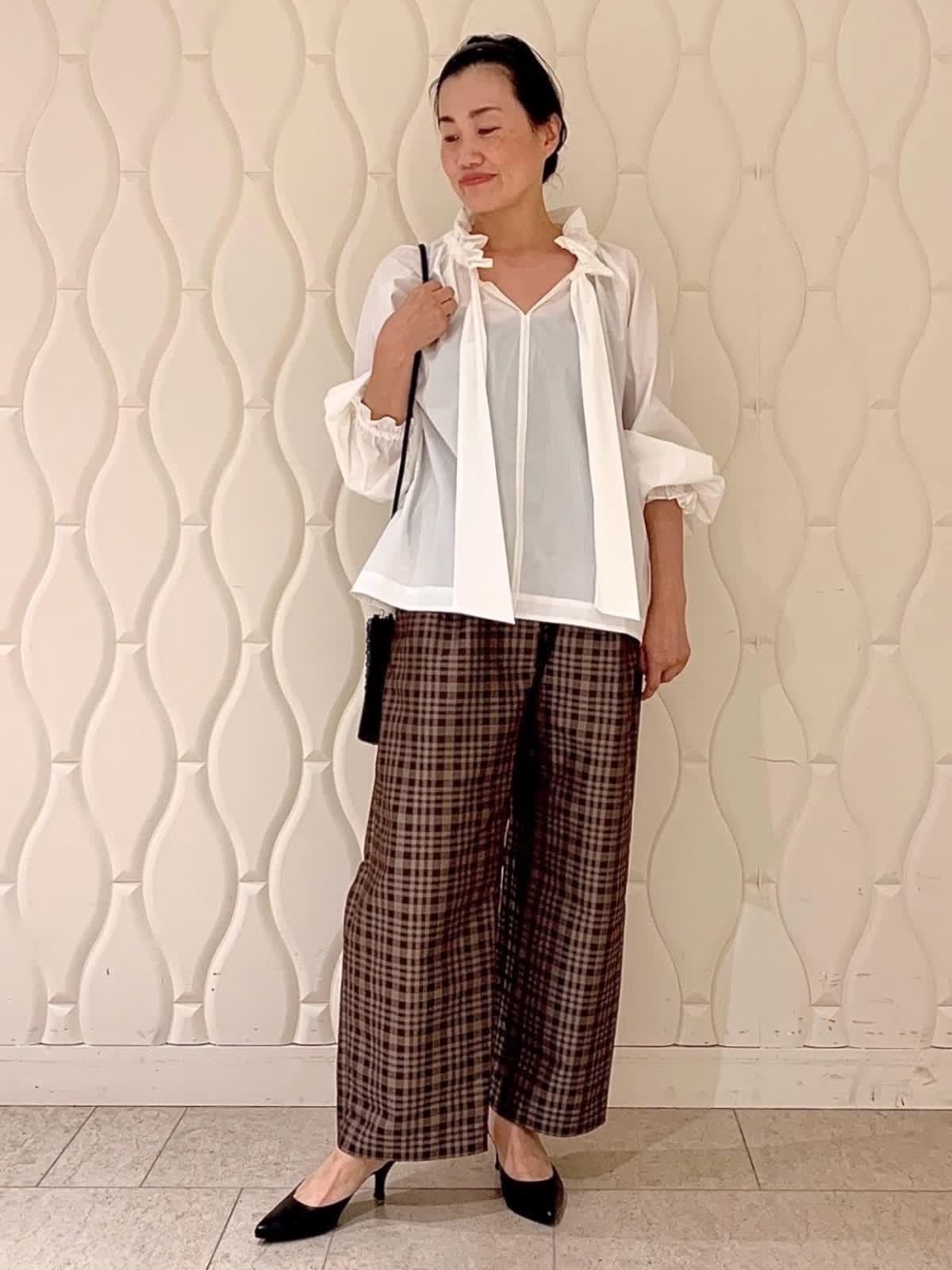 【着用サイズ】全て9号 【着用カラー】ブラウス:オフホワイト パンツ:ブラウン 今ジャストで着られるランチコーディネート。顔まわりがぐっと華やかになるフリルカラーブラウス、骨格ストレートの私はボウを垂らしデコルテを見せてすっきりと。ジャガード生地とラップデザインがチェック柄でもモードな印象のワイドパンツと。それぞれカジュアルアイテム合わせでも着映えしイージーケアも魅力です。