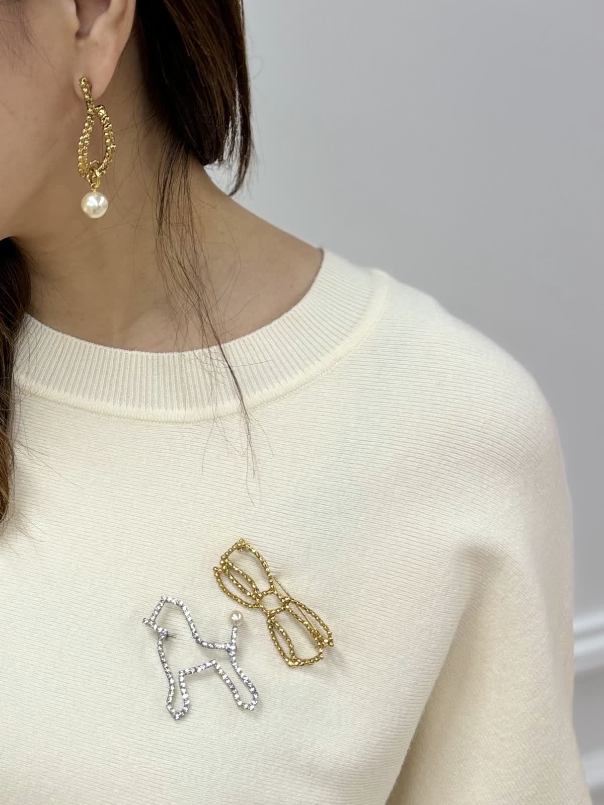 【着用カラー】ピアス:ゴールド リボンブローチ:ゴールド プードルブローチ:シルバー ベーシックなコーディネートを華やかにしてくれるブローチは、ニットからジャケットまで様々なアイテムに取り付けて、自分だけのアレンジを楽しめます。ねじりピアスに合わせて顔まわりを華やかにしました。