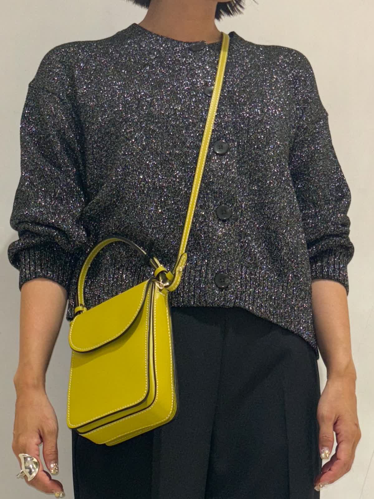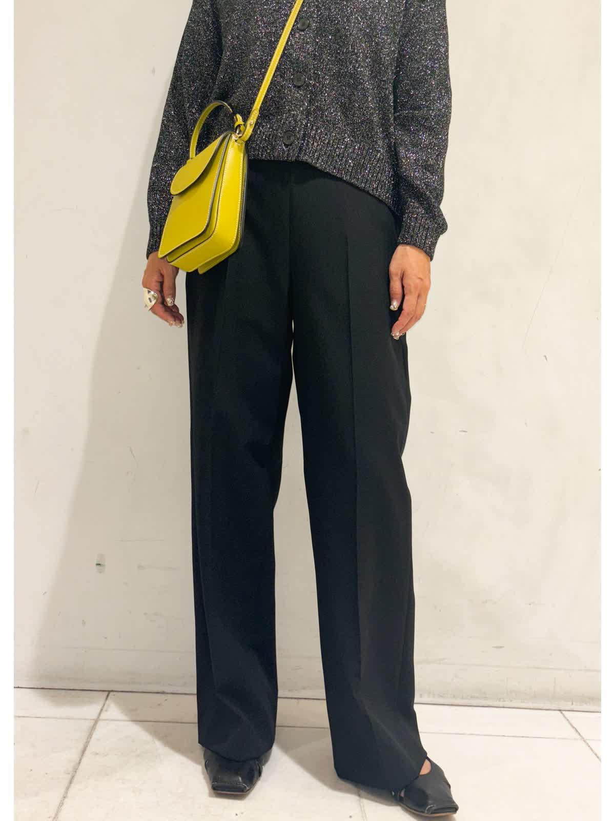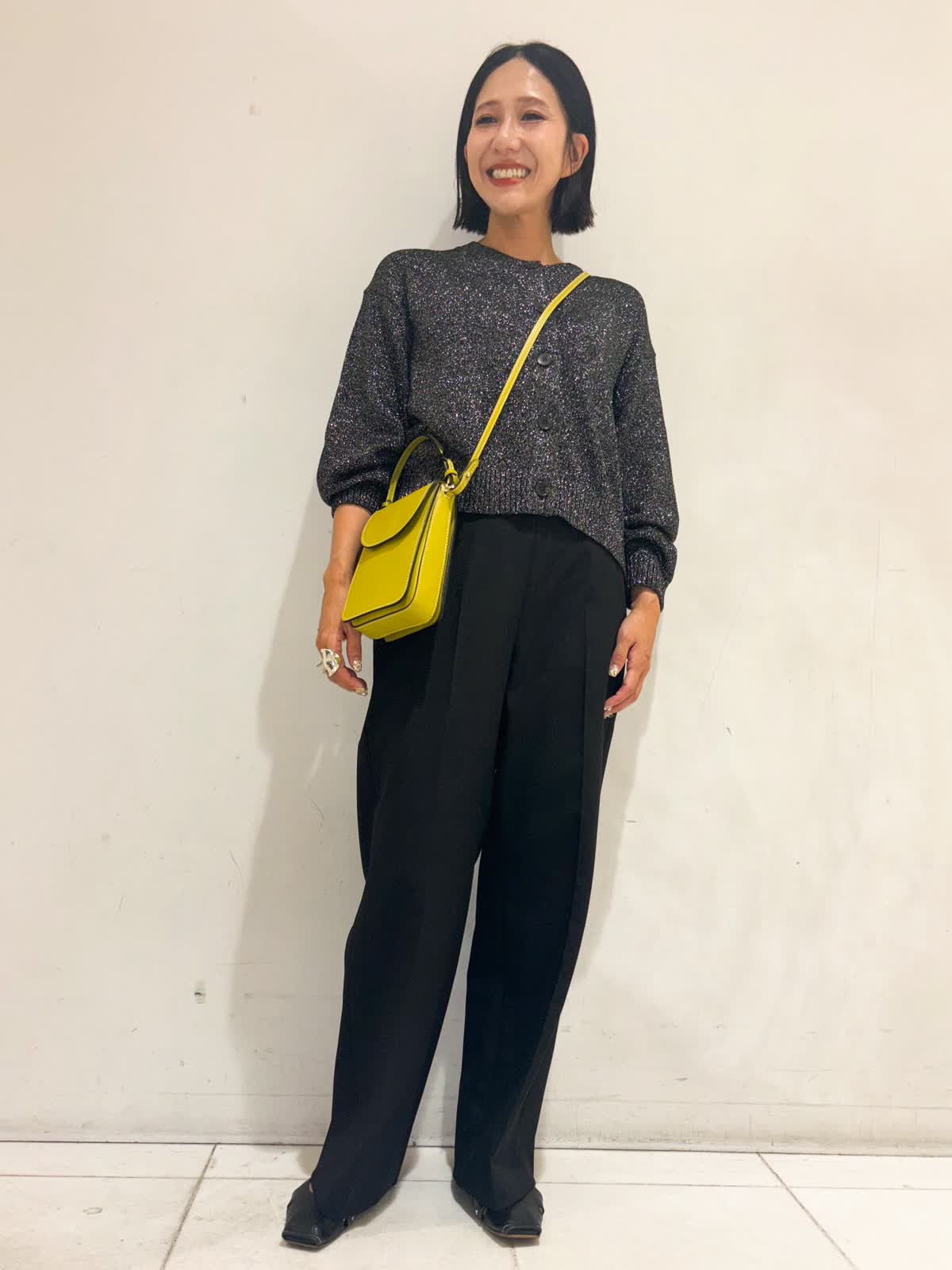 【着用サイズ】ニット:9号 パンツ:9号【着用カラー】ニット:シルバー パンツ:ブラック トレンドのラメを使ったカーディガンは存在感があり何を合わせても華やかな印象に。イネドの人気ワイドシルエット「エイミー」は脚長効果抜群でONOFF着回せるおすすめのパンツです。