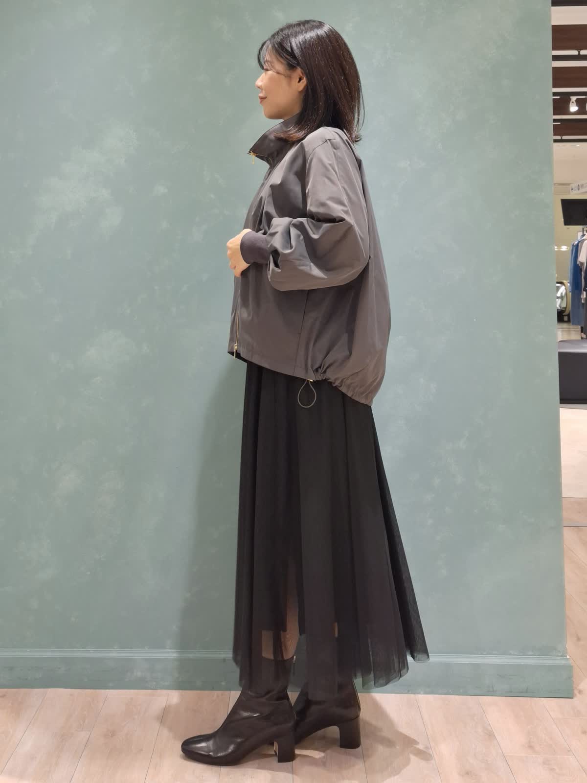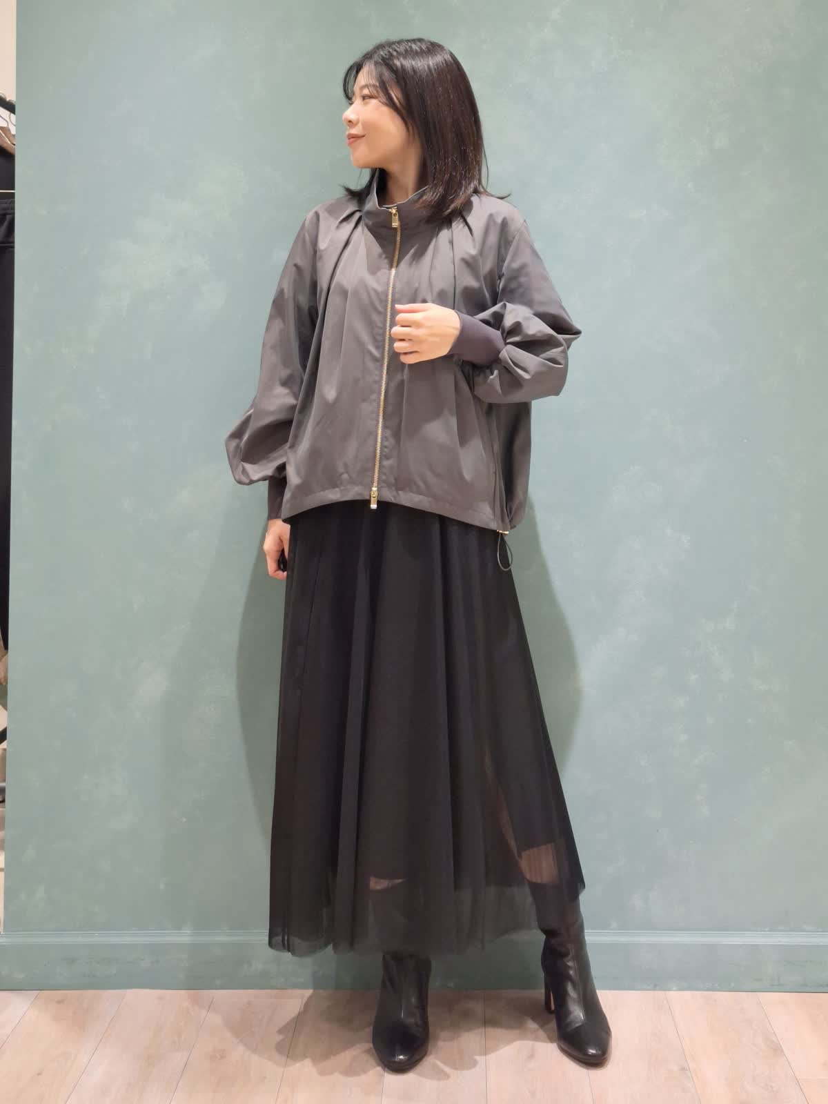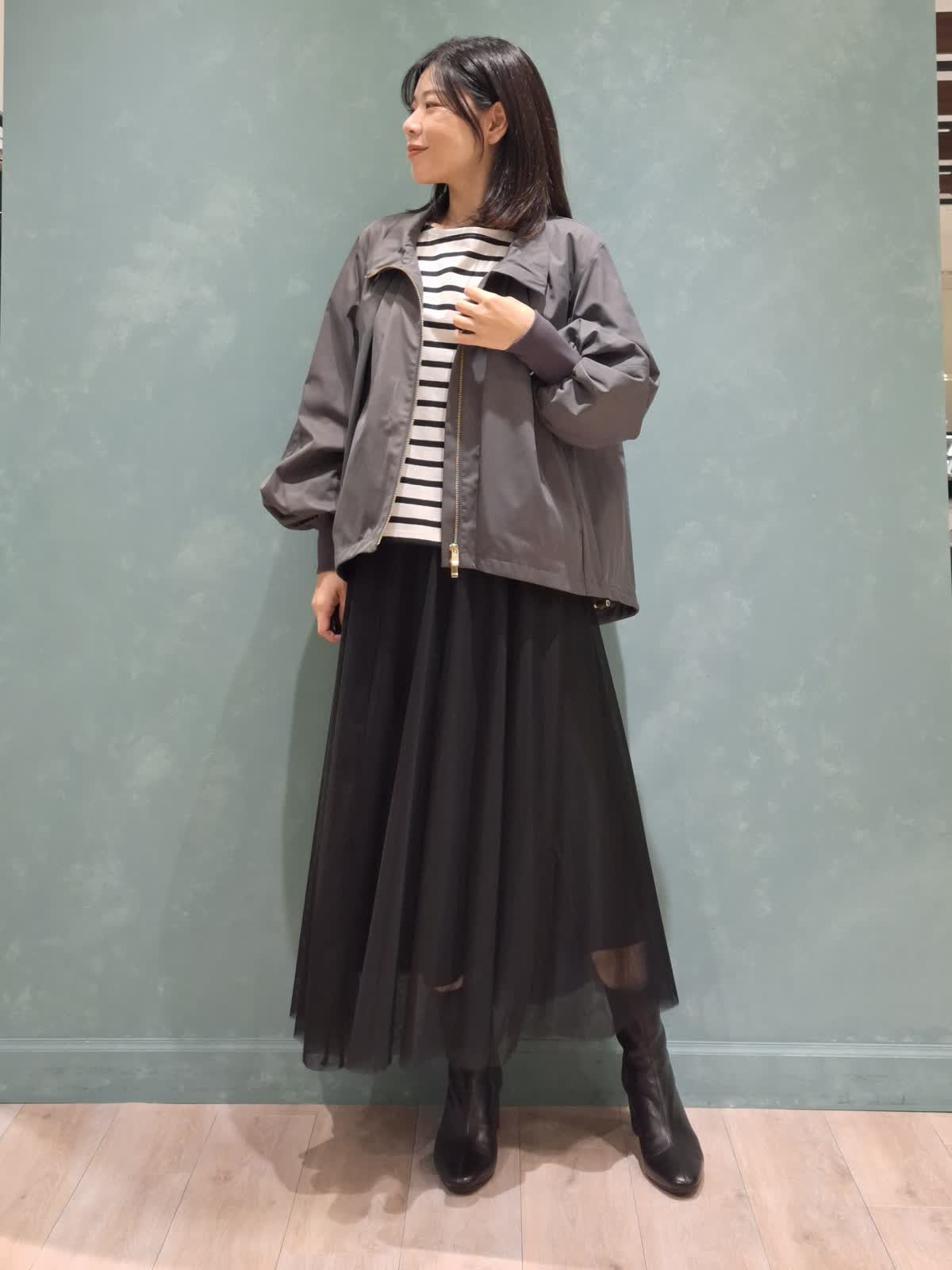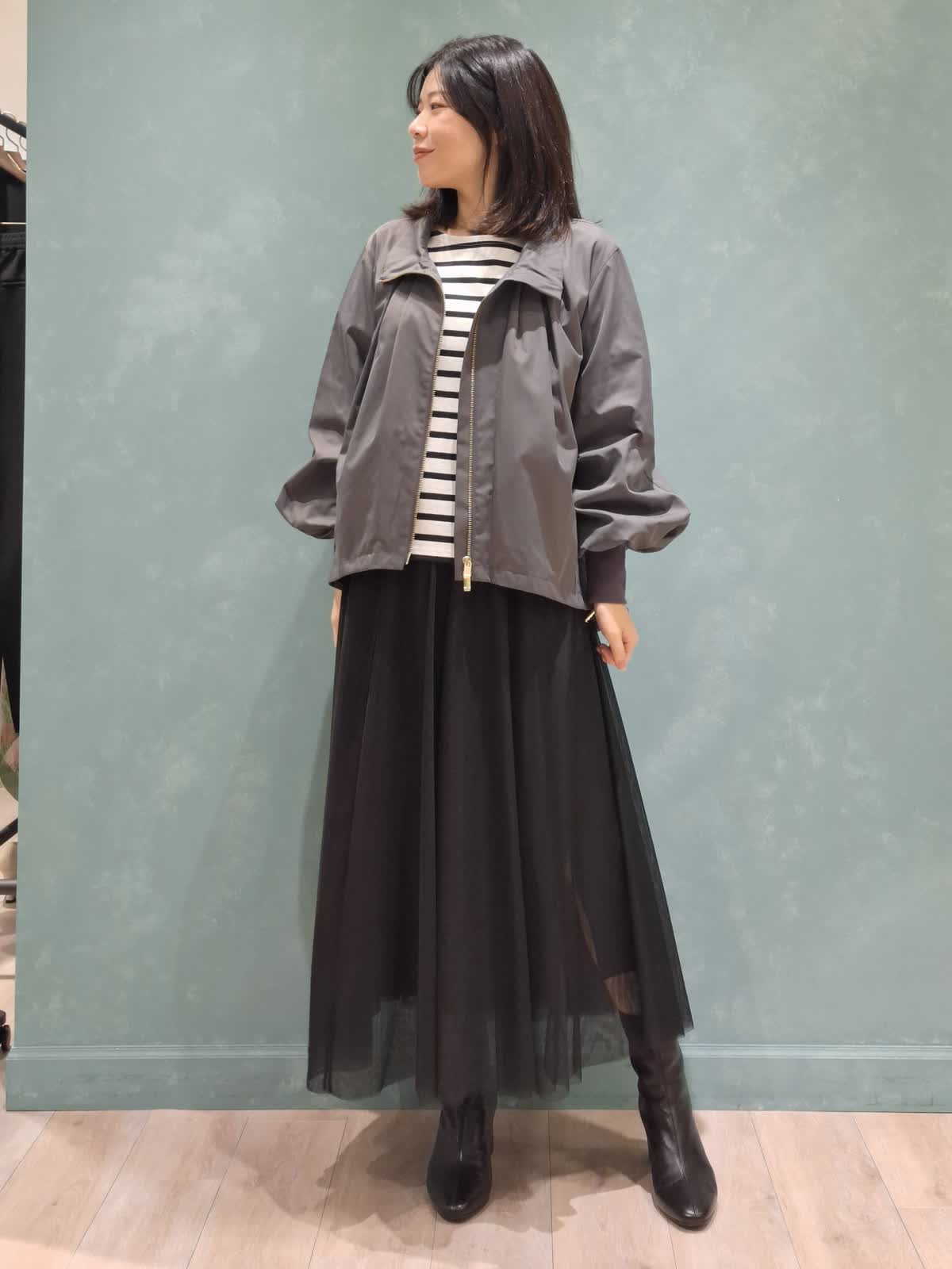 【着用サイズ、カラー】ブルゾン:7号、チャコールグレー カットソー:9号、オフホワイト スカート:7号、ブラック Stylist/望月 律子さんコラボブルゾンをガーリーカジュアルにコーディネート!全体的にボリューム感のあるデザインですが、袖口がリブだったり、裾が絞れたりで着太りせずオシャレに着ていただけます。ファスナーを閉めてきた時のスタンド襟も高過ぎずお気に入りのポイントです◎インナーはボーダーカットソー×人気のチュールスカートを合わせて、足元はショートブーツで秋を先取りしました。
