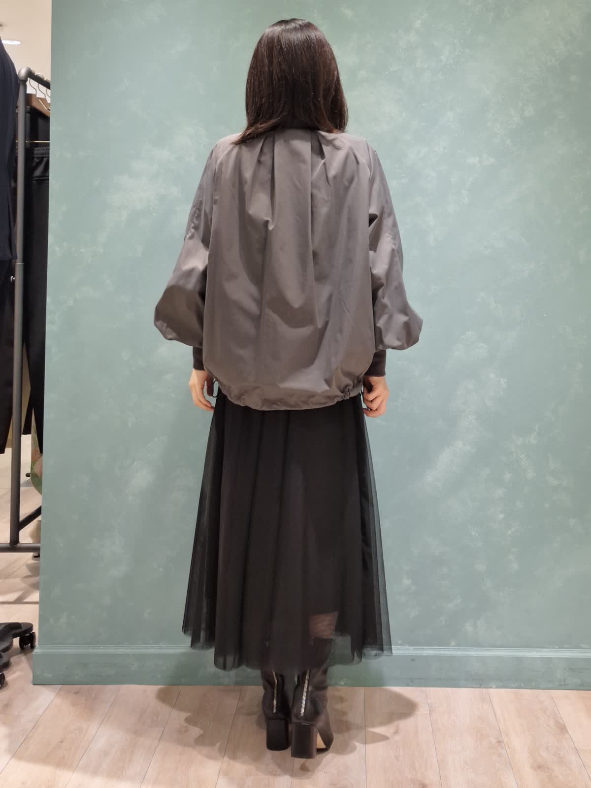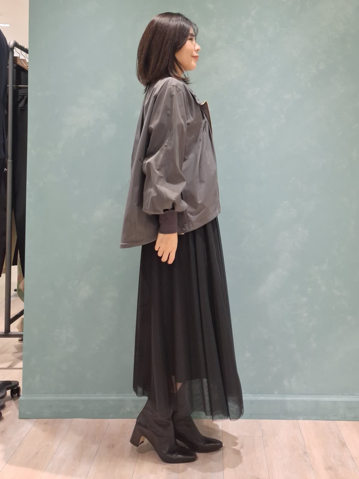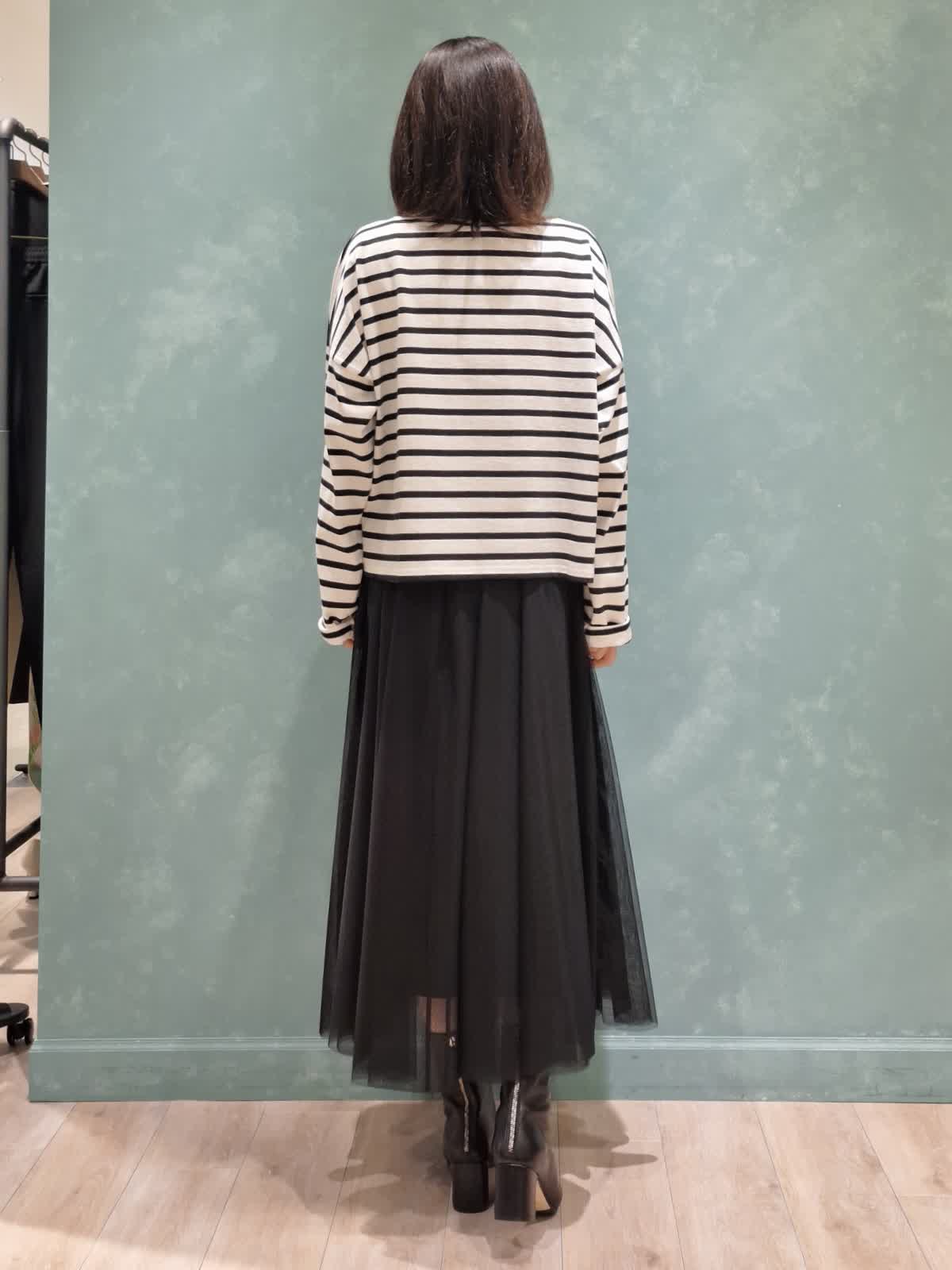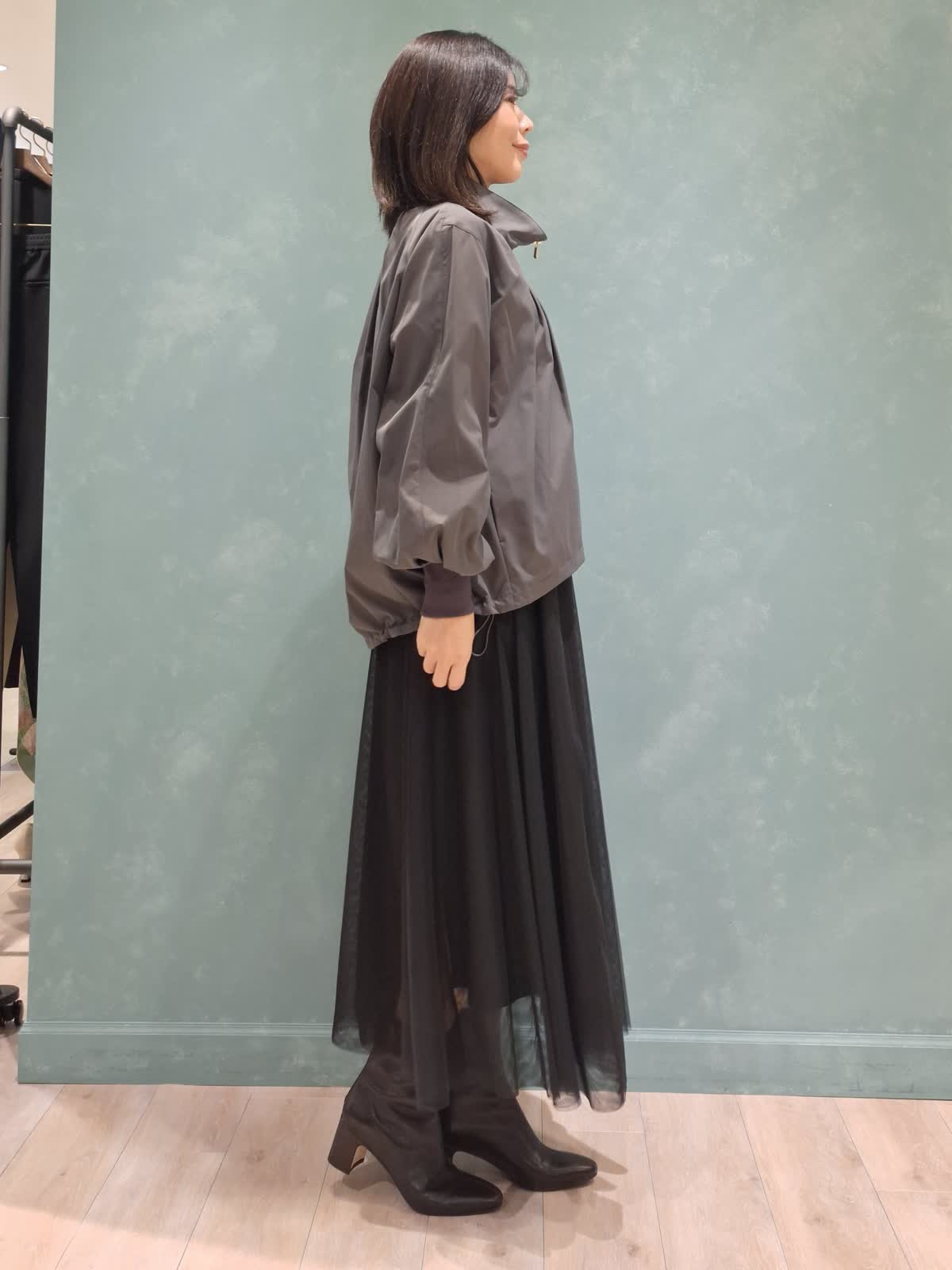 【着用サイズ、カラー】ブルゾン:7号、チャコールグレー カットソー:9号、オフホワイト スカート:7号、ブラック Stylist/望月 律子さんコラボブルゾンをガーリーカジュアルにコーディネート!全体的にボリューム感のあるデザインですが、袖口がリブだったり、裾が絞れたりで着太りせずオシャレに着ていただけます。ファスナーを閉めてきた時のスタンド襟も高過ぎずお気に入りのポイントです◎インナーはボーダーカットソー×人気のチュールスカートを合わせて、足元はショートブーツで秋を先取りしました。