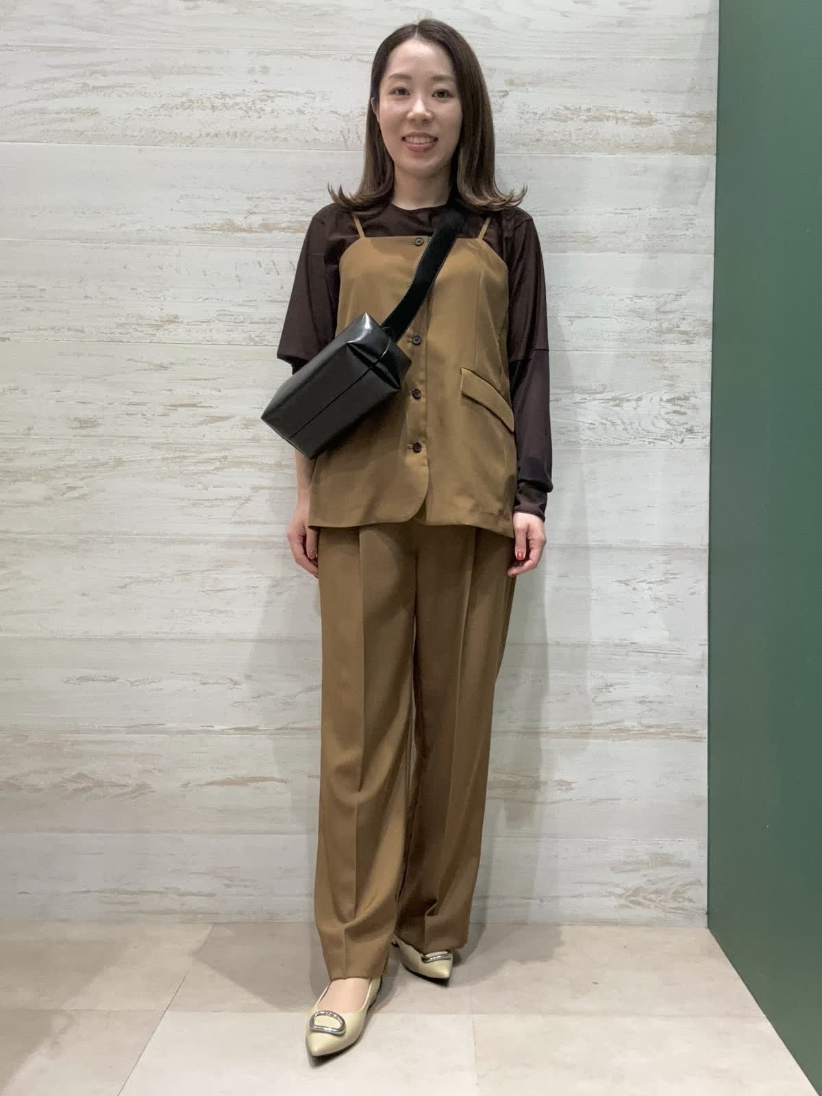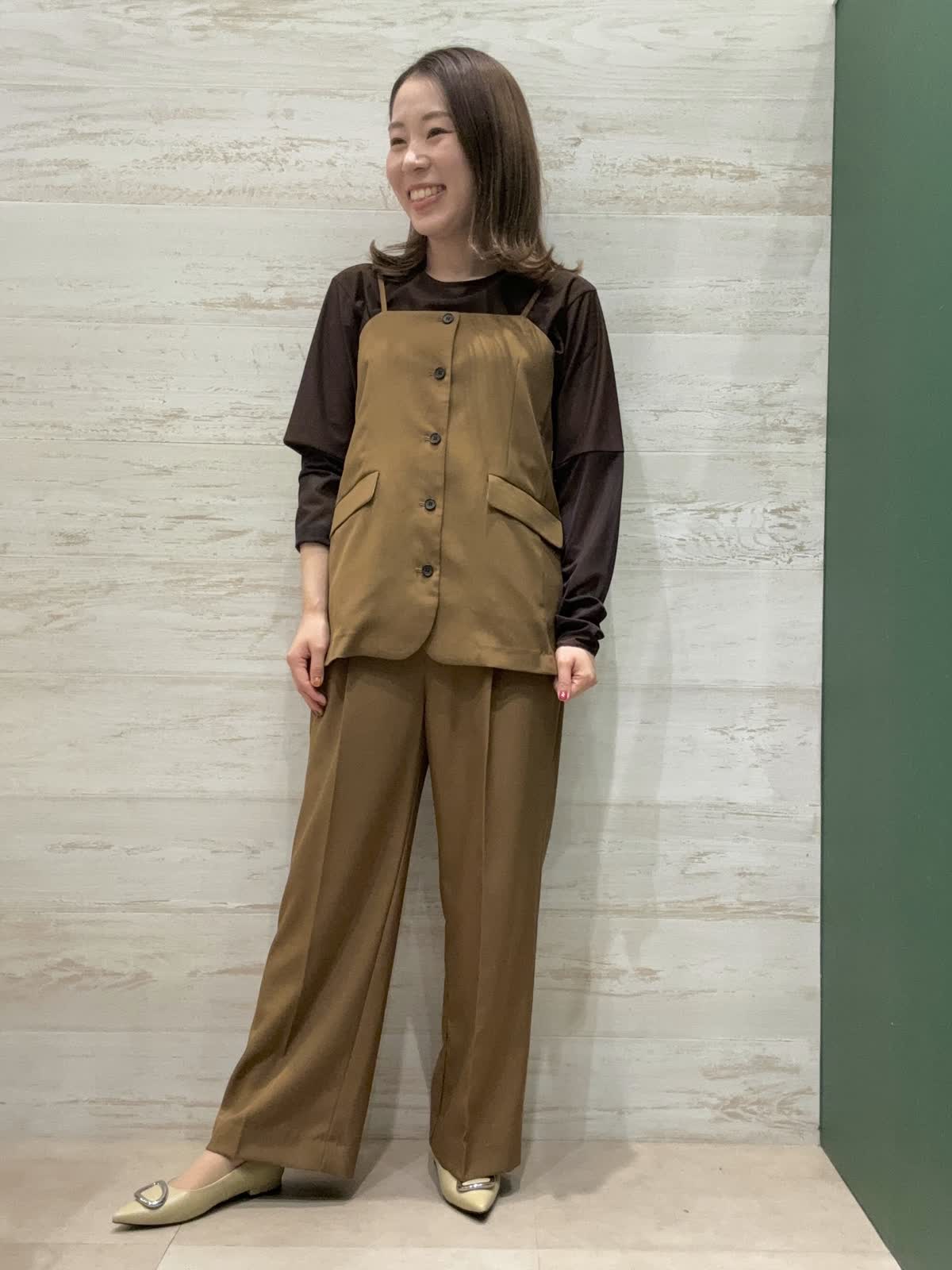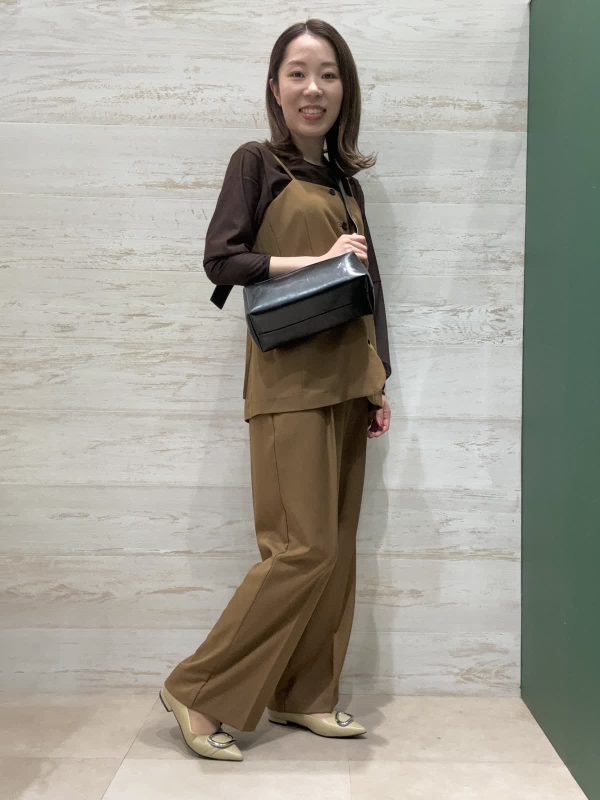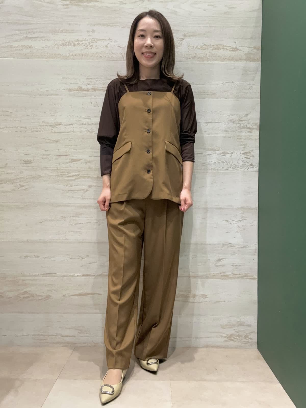 【着用カラー】ビスチェ・パンツ・ブラウス:ブラウン 【着用サイズ】ビスチェ・パンツ・ブラウス:フリー ビスチェは脇まわりスッキリで長さがあるので子供っぽくなりにくいです。パンツはウエストサイドにボタンがありサイズ調整ができるのでSサイズの方も履きやすいです。 全体的にブラウンでまとめて秋らしいキレイめスタイリングにしてみました。