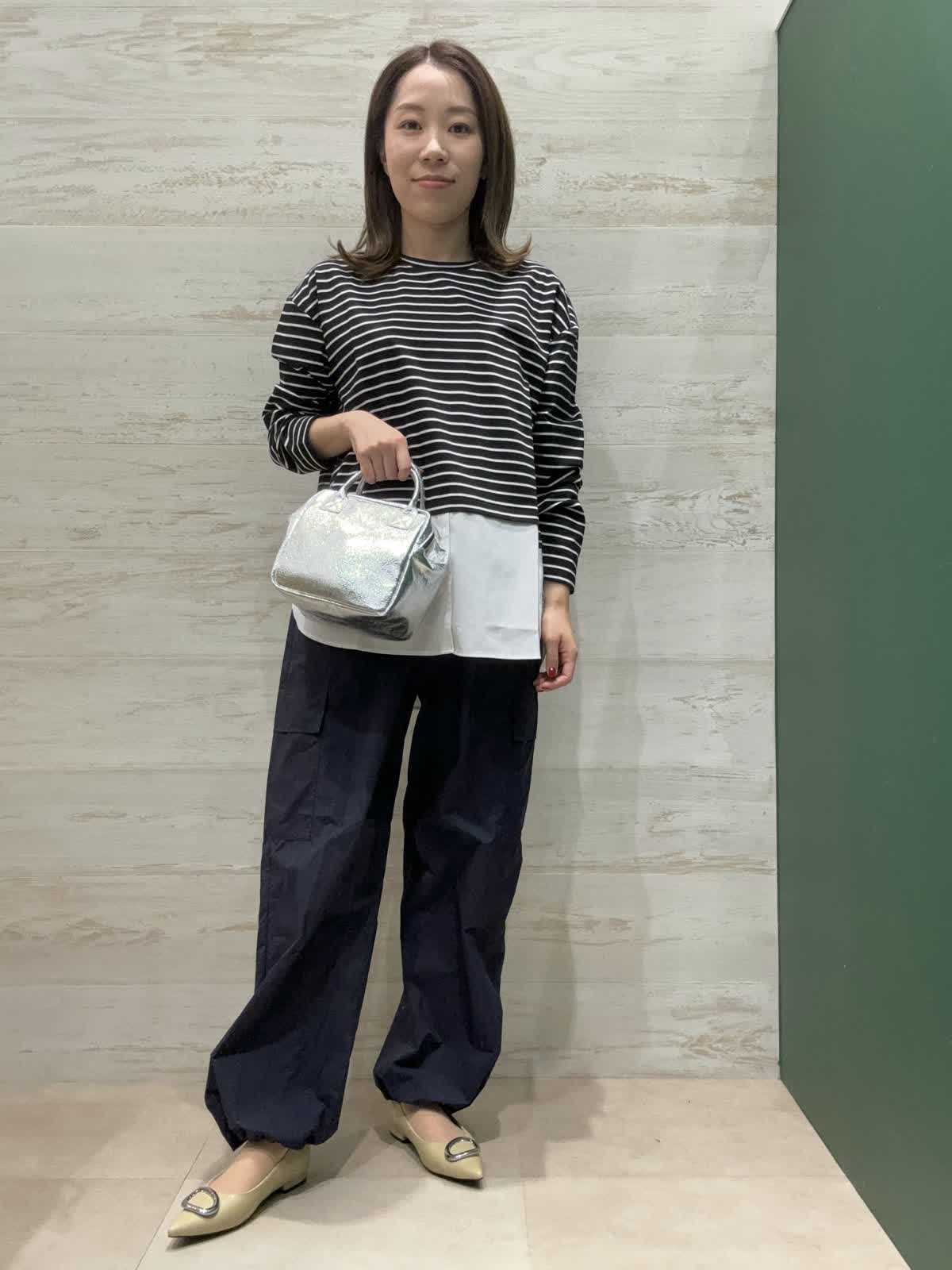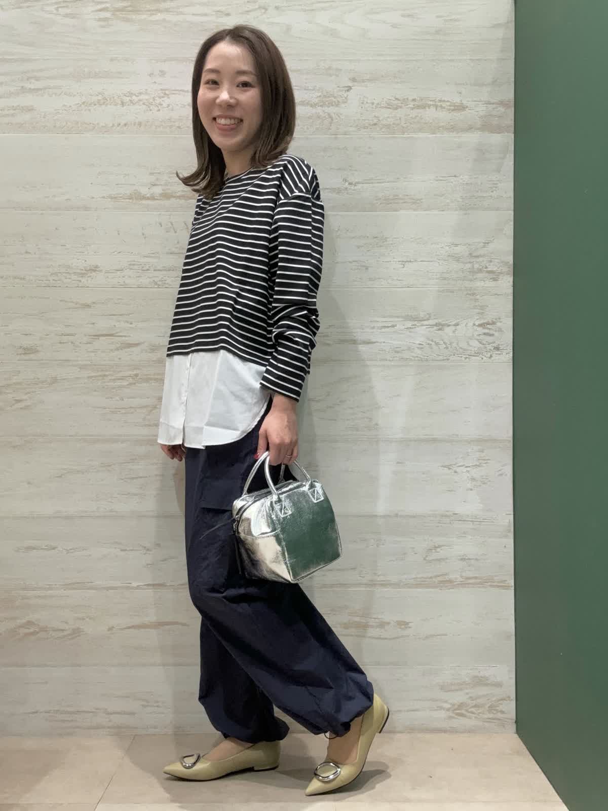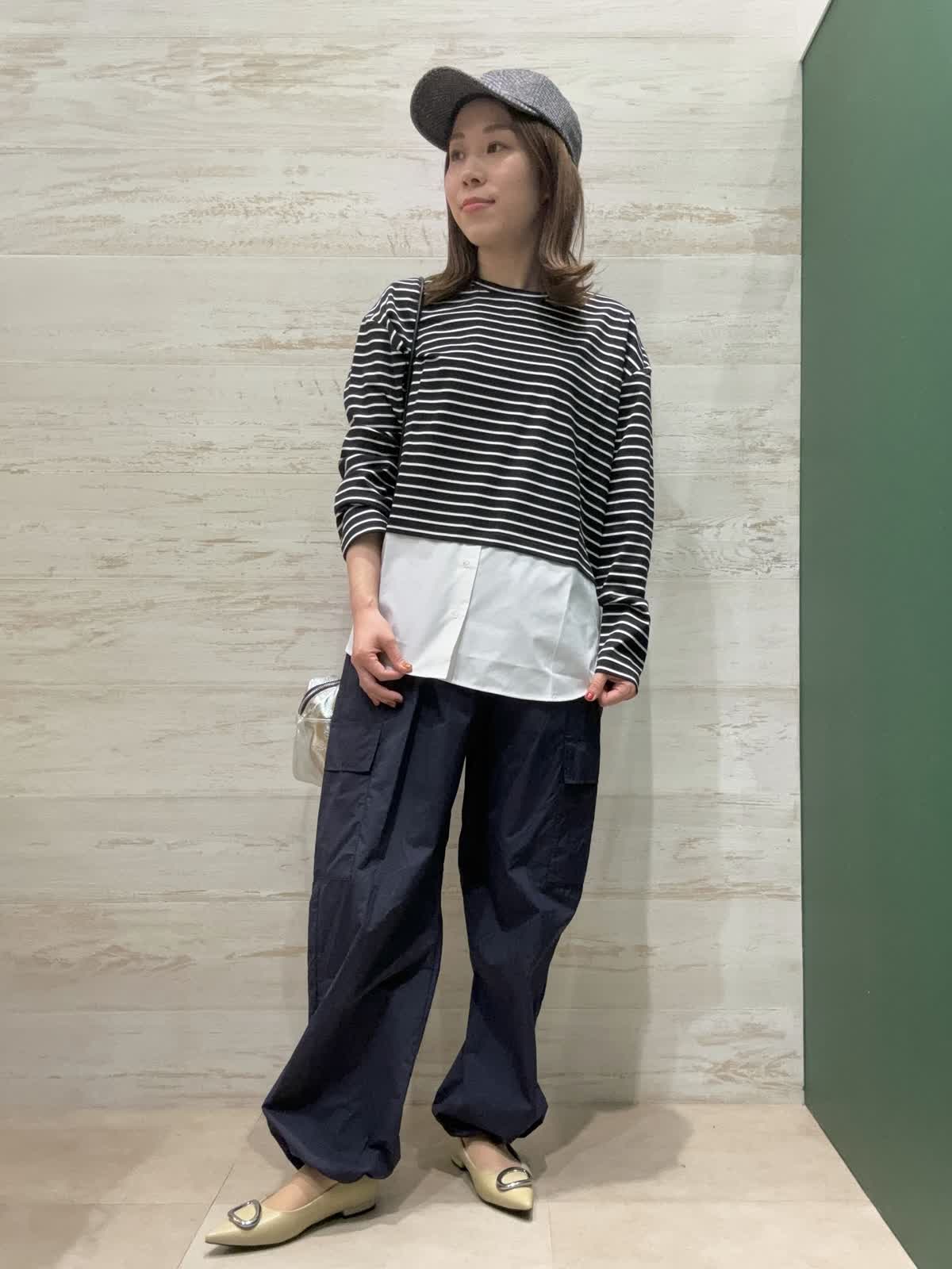 【着用カラー】カットソー:ボーダー パンツ:ネイビー 【着用サイズ】カットソー・ボーダー:フリー 家族でお出かけコーデスタイル 重ね着風レイヤードカットソーは簡単にオシャレを取り入れやすく、お出かけするにはぴったりなアイテムです。 パラシュートパンツもSサイズで苦手意識がある方にぜひチャレンジしていただきたいです。