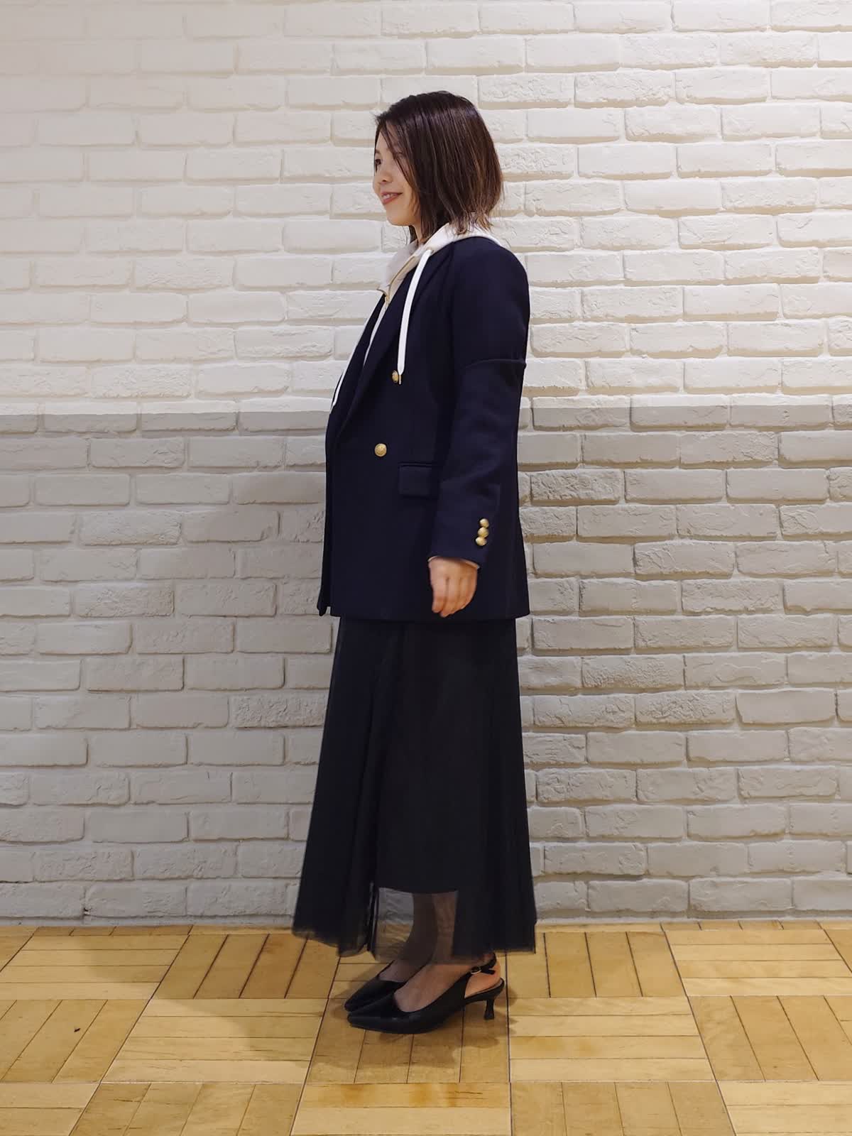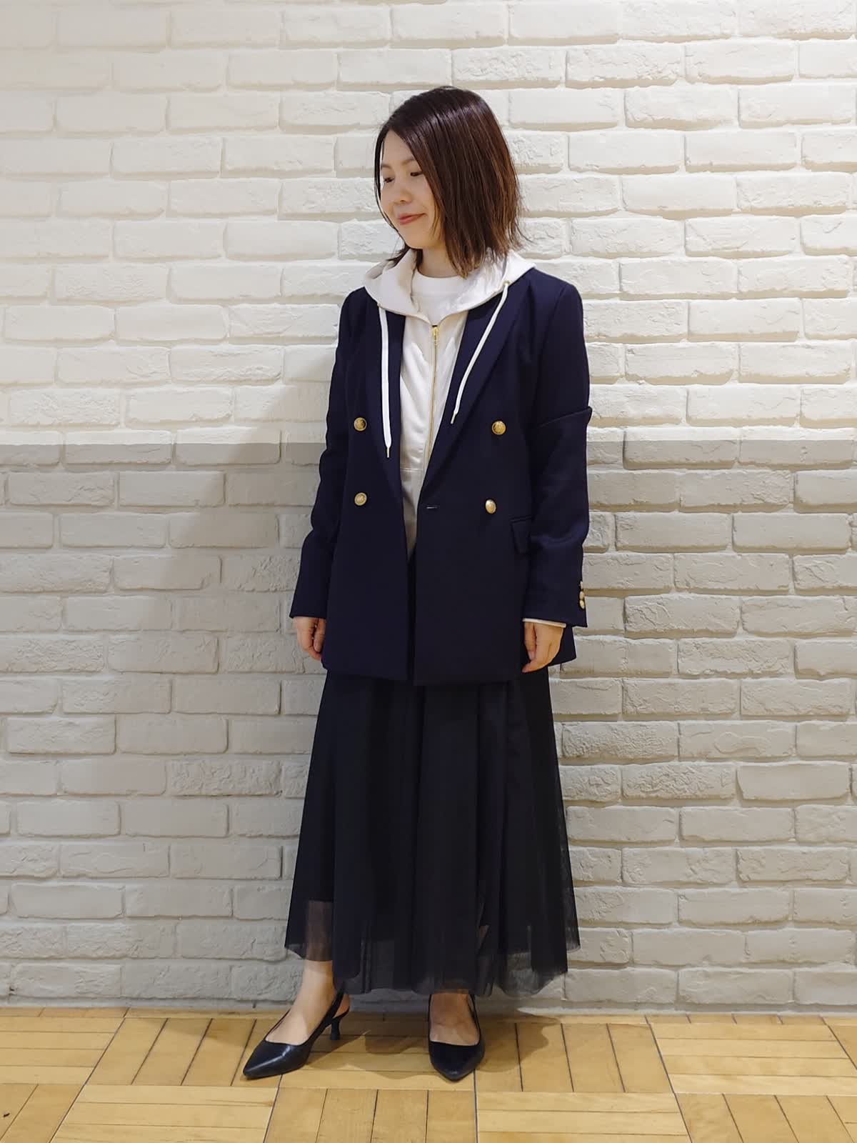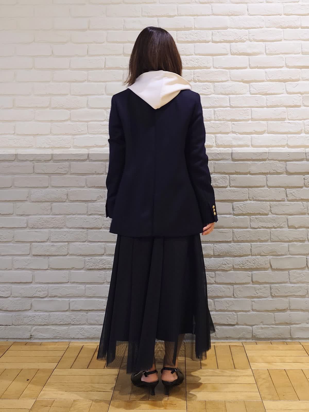 【着用カラー】ジャケット:ネイビー フーディー:グレーベージュ カットソー:オフホワイト スカート:ブラック