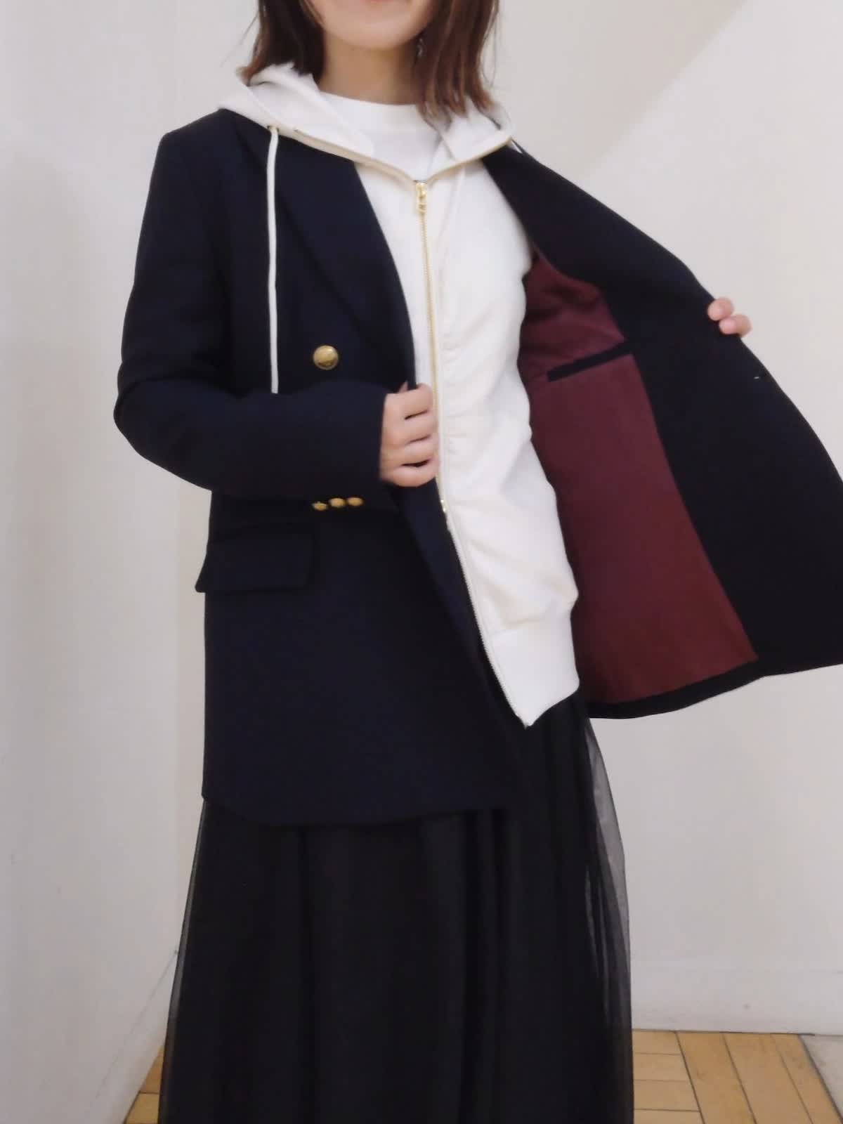 定番のジャケットにフーディーを重ね着した休日お出掛けスタイル。トレンドに捉われず長く愛用していただけるジャケットはメンズライクな仕上がりながら大きすぎない襟で女性らしさのある一着です。裏地ボルドーカラーでチラッと見えた時もおしゃれ感があります。フーディーはダブルジップ仕様で着こなしのアレンジもできます。カジュアルさを抑えた生地感でキレイめな印象で着用できるので季節の変わり目の羽織りにオススメです。