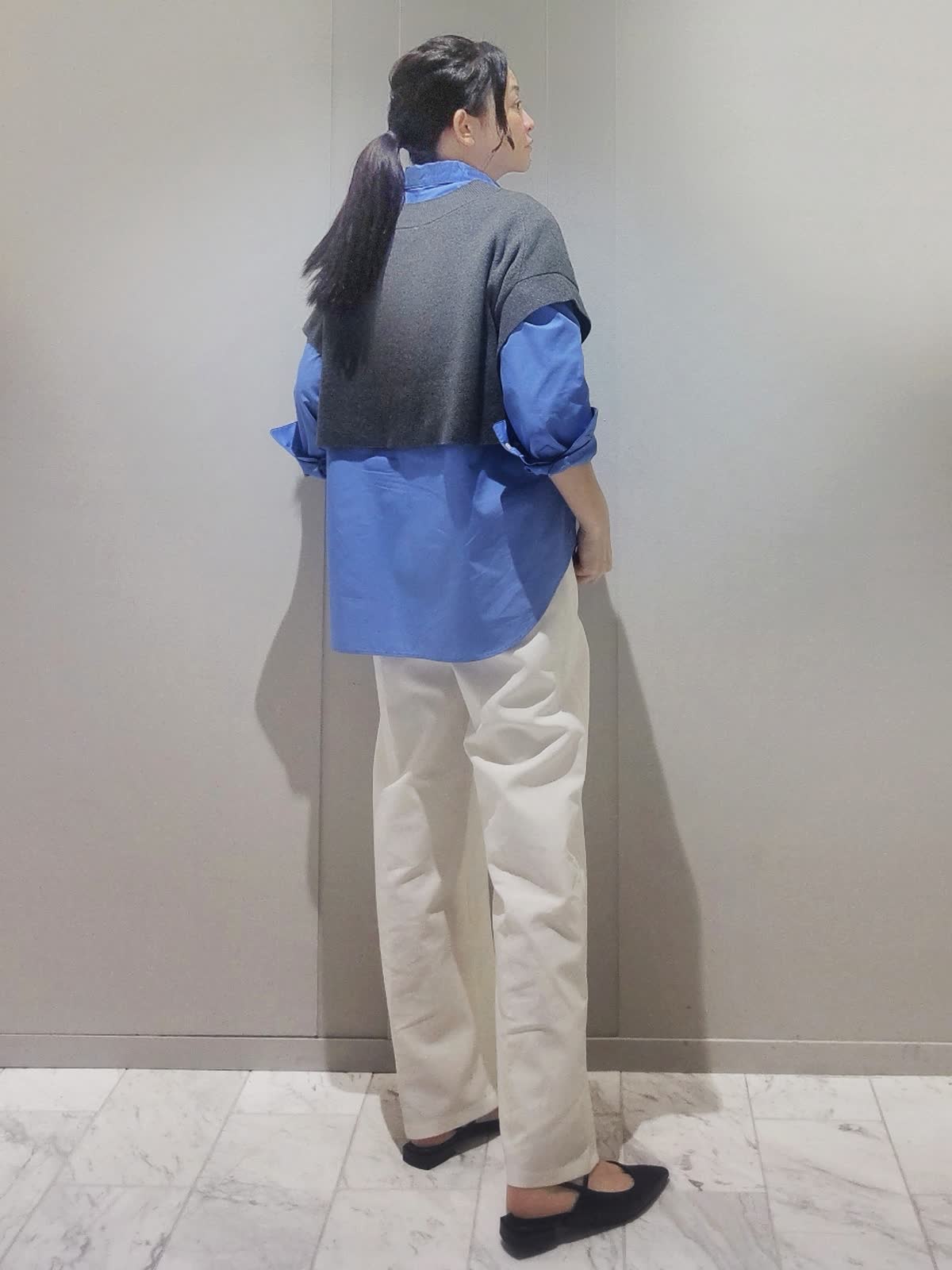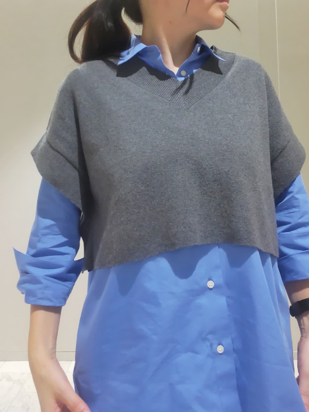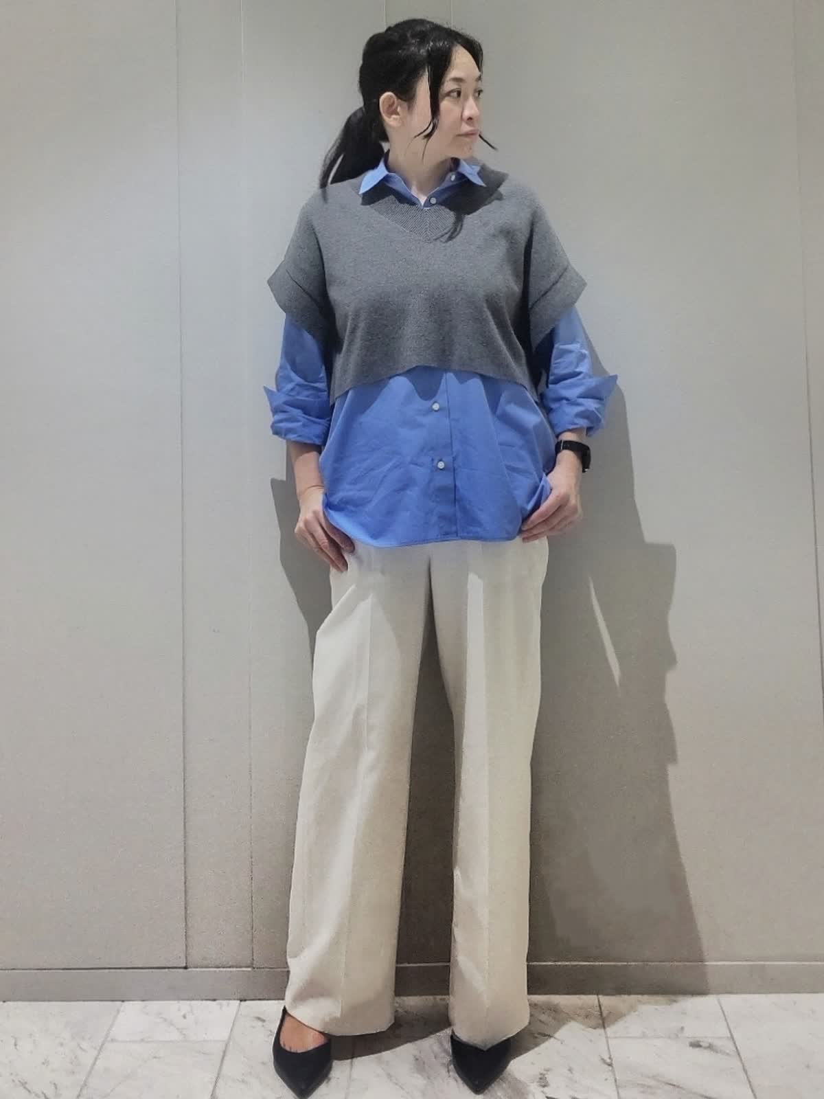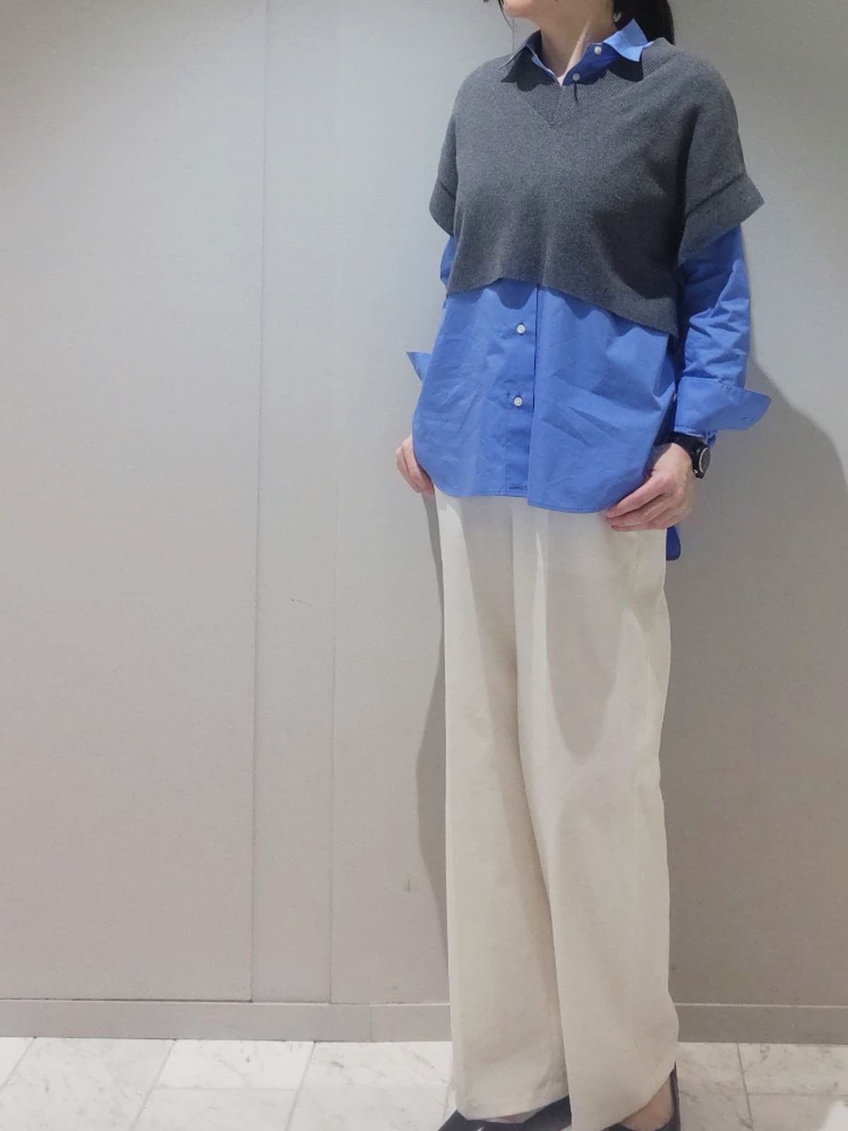 【着用サイズ】ニット : 9・シャツ : 9 ・パンツ: 9 【着用カラー】ニット : チャコールグレー・シャツ : サックス・パンツ : オフホワイト オフィスでも使えるキレイ目ワイドパンツを合わせた、秋らしいロングシャツのレイヤードスタイリング。 トップスはヒップラインまでかくれる着丈のシャツに、ニットベストを重ねた今年らしいレイヤード。シャツはカシュクールにもなる2way仕様。ポリエステルが入った素材でシワにもなりにくくデイリーにもオフィスにもピッタリなイージケアなアイテム。ベストはゆったりと。脇のボタンを外すたポンチョのようにも使えこちらも着回し力抜群。シンプルワイドパンツに合わせてキチン感を出したオフィスカジュアルコーデに。
