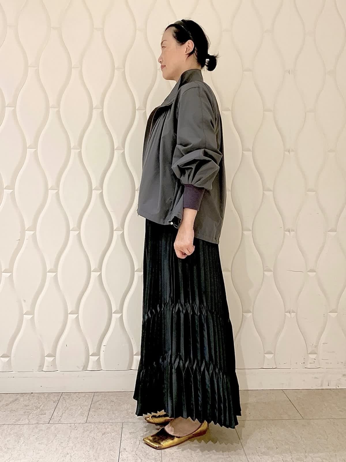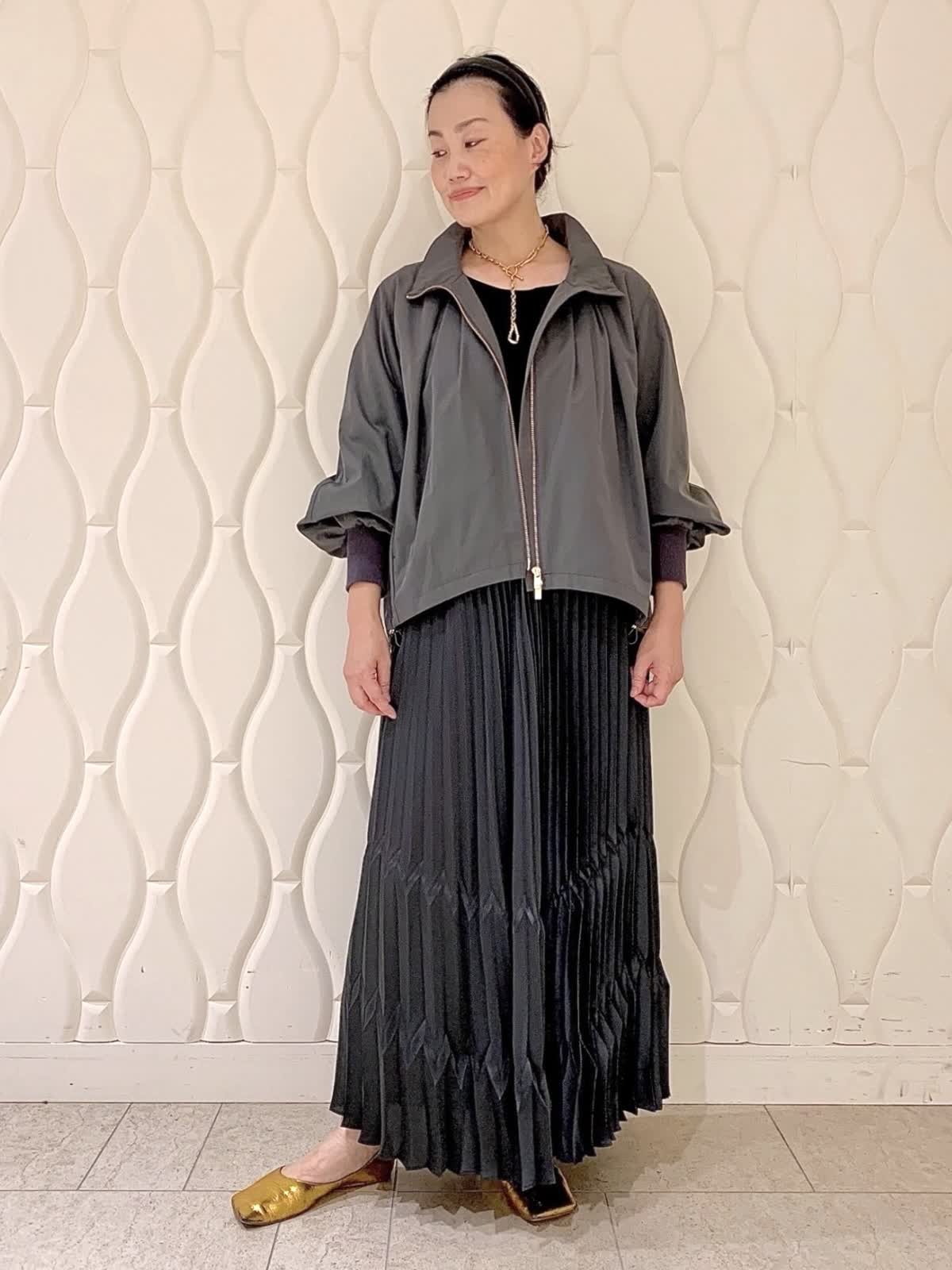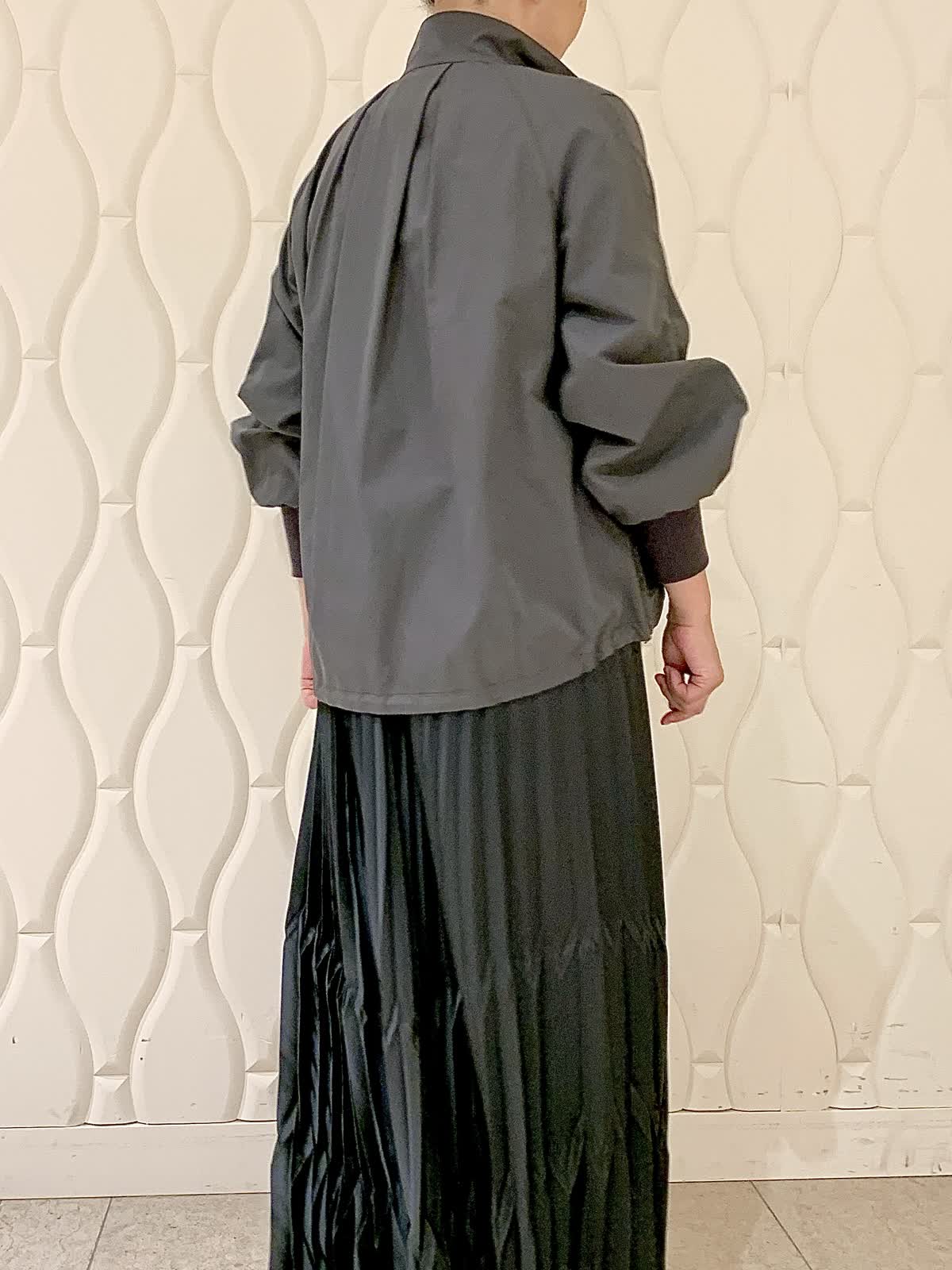 【着用サイズ】全て9号 【着用カラー】ブルゾン:チャコールグレー カットソー:ブラック スカート:チャコールグレー 身頃のタックや袖口のギャザーのディテールが効いた軽量ブルゾン。微光沢素材も相まってこんな辛口モードなスタイリングも決まります。ゆったりシルエットでこれから中に着込んでもらくらく着れるのも嬉しいポイント、長く愛用いただける1枚です。