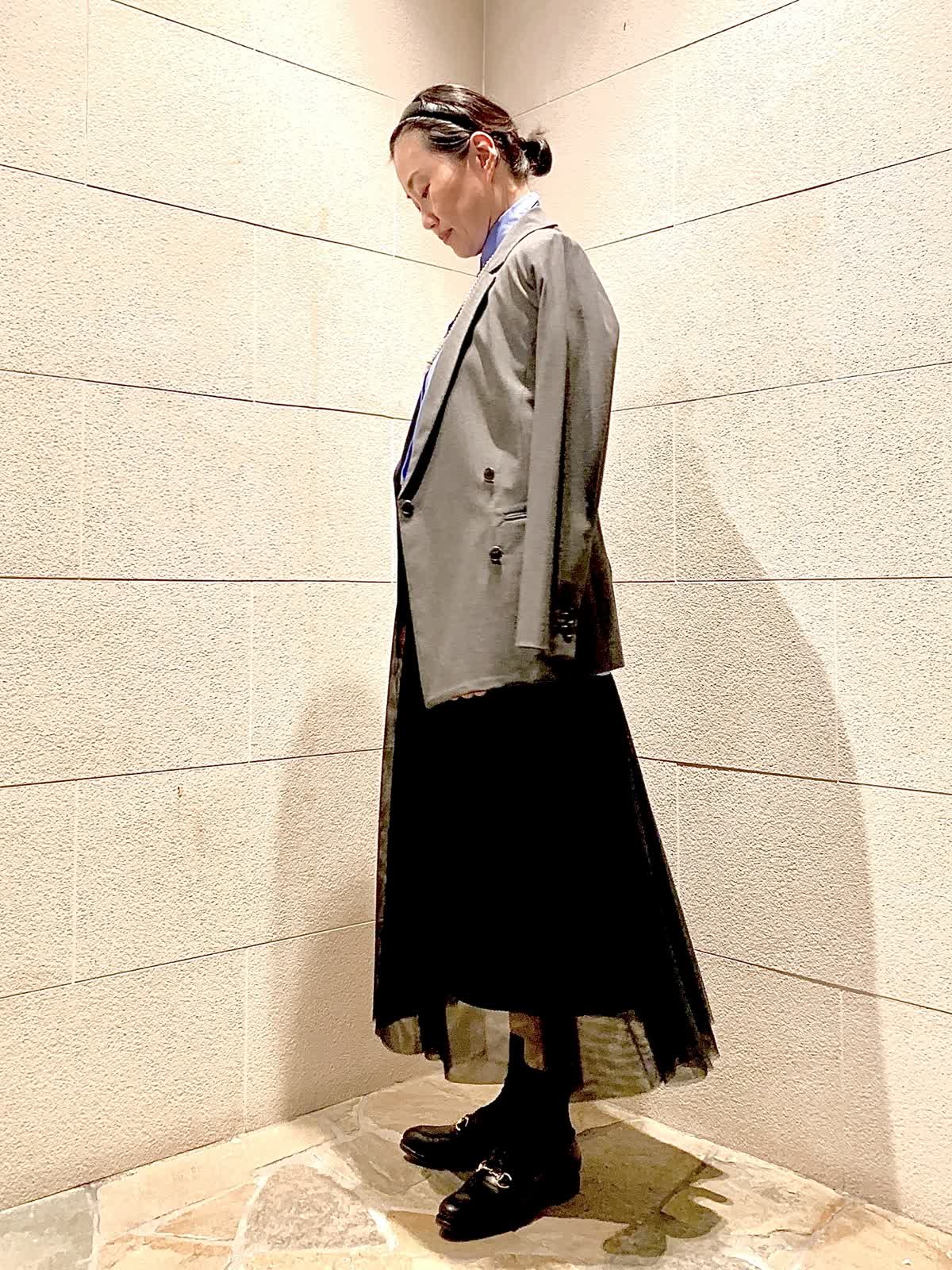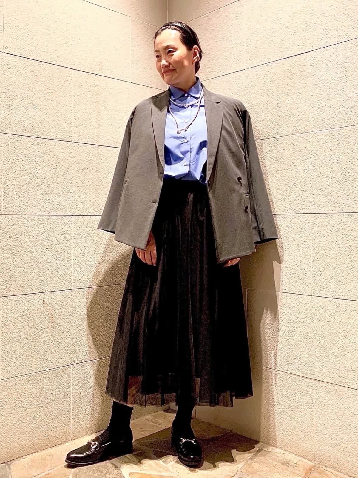 【着用サイズ】全て9号 【着用カラー】ジャケット:チャコールグレー ブラウス:サックス スカート:ブラック 2wayストレッチのダブルブレストジャケットをオンし、こなれたトラッドスタイルに。こちらのジャケットはスーツになるボトムスとも勿論素敵ですが、少しモード感ある型・デザインなのでこんなベーシックアイテムとのコーデもおしゃれに決まります。顔周りが沈まないグレーのトーンも嬉しいポイント。