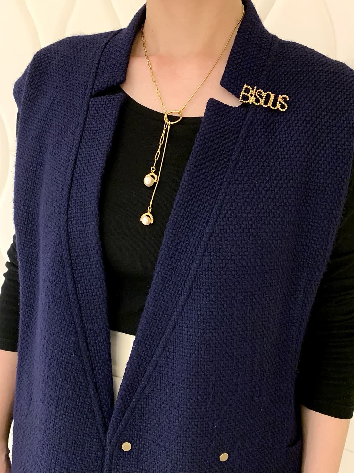 【着用カラー】ブローチ:ゴールド ラリエット:ゴールド ADER.bijouxのシグネチャーであるCUTSTEELの粒のブローチとメタルモチーフや繊細なチェーンが印象的なラリエット。こんな濃色や表面感ある素材のアイテムにはゴールドの輝きが映えます。
