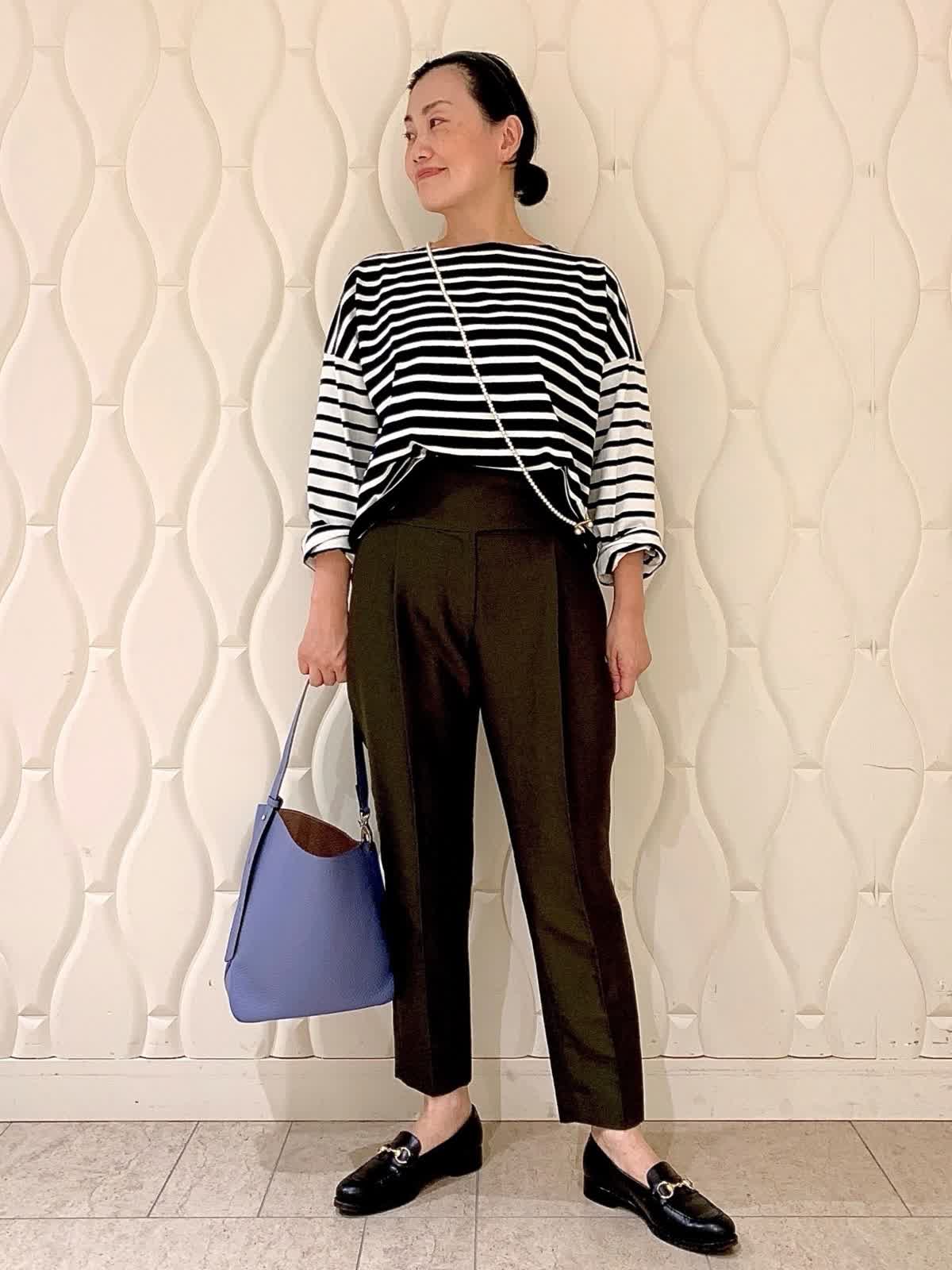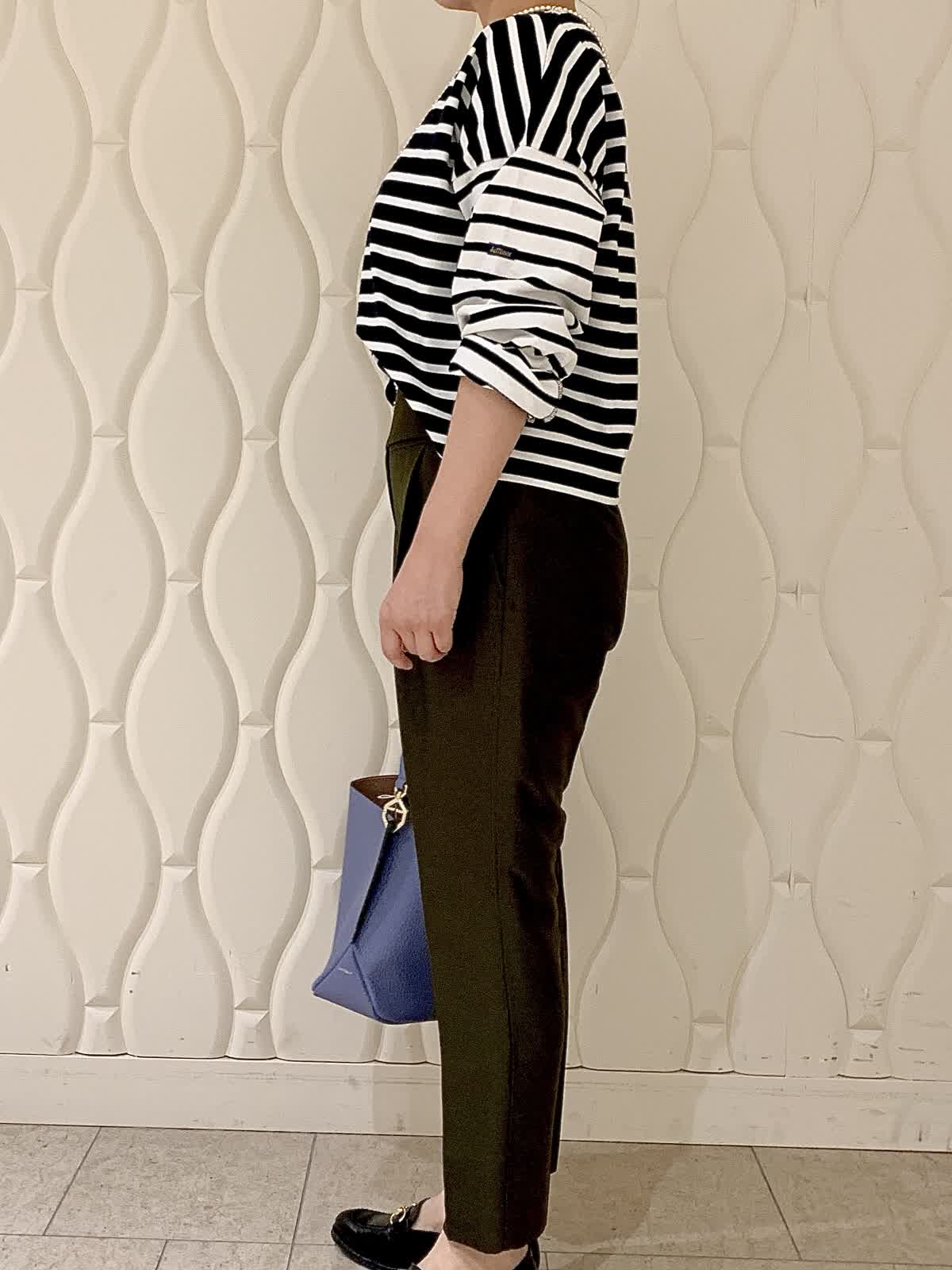 【着用サイズ】カットソー:9号 パンツ:11号【着用カラー】カットソー:ボーダー パンツ:カーキ 休日に定番のボーダーカットソーをモードな雰囲気のワイドベルトパンツとパールアクセでアップデート。ウエストインやハイウエストに苦手意識がありますが、このパンツは締めつけ感なくスッキリ穿けます。明るめのカーキも手持ちのワードローブに合わせやすいのも嬉しい!