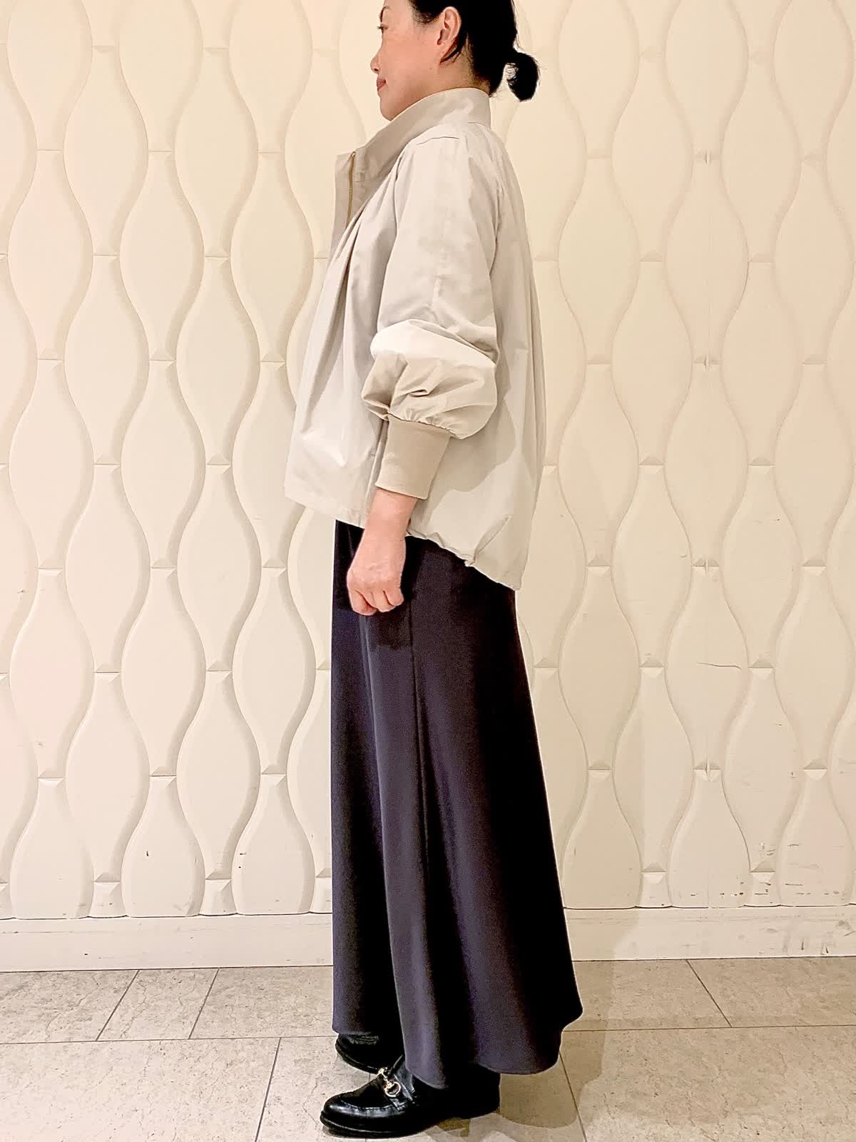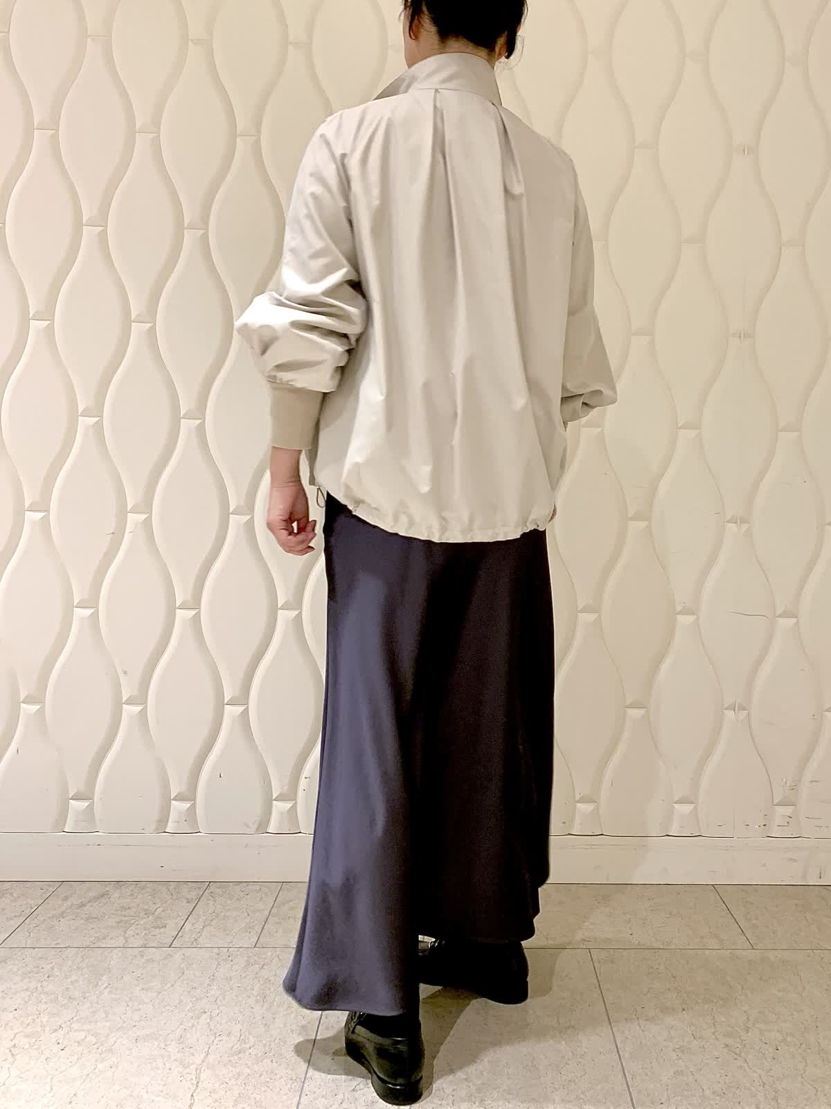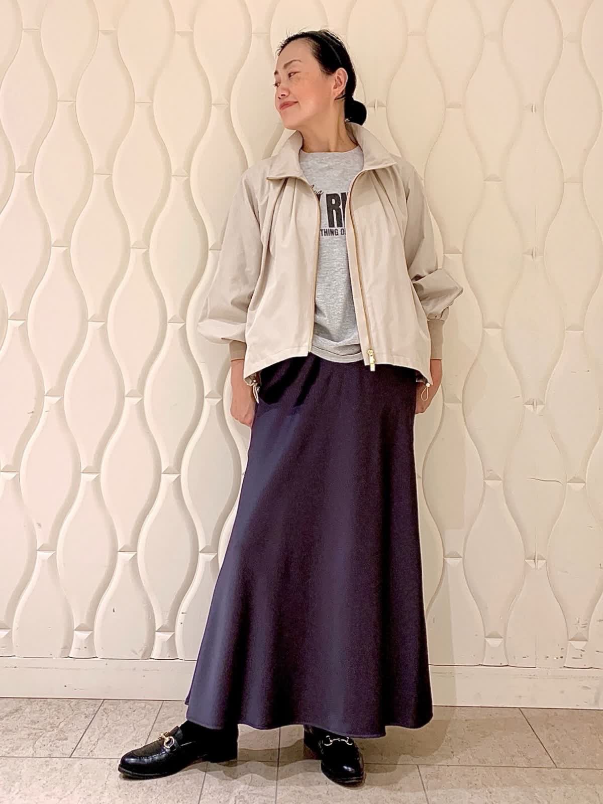 【着用サイズ】全て9号 【着用カラー】ブルゾン:ベージュ カットソー:グレー スカート:チャコールグレー 身頃のタックや袖口のギャザーのディテールが効いたブルゾンはシャツ感覚で羽織れるのでそろそろ出番です。ニュアンスカラーでまとめて優しげなスポーティスタイル。サテンスカートは総ゴムでウエストを下目にして長めに穿いています。