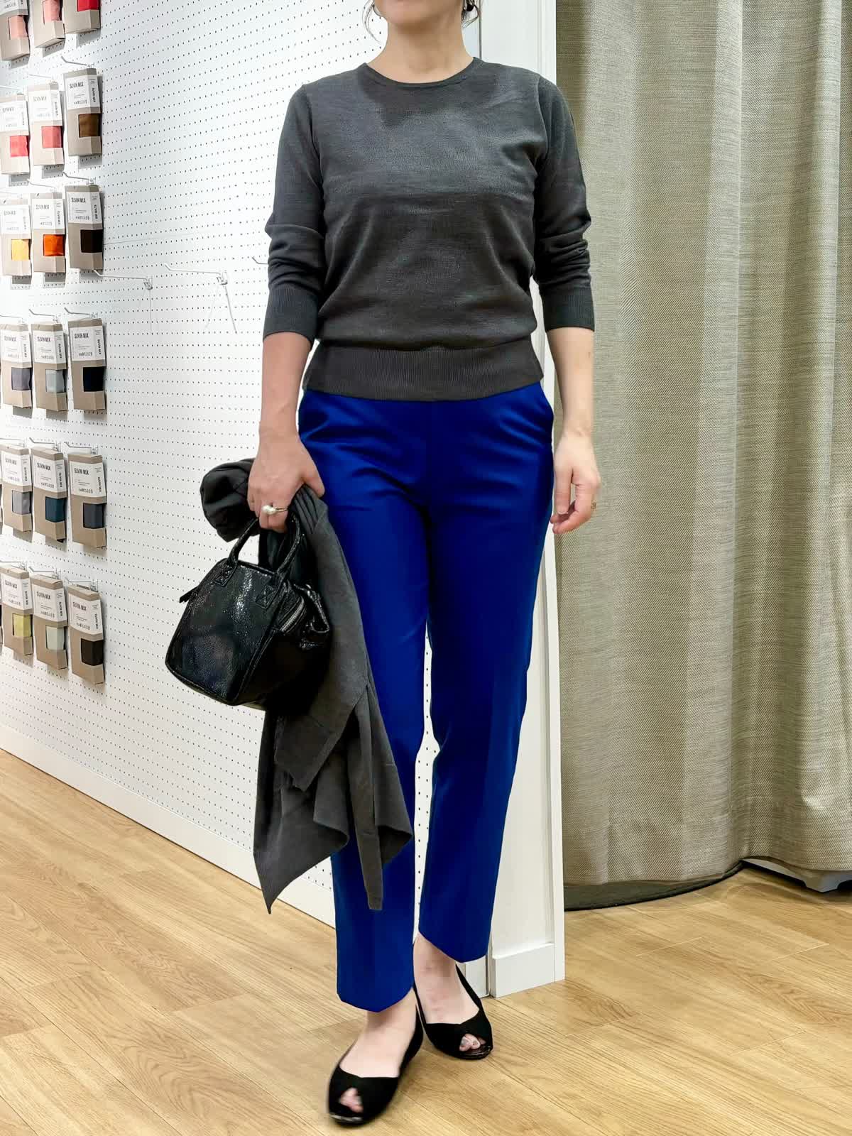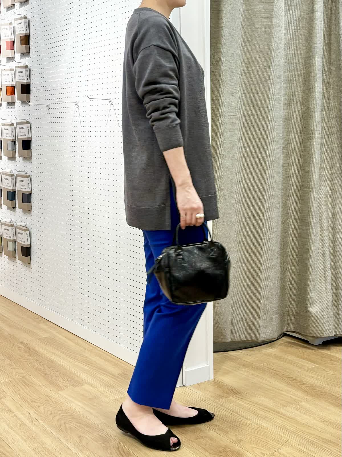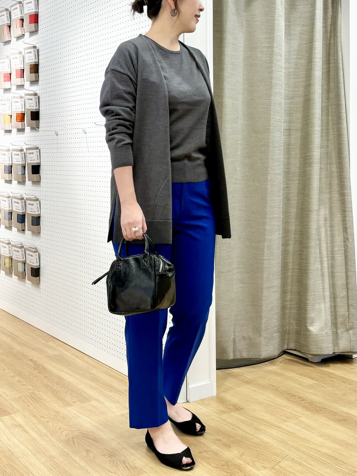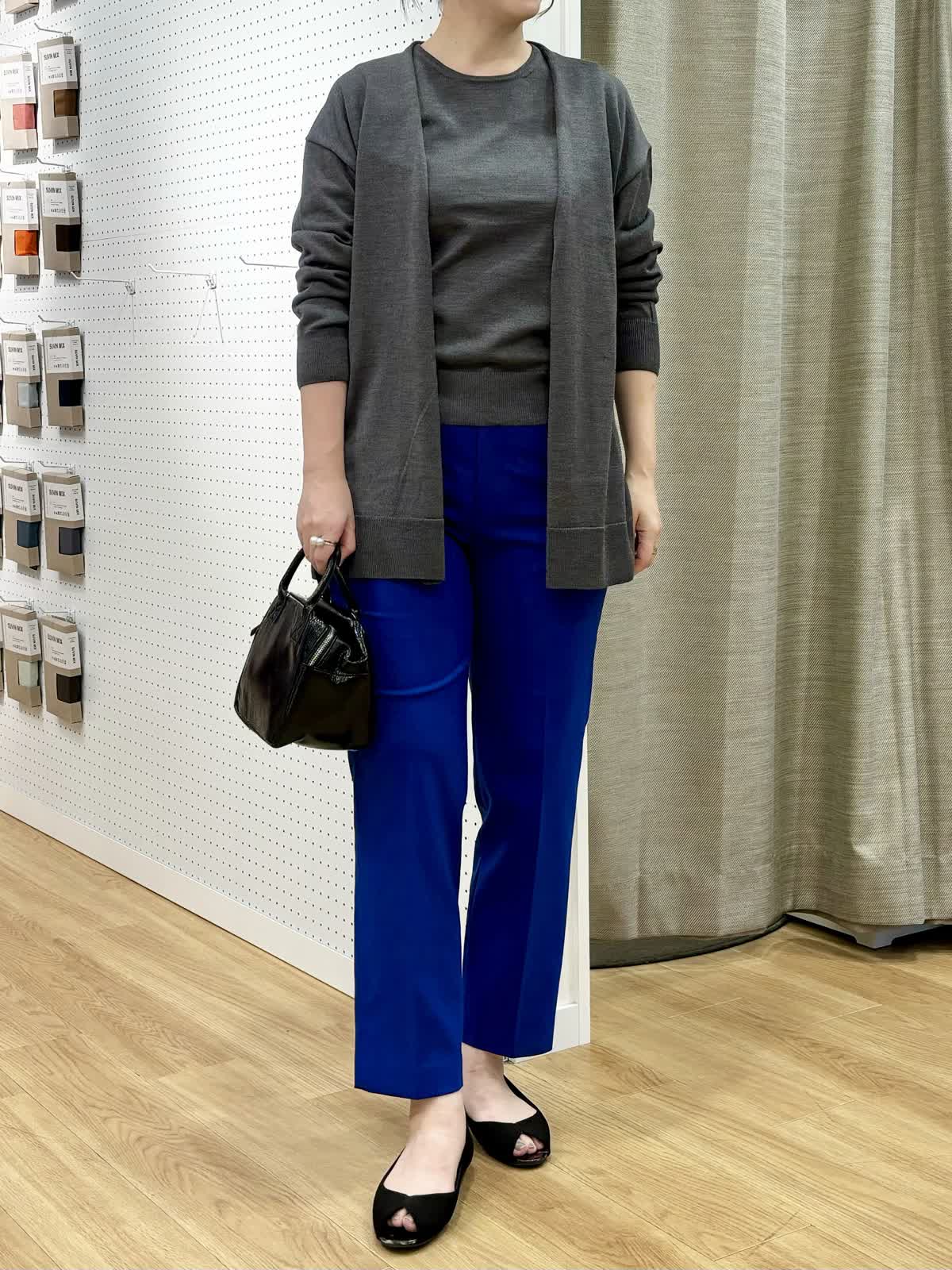 【着用カラー/サイズ】ニット:グレー/11号 カーディガン:グレー/フリー パンツ:ブルー/11号 オフィスカジュアルコーデ。イタリアの糸を使用したニットはウール100%なのに肌触りよくリッチ感があります。イッツ定番のベーシックテーパードパンツはカラーバリエ豊富で色違いで気分を変えて持つのもオススメです。