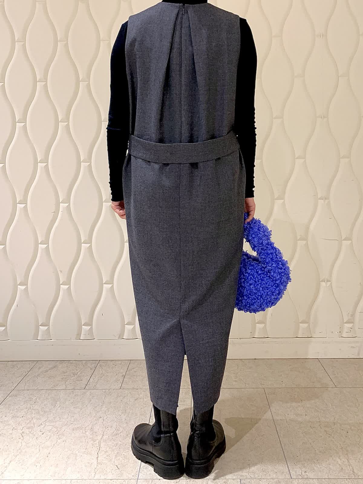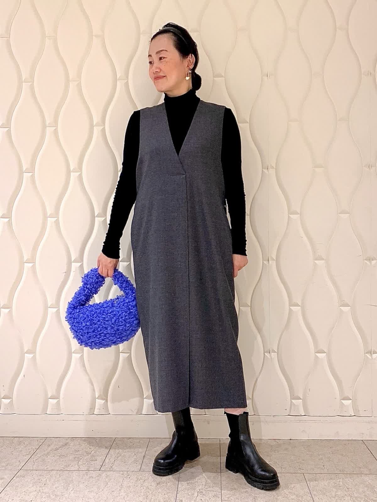 【着用サイズ】全て9号 【着用カラー】ワンピース:チャコールグレー カットソー:ブラック ボディラインを拾わず楽にきれいな三尋木さんコラボワンピース。辛口モードに着たかったのでアクセはアデルのピアスのみ。骨格ストレートの私はVゾーンの開きが広くシャープに見えるのが嬉しいポイントです。背面のタックづかいやサイドのゴールドの金具など、ディテールがドラマティック!