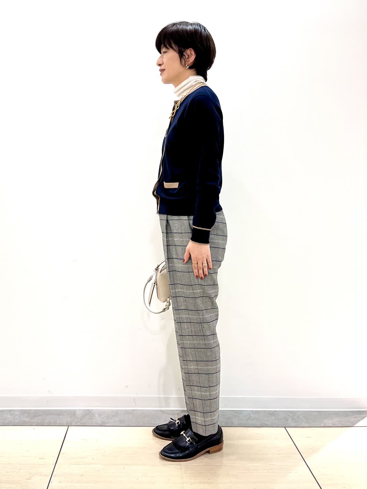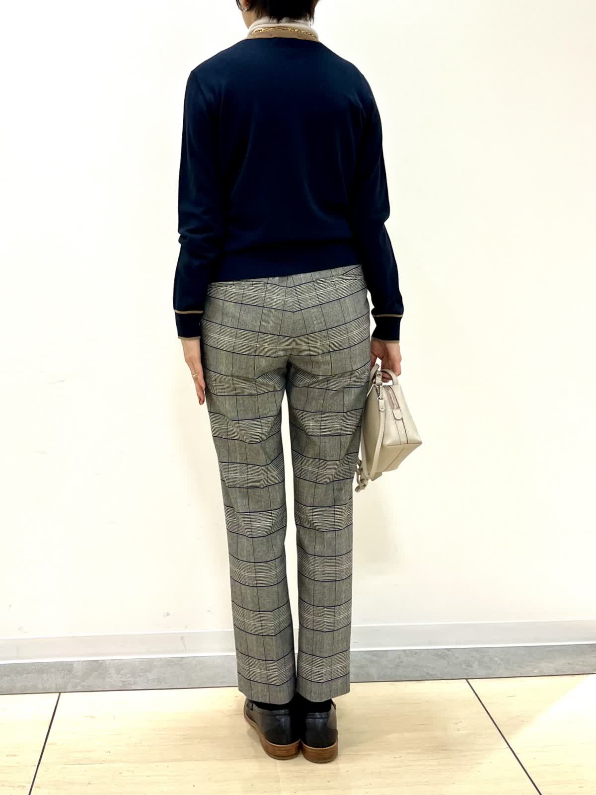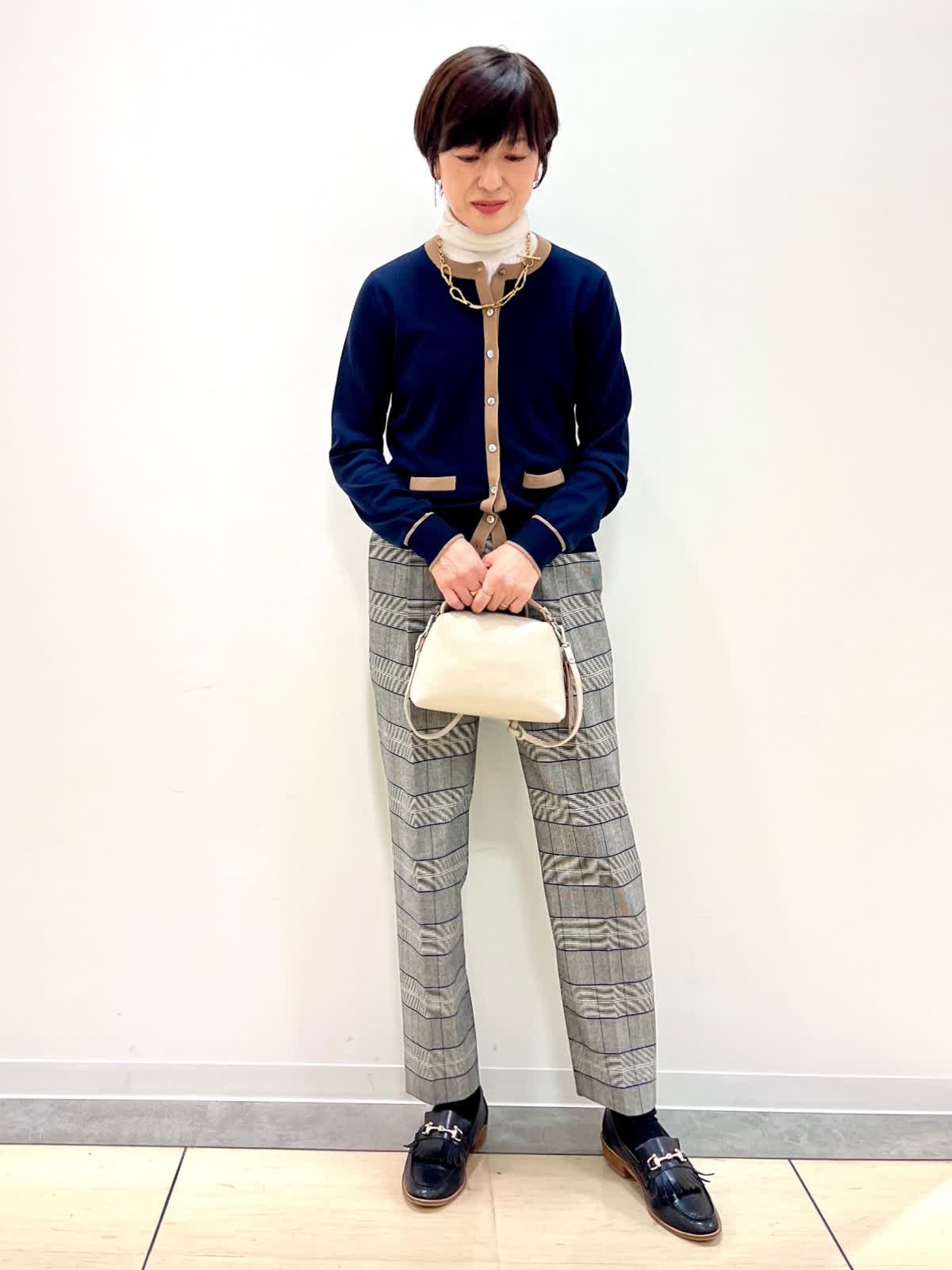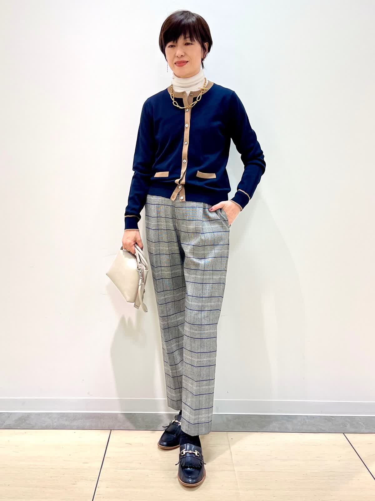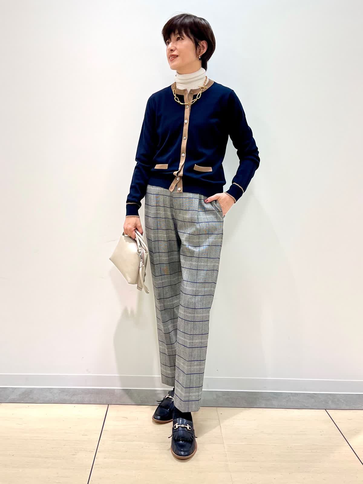 [着用サイズ]ニット:9号 カーディガン:9号 パンツ:9号 [着用カラー]ニット:オフホワイト カーディガン:ネイビー パンツ:グレンチェック パイピングがオシャレなカーディガンは季節の変わり目に羽織りで使えます。ボダンを閉じてプルオーバーでもかわいいです。ウール混紡の美脚パンツはストレッチが効いててはきやすいです。裾に向かって緩やかにテーパードしてます。