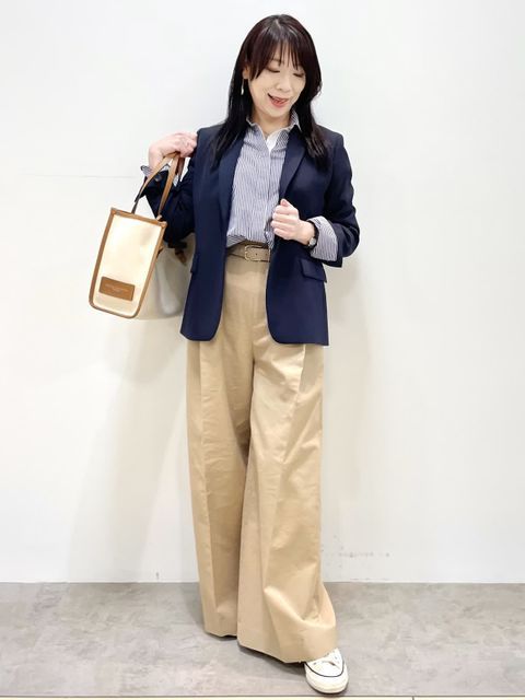 【着用サイズ】ジャケット:9号、パンツ:9号、ニット:9号【着用カラー】ジャケット:ネイビー、パンツ:ネイビー、ニット:ベージュ お仕事にオススメのスーツスタイル。ダブルブレストジャケットにカーゴパンツのさりげなくデザイン性があるスーツには、スッキリとタートル合わせ。お仕事でデイリーに使えて、お家て洗えるイージーケアかうれしいです。