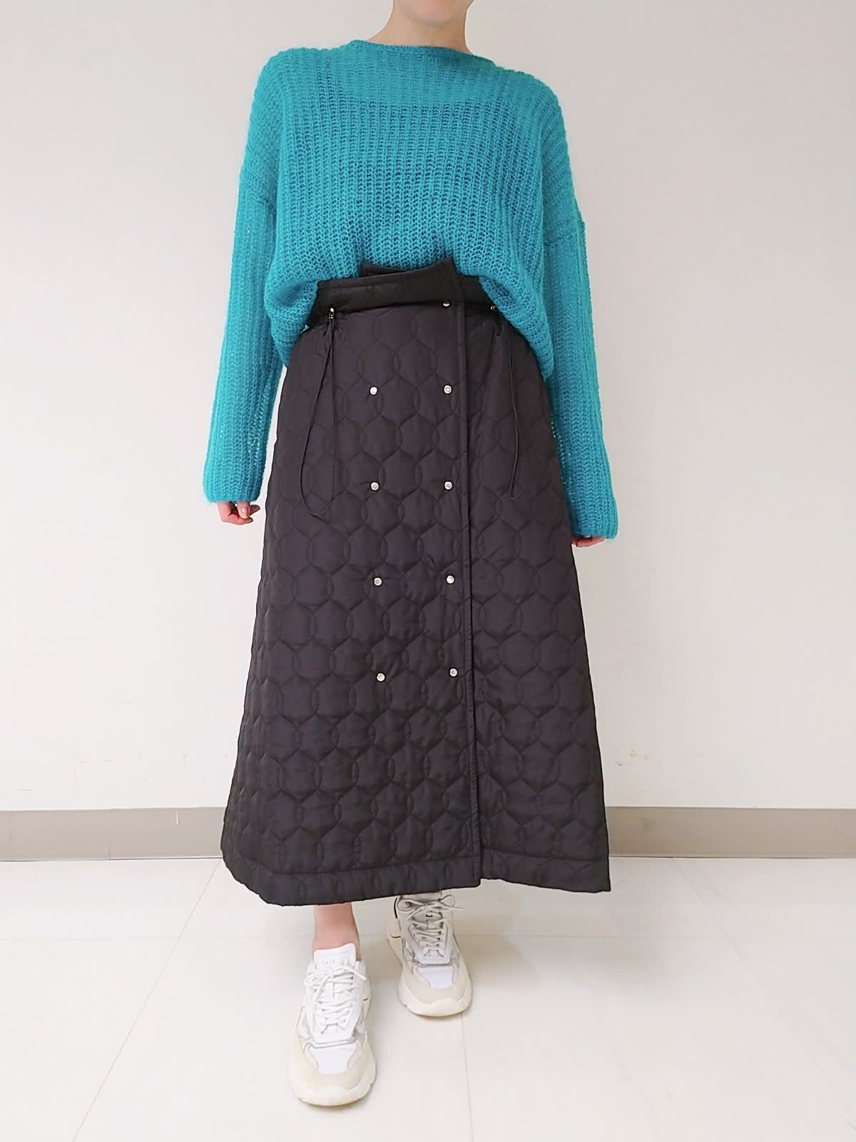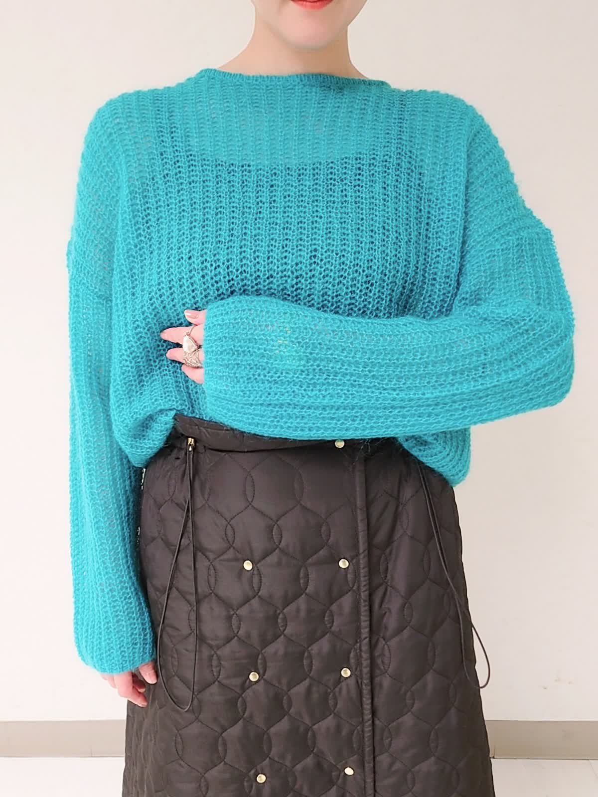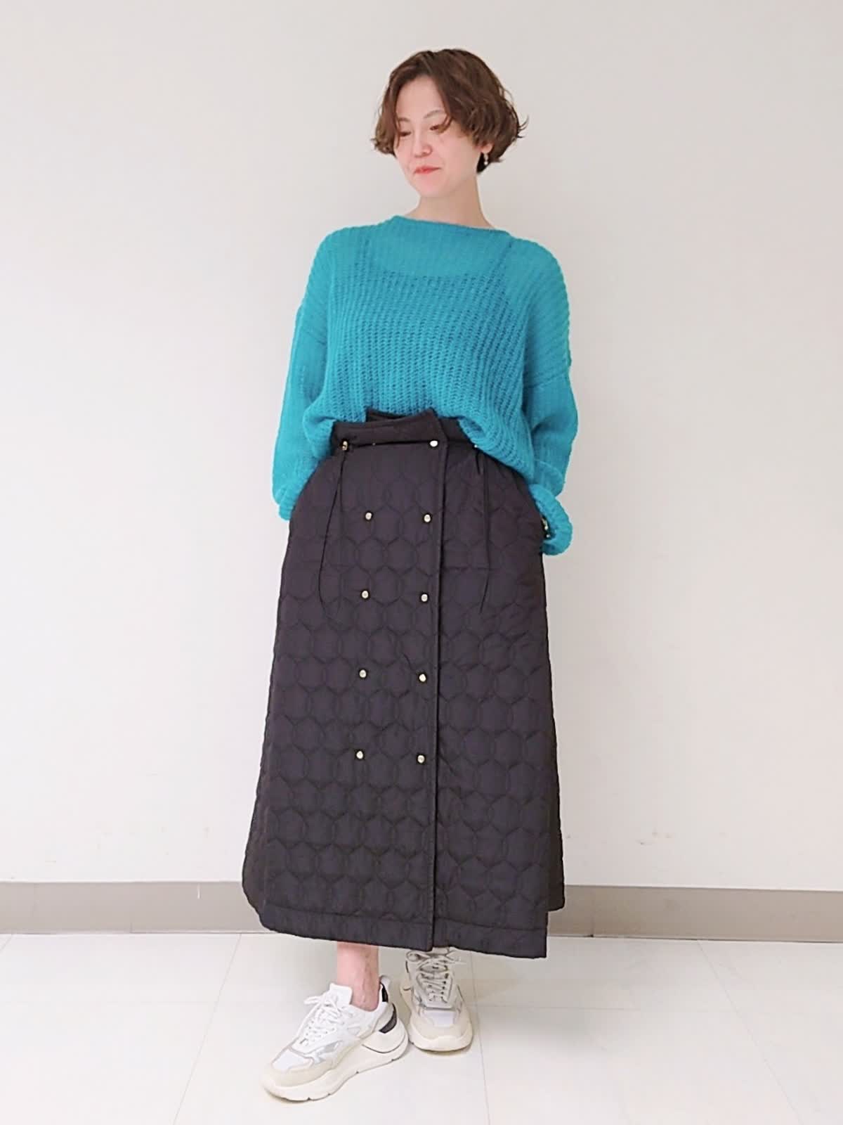 【着用サイズ】ニット:9号 スカート:9号【着用カラー】ニット:ターコイズブルー スカート:ブラック 秋のお出かけコーデ。ニットは毛足は長めですが、ざっくり編んであるので透け感もあり、見た目はスッキリ見えます。丈が短めなので、ボリュームのあるキルティングスカートの相性も抜群です。