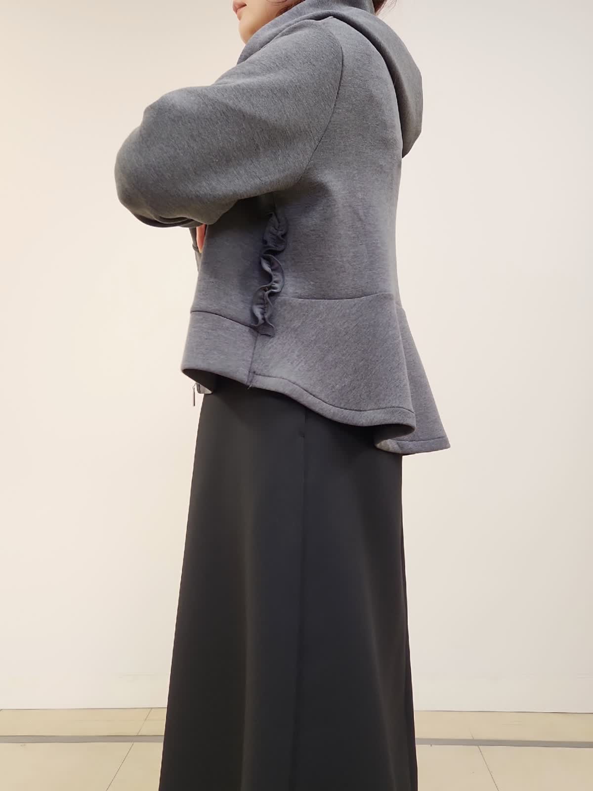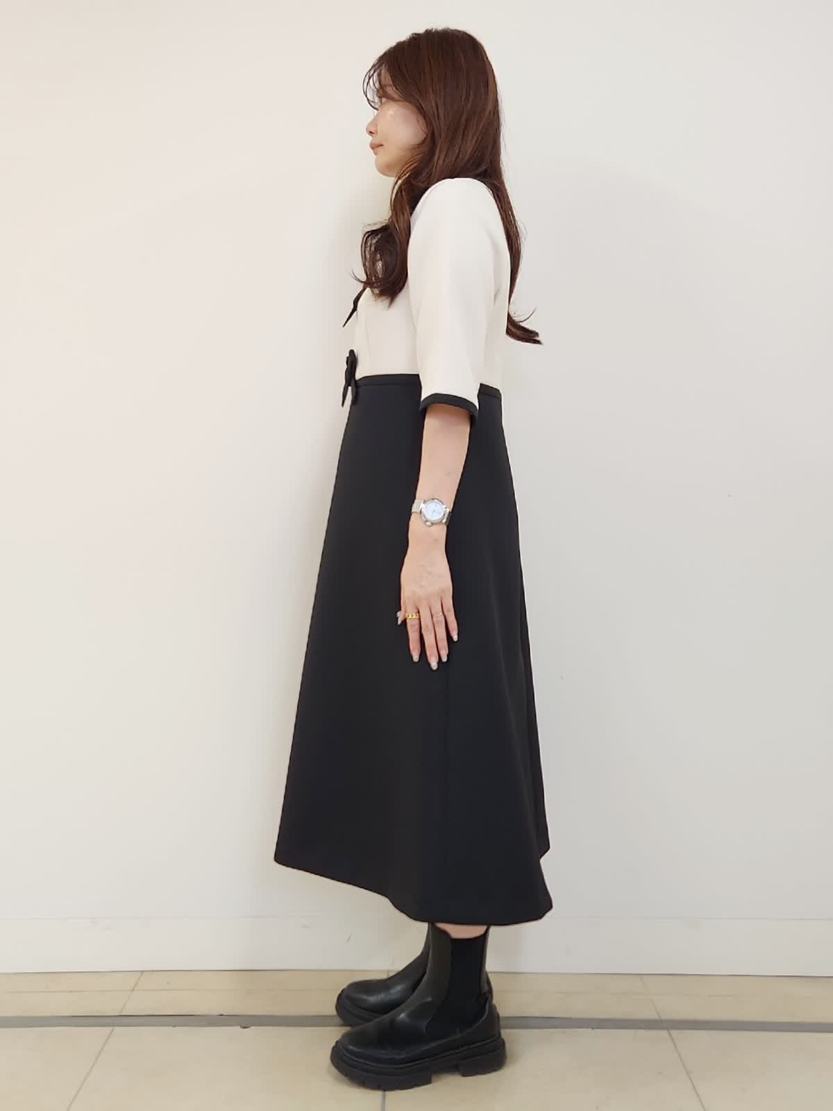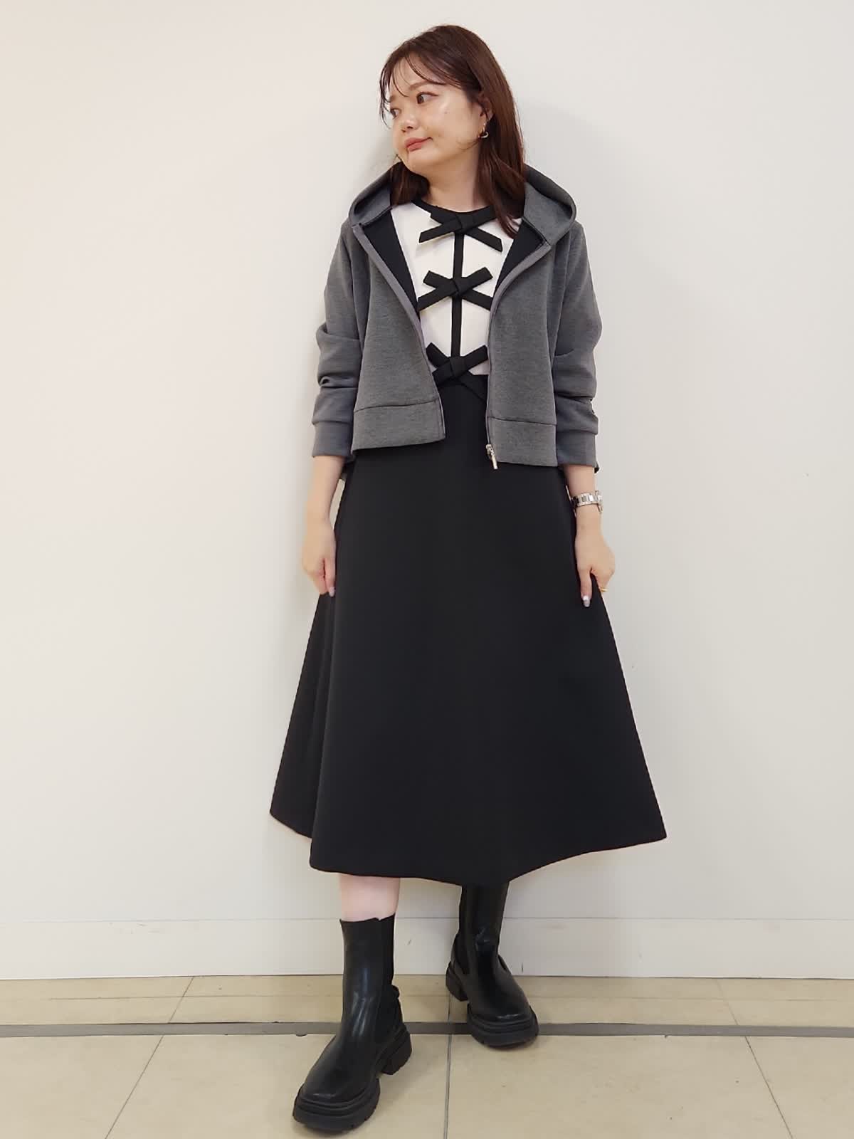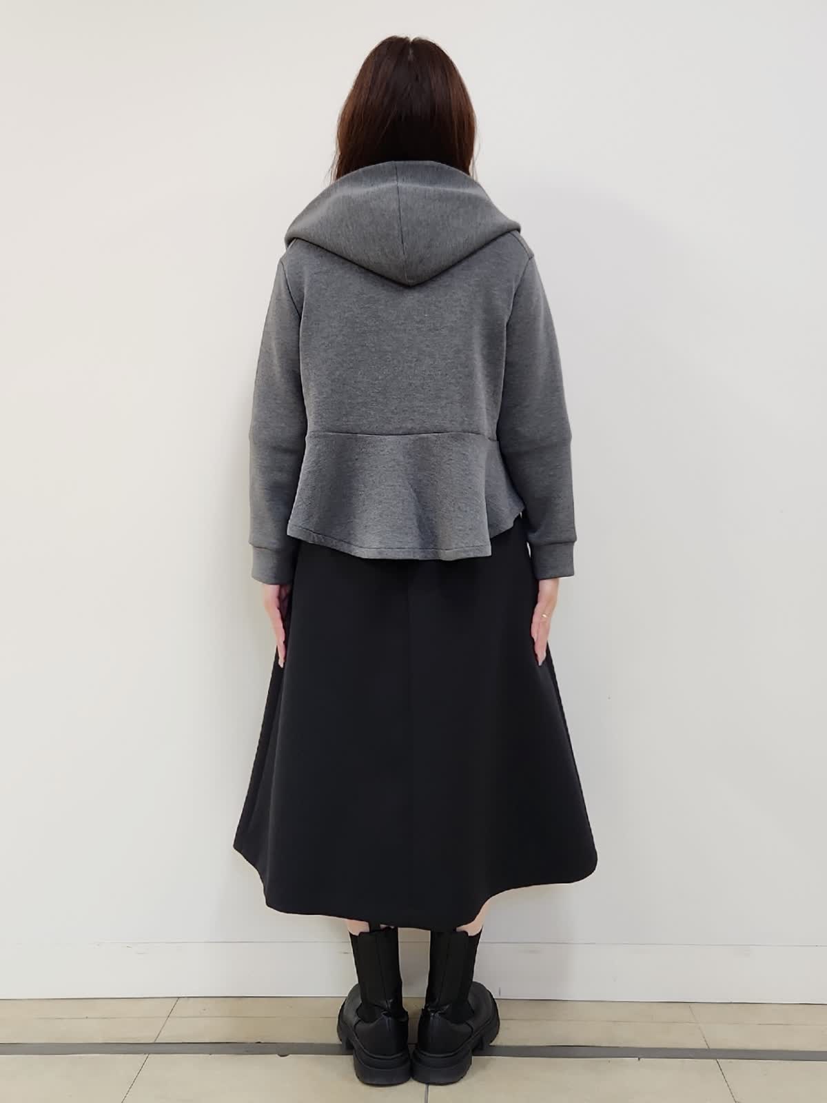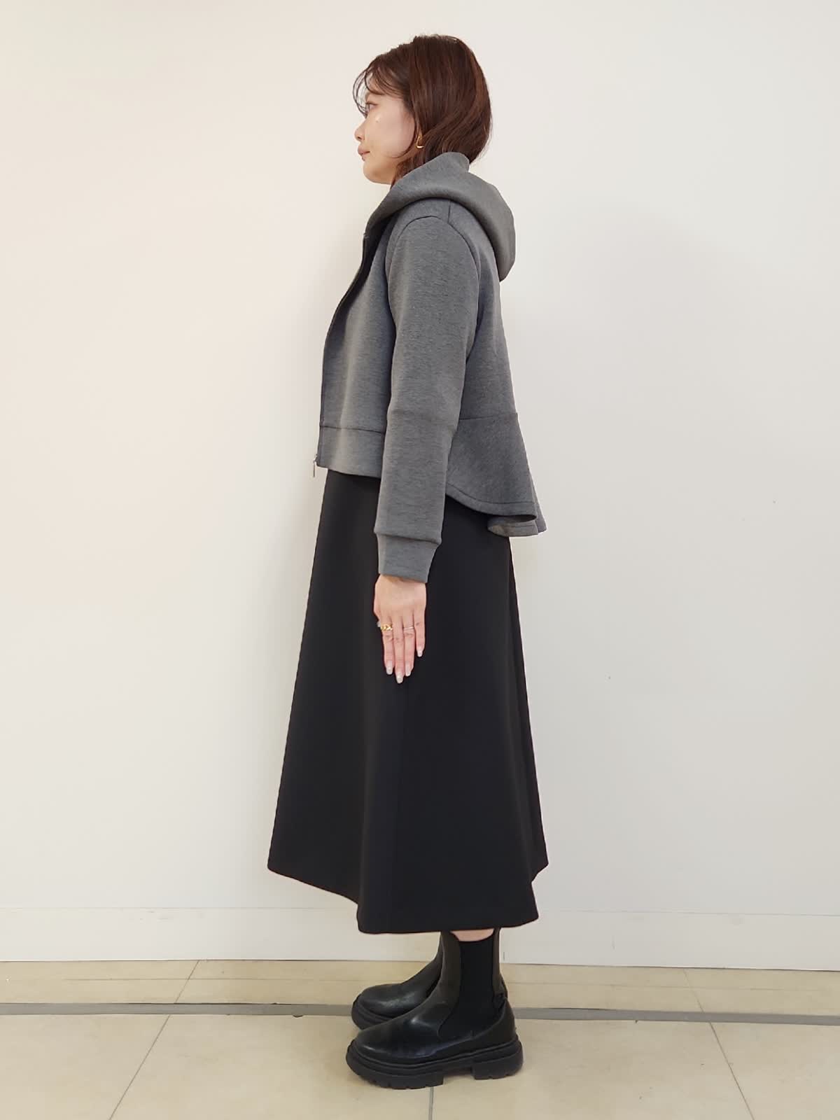 【着用サイズ】パーカー:9号/チャコールグレー ワンピース:9号/ブラック M Maglie le cassette × 冨張さんコラボワンピース。パーカーとサイドゴアブーツを合わせたデイリーな着こなしも新鮮でおすすめです。パーカーは柔らかく伸縮性があるので袖ありワンピースと重ねてもOK◎お気に入りのモノトーンコーデです。