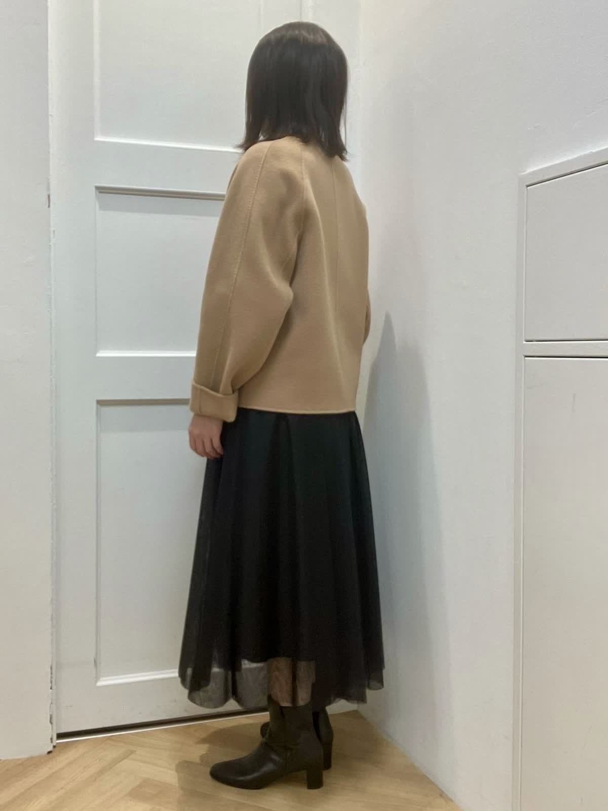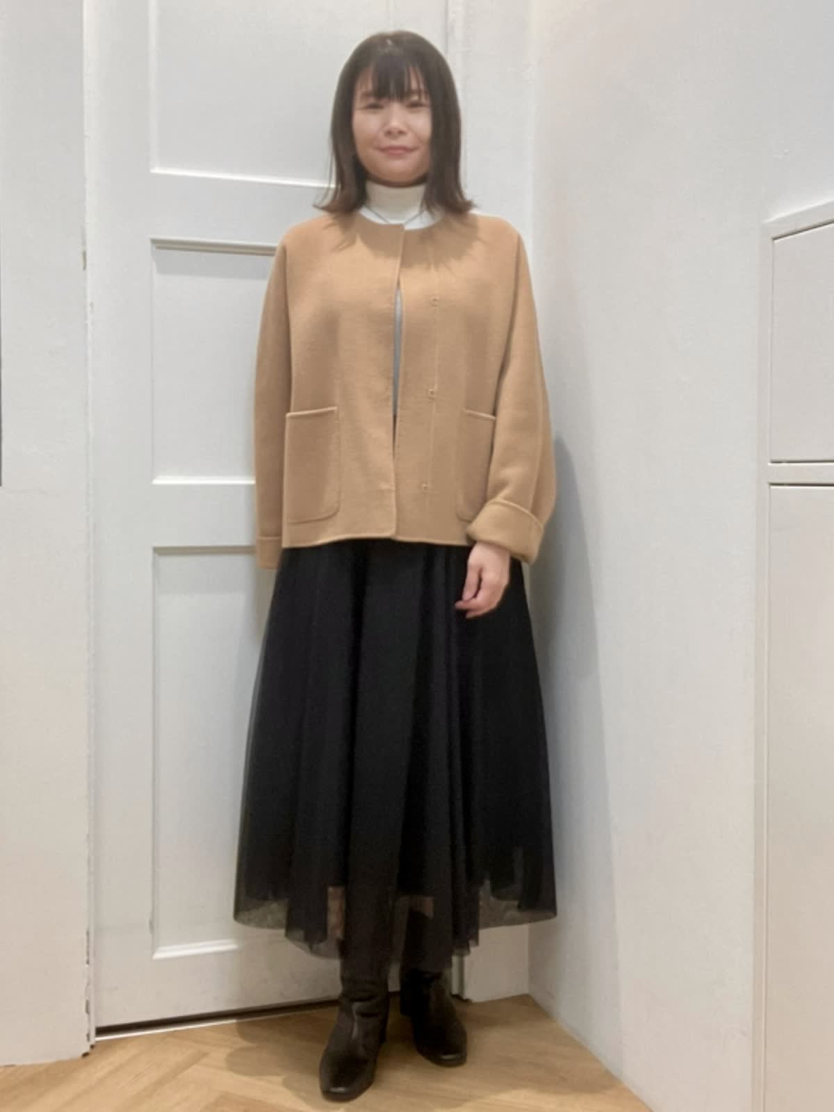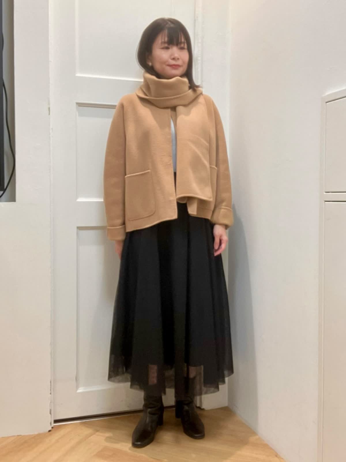 【着用サイズ】全て9号 【着用カラー】ジャケット:キャメル ニット:アイボリー スカート:ブラック ストール付コートは1枚仕立てで、とにかく軽い着心地です。カーディガン感覚で着て頂けて、ショート丈なのでスカートやワイドパンツと相性抜群。チュールスカート合わせでフェミニンコーデにしました。