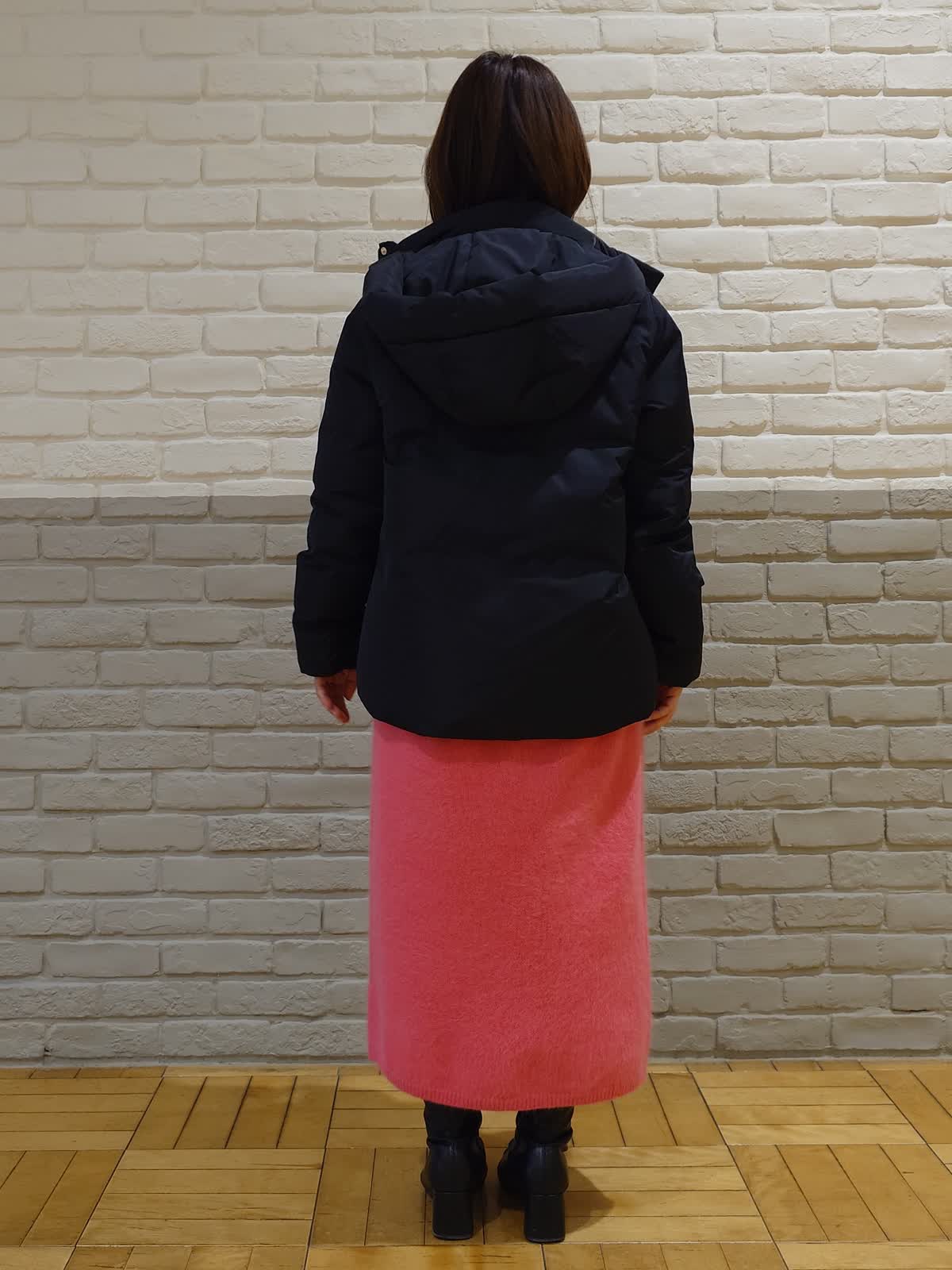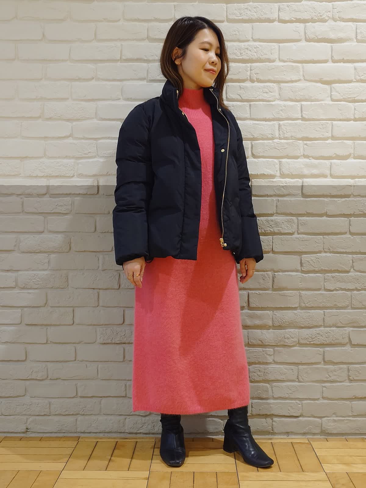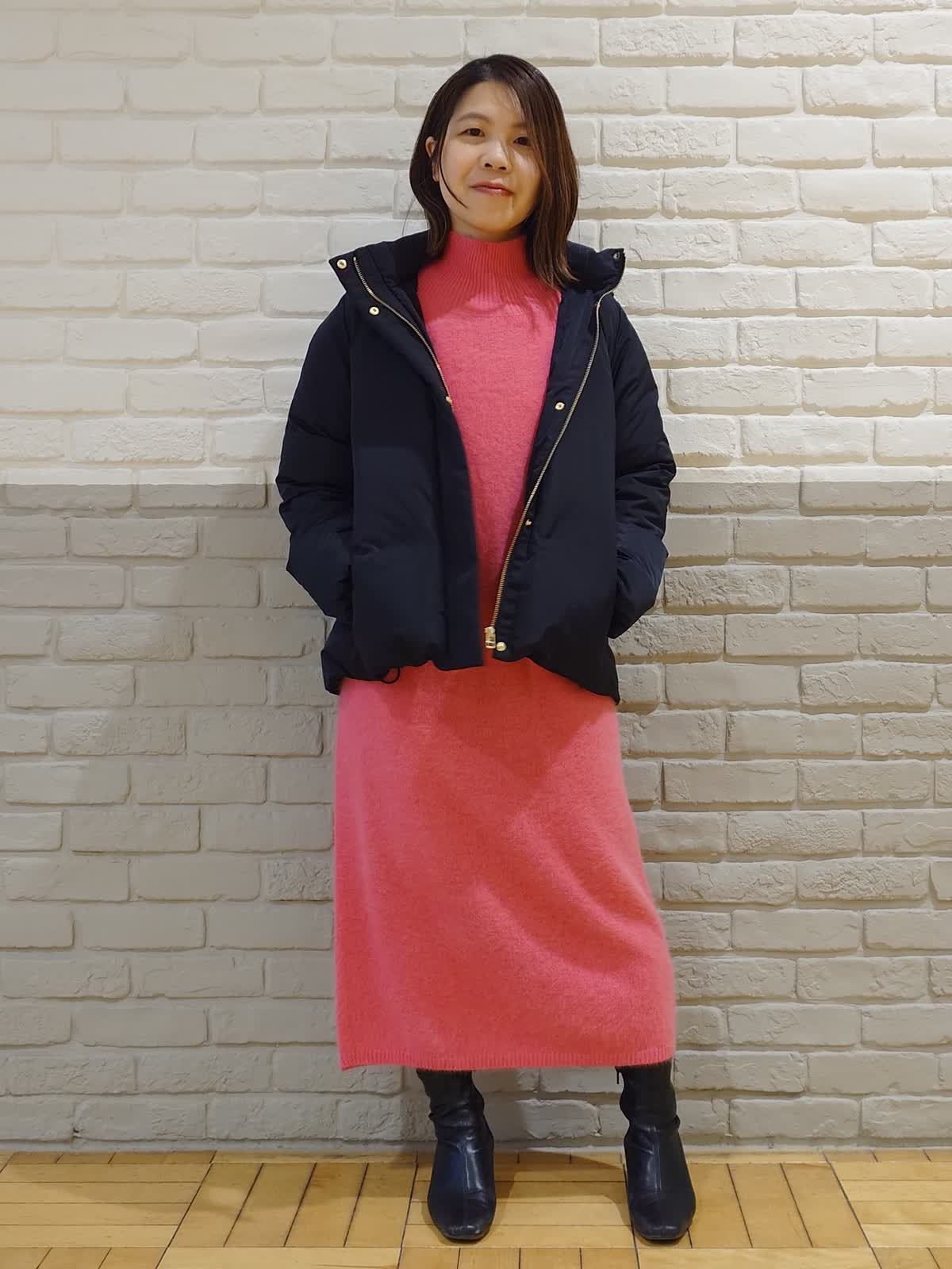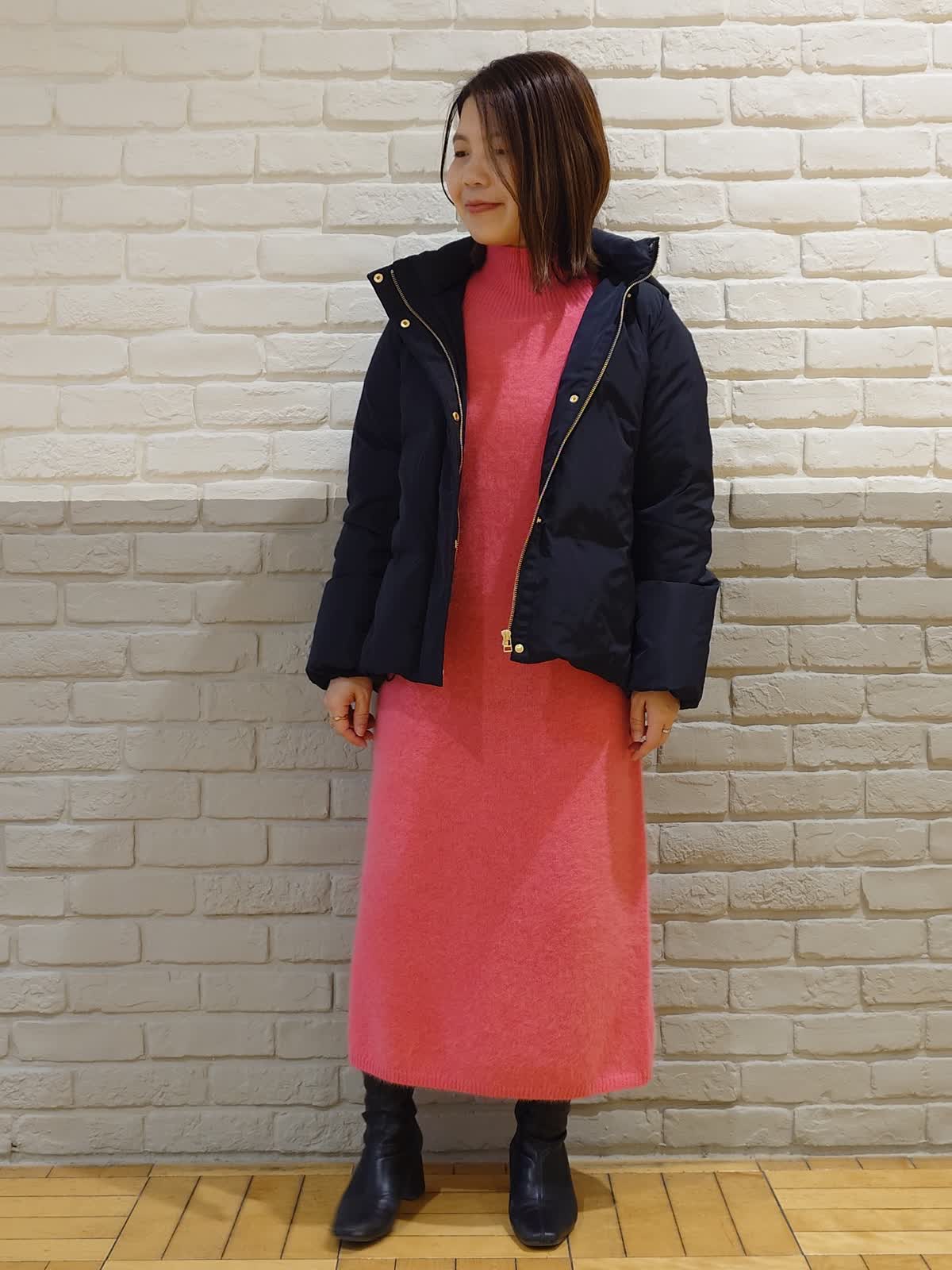 【着用サイズ】ダウン:7号 ニットワンピース:9号 【着用カラー】ダウン:ブラック ニットワンピース:チェリーピンク ブラック×ピンクのちょっぴりモードなコーディネート。フードは取り外し可能な2way仕様で着こなしの幅を広げてくれます。前後差のある着丈でお尻はしっかり隠れるのでパンツ合わせでも安心!ふわふわなピンクのニットワンピースはお友達とのお出かけやデートでも活躍してくれる褒められワンピースです。