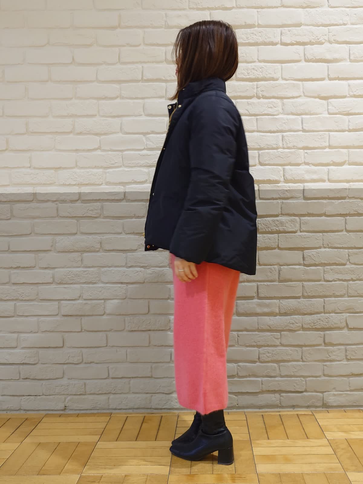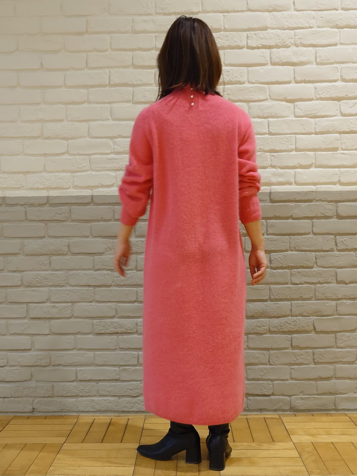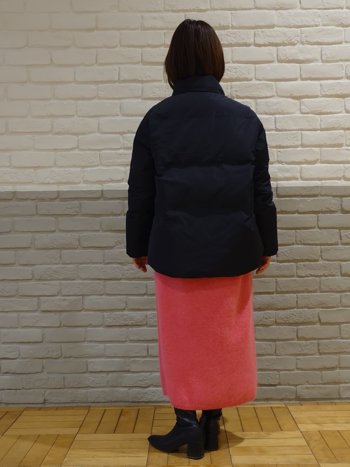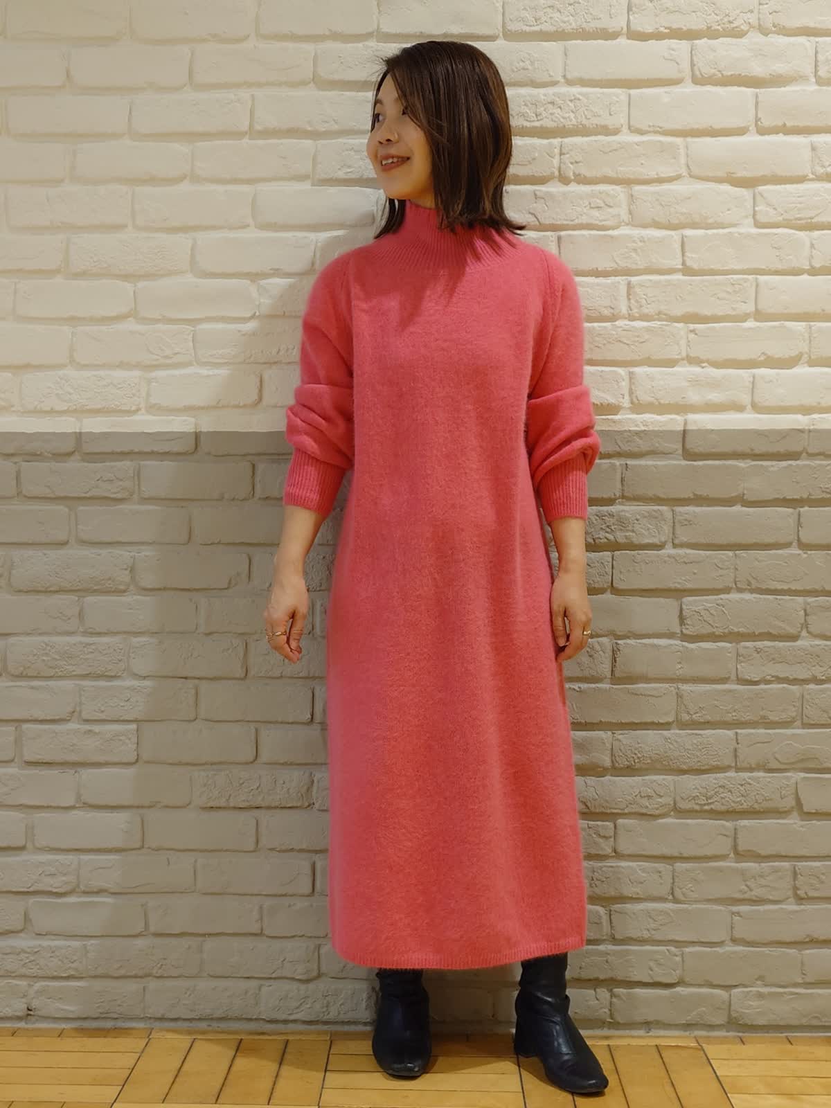 【着用サイズ】ダウン:7号 ニットワンピース:9号 【着用カラー】ダウン:ブラック ニットワンピース:チェリーピンク ブラック×ピンクのちょっぴりモードなコーディネート。フードは取り外し可能な2way仕様で着こなしの幅を広げてくれます。前後差のある着丈でお尻はしっかり隠れるのでパンツ合わせでも安心!ふわふわなピンクのニットワンピースはお友達とのお出かけやデートでも活躍してくれる褒められワンピースです。