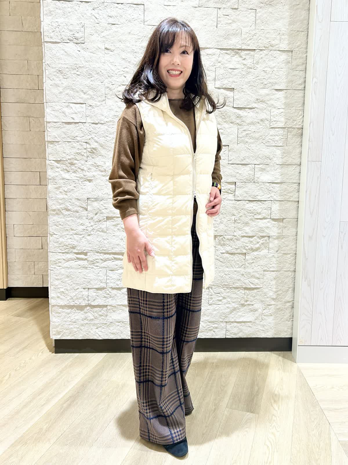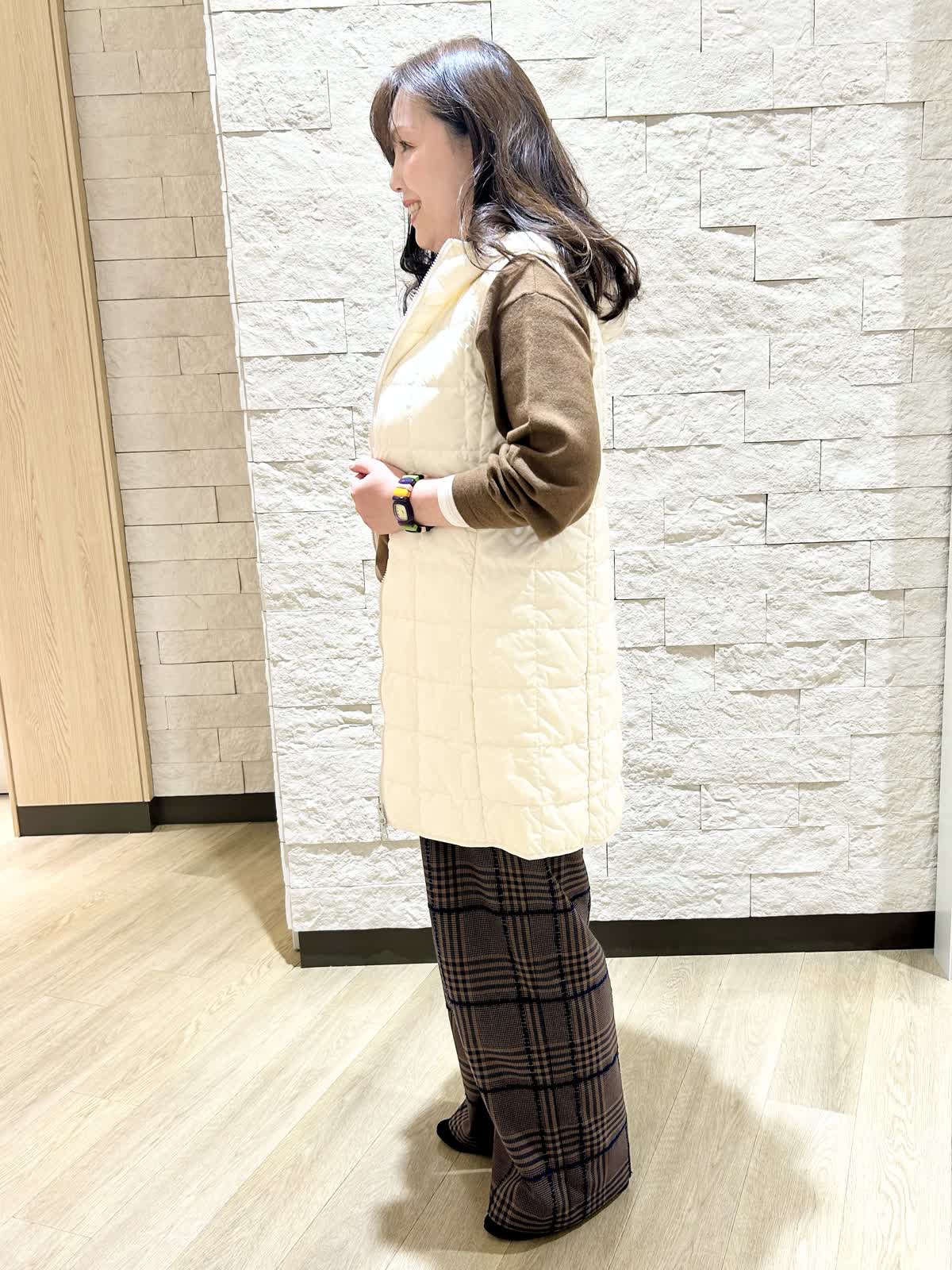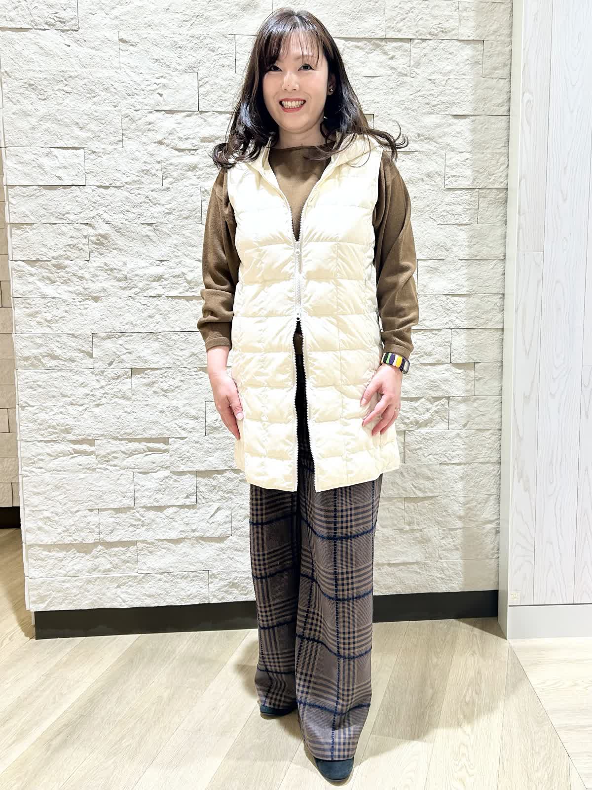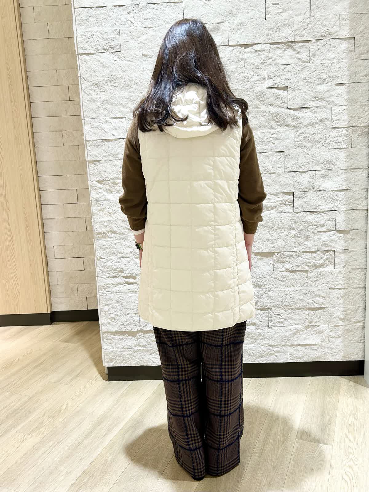 【着用カラー.サイズ】 アイテム:ダウンベスト カラー:オフホワイトサイズ: 9号 アイテム:パンツ カラー:ダークブラウン サイズ:11号 ダウンベストはタイトな作りでインナーベストとしても活躍できます。 ダブルファスナーなので座ったりする時にも便利です。