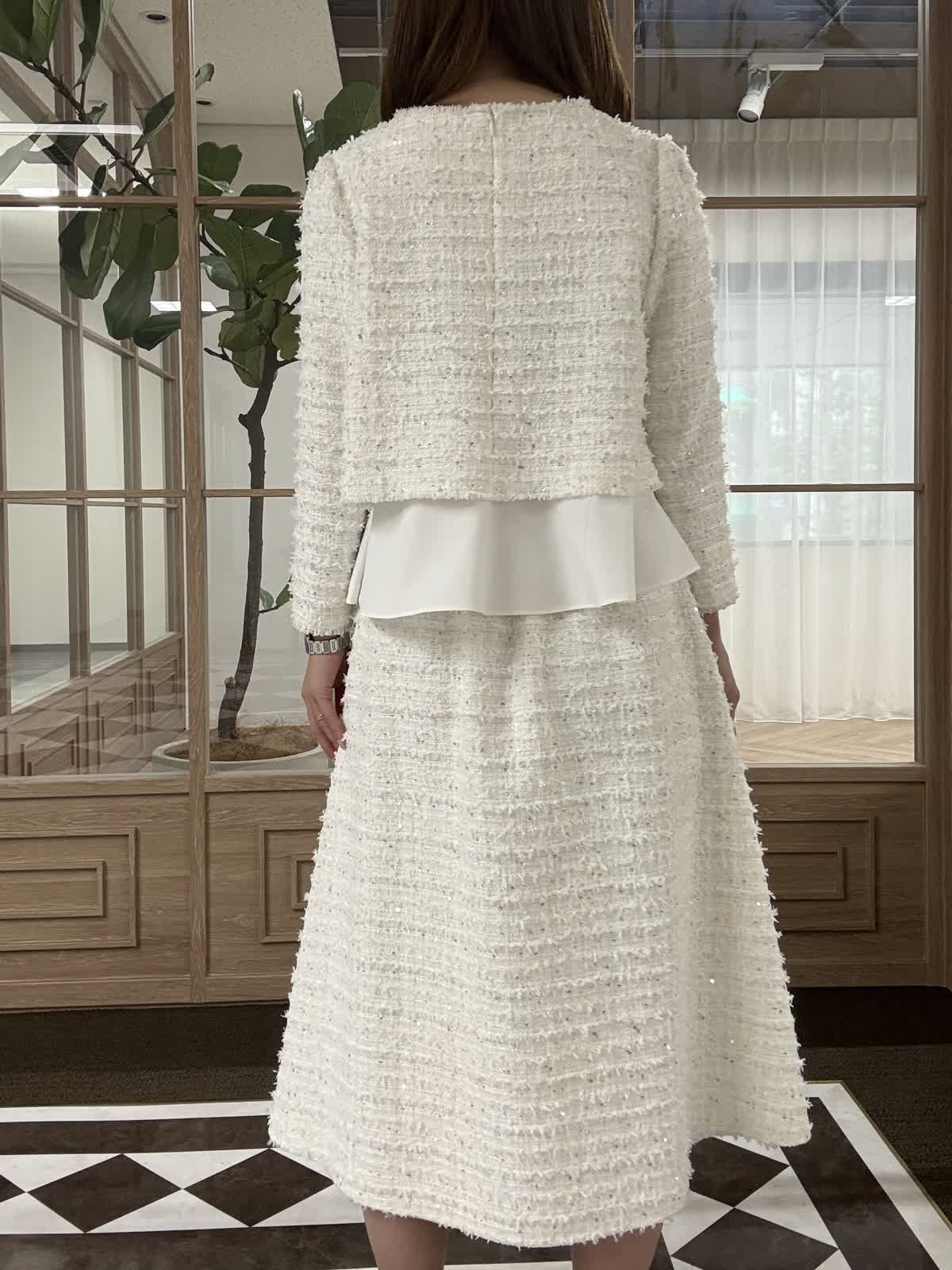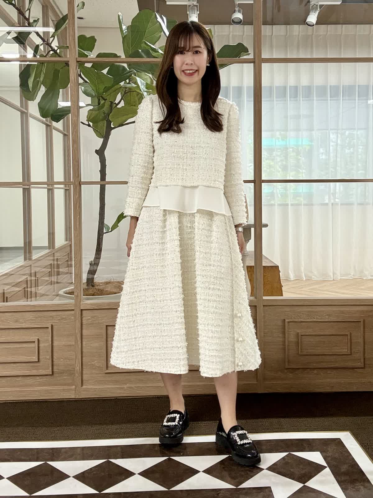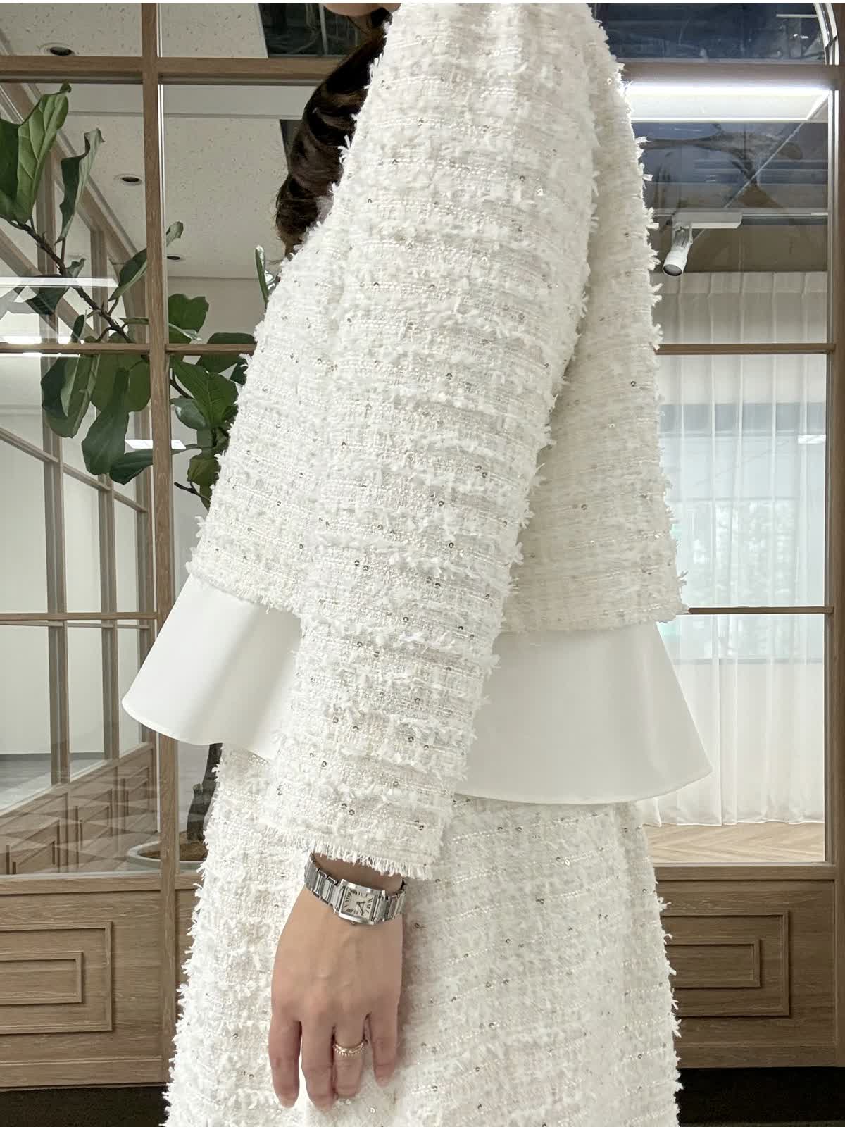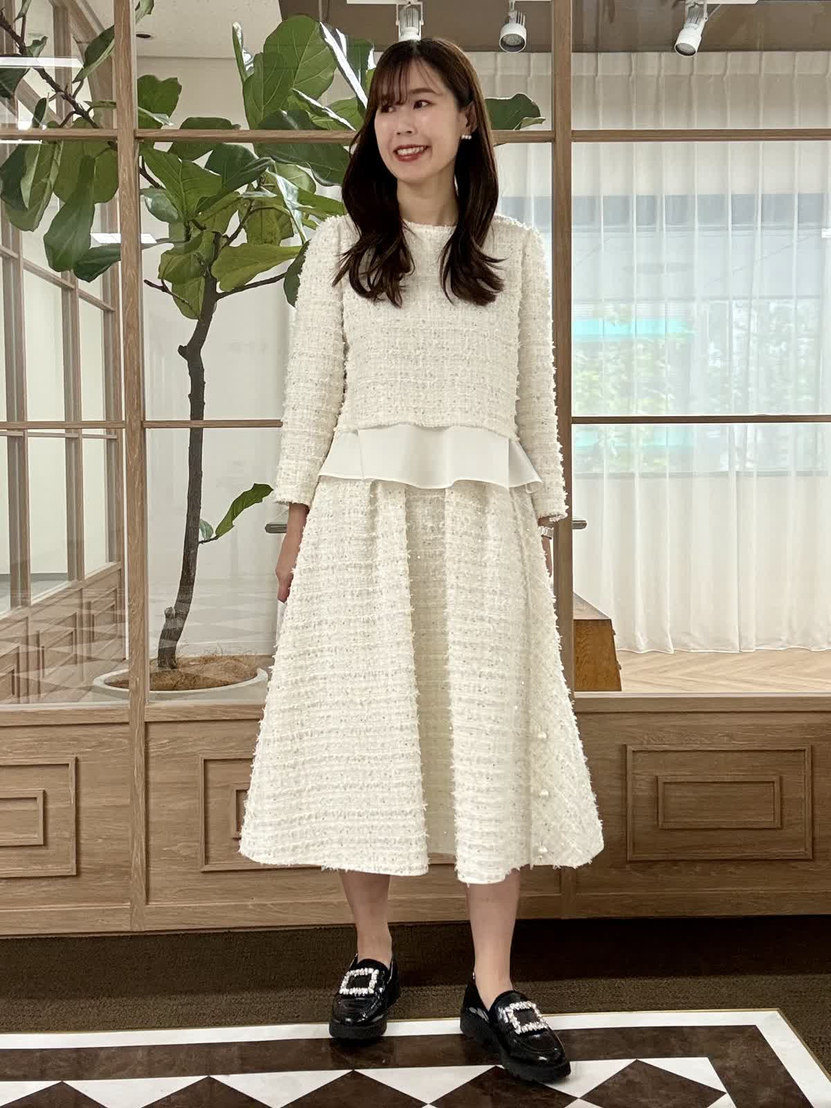 【着用アイテム】 ブラウス:7号 スカート:7号 スパンコールのキラキラが華やかなツイードのセットアップ。 ブラウスはウエスト下の別布をインして、ショートトップスにすることでバランスの変化を楽しめる仕様になっています。 セットアップ使いはもちろん、マーリエジーンズと合わせてカジュアルダウンして着て頂くのもおすすめです。