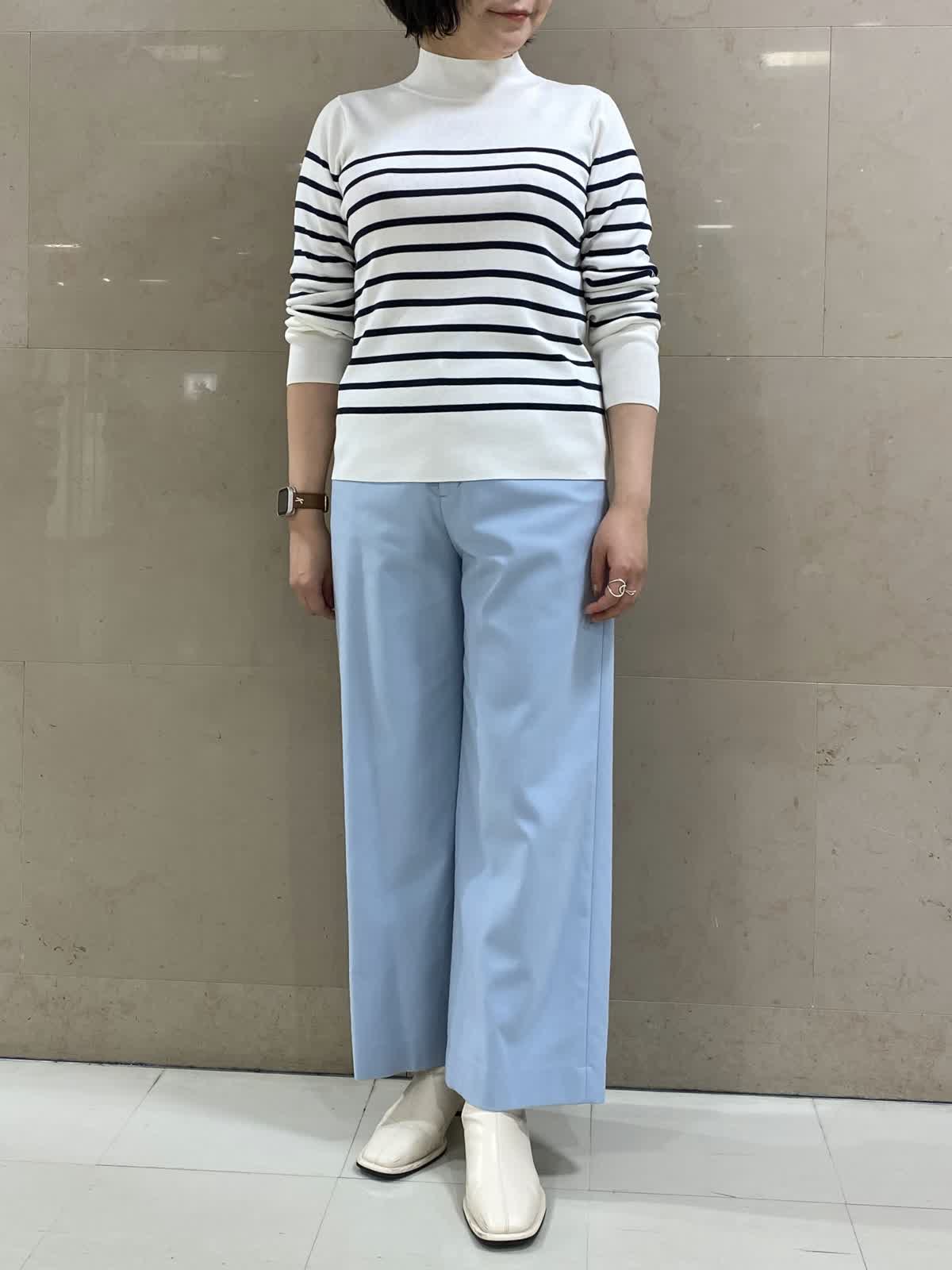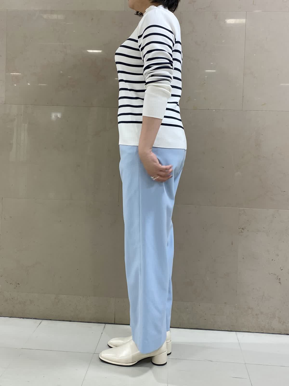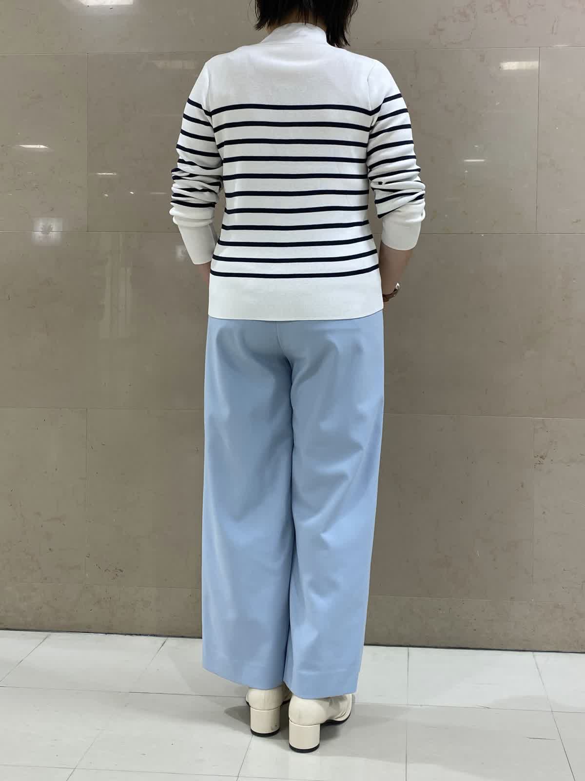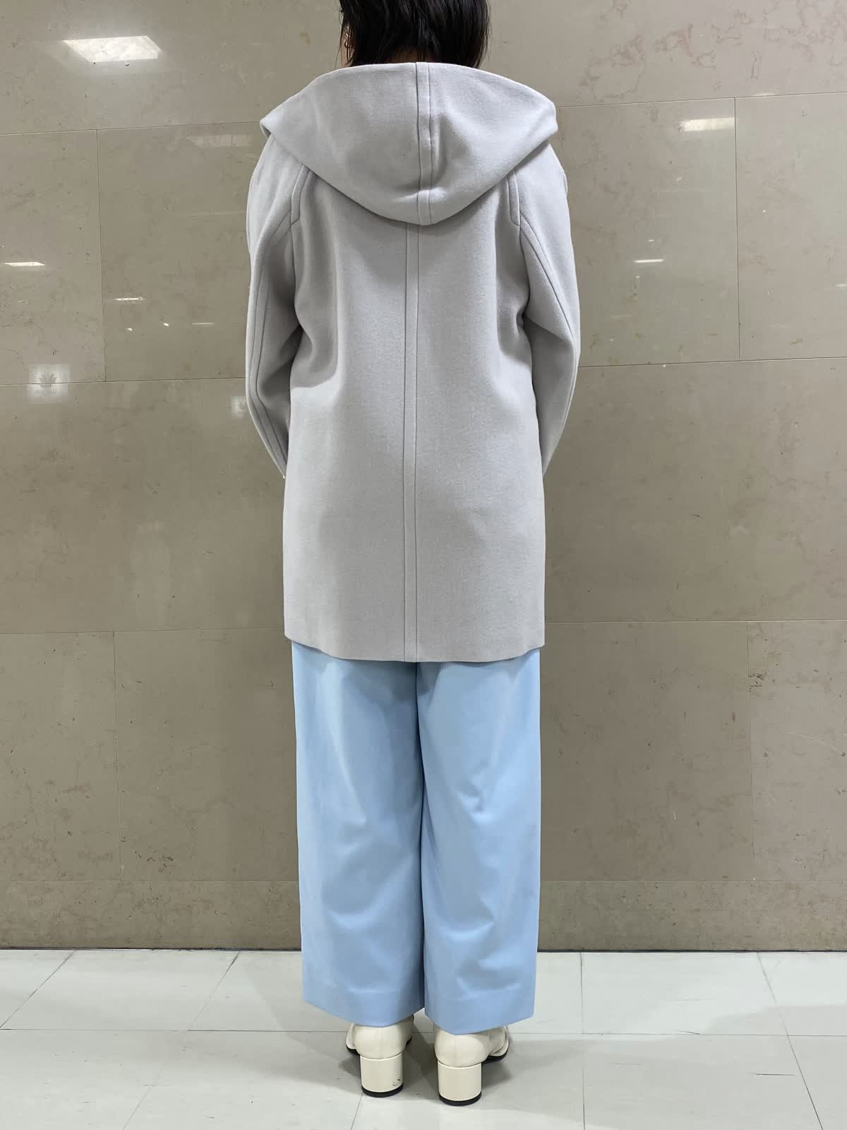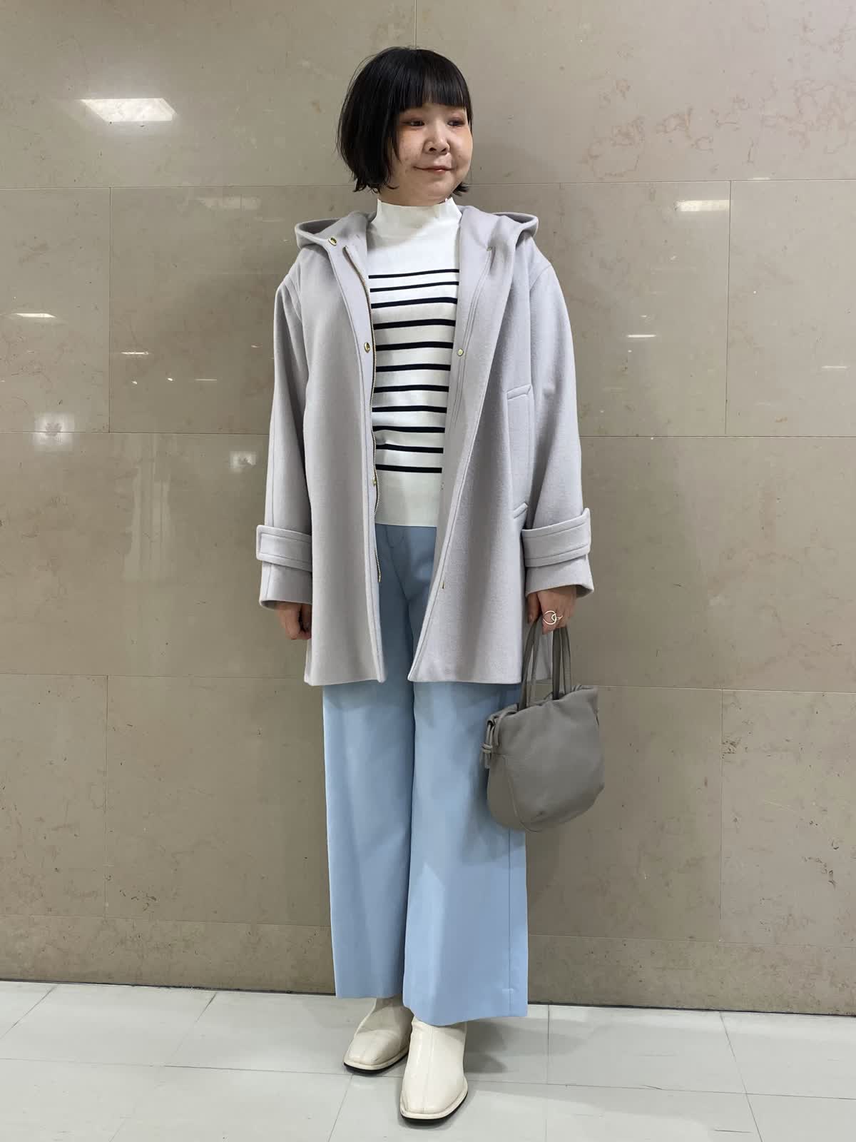 [着用カラー/サイズ]コート:グレーベージュ/9号 ニット:ボーダー/フリーサイズ パンツ:ブルー/11号 ハリのある素材で美しいシルエットのフードコートは、シンプルな中にもステッチなどさりげないポイントが魅力。ボトムスを選ばない着丈で合わせやすく、軽い着心地がおすすめです。いつものスタイリングにプラスできる、日常に溶け込むマストな1枚。