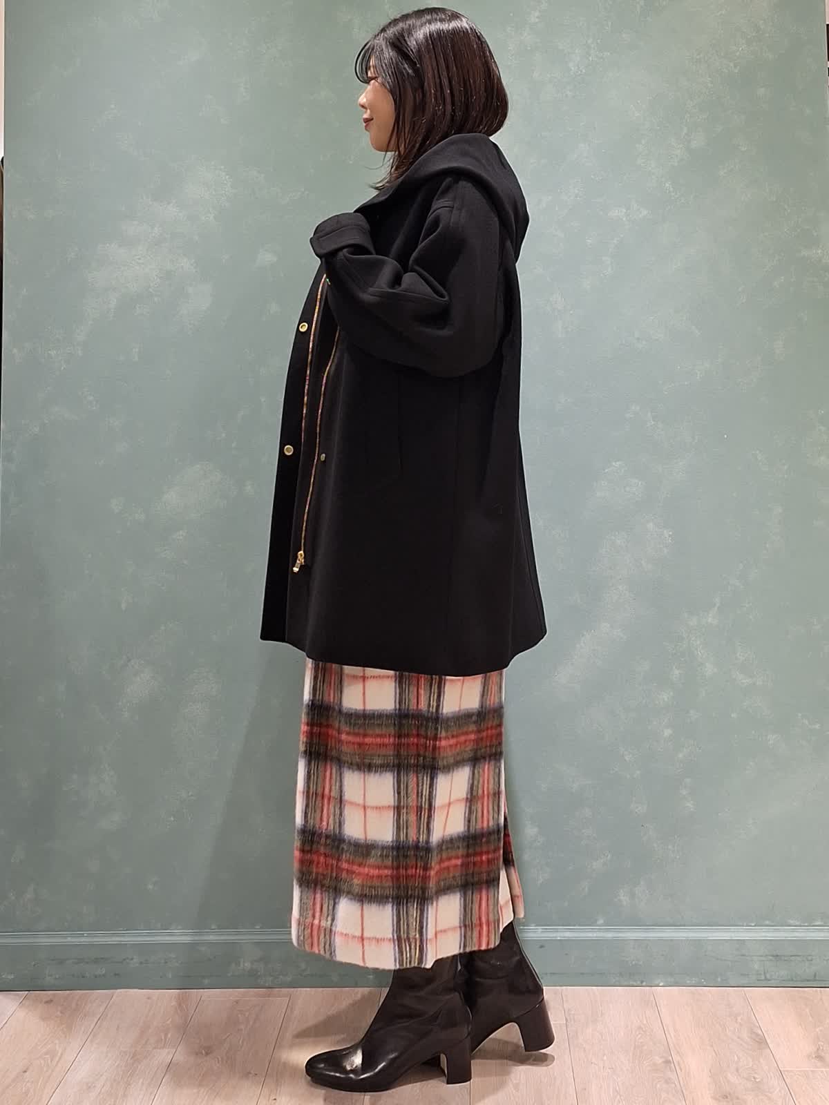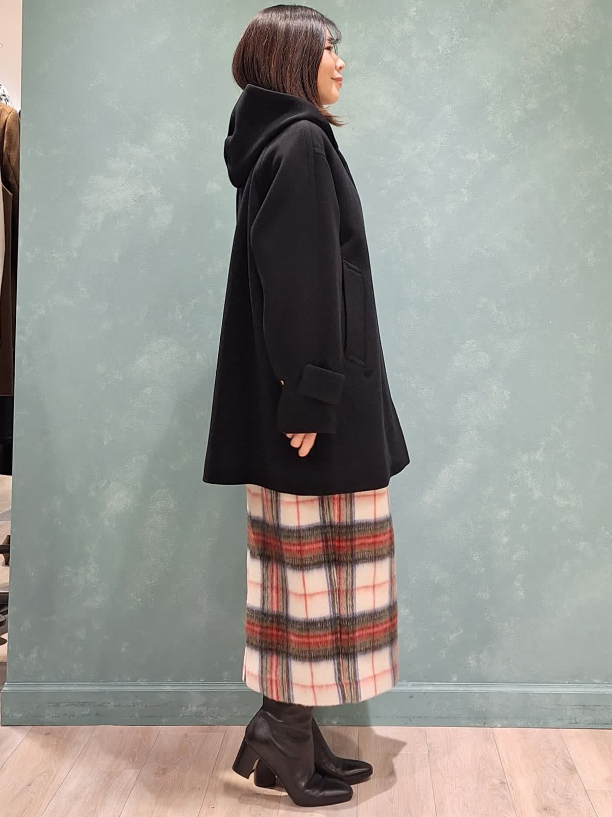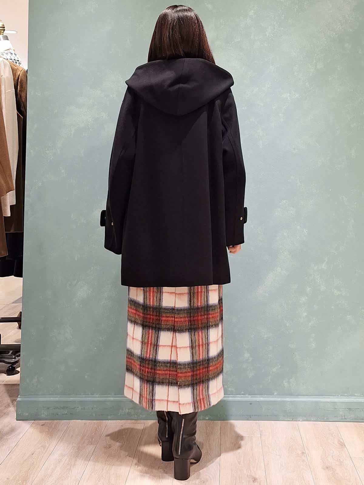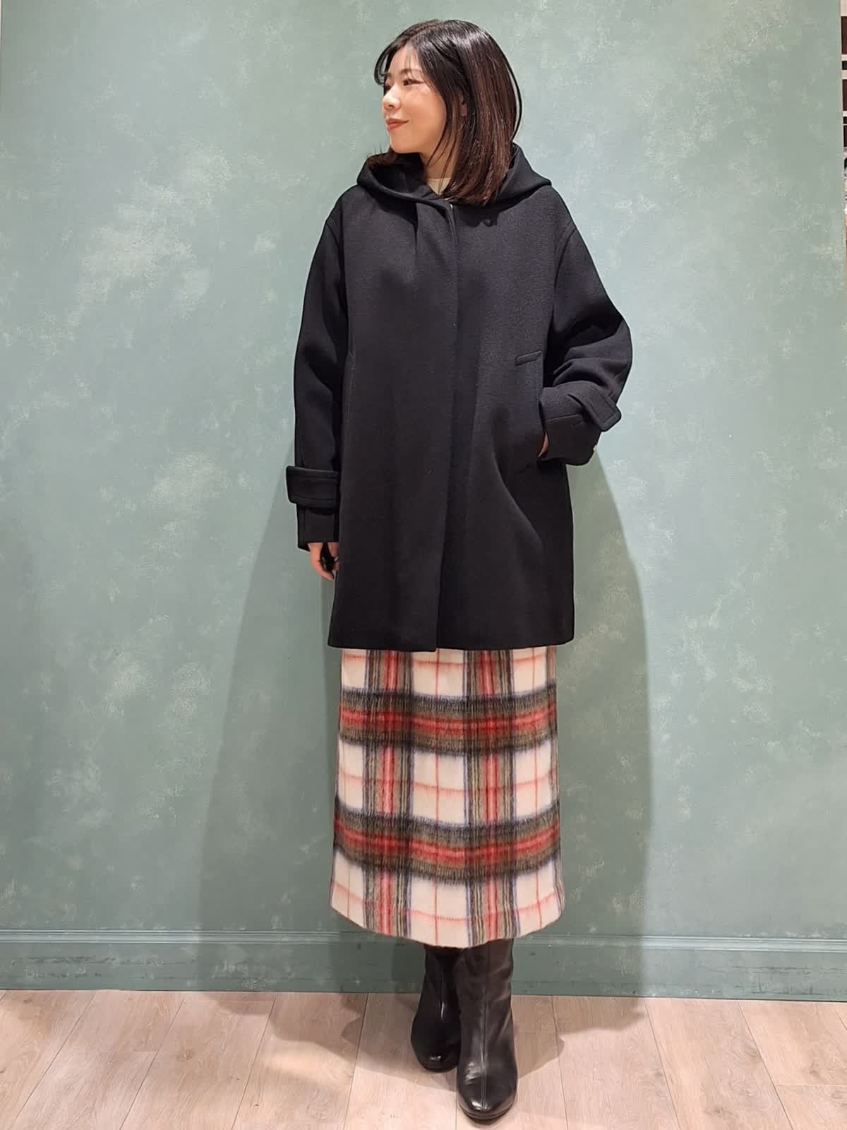 【着用サイズ、カラー】コート:7号、ブラック ニット:9号、オフホワイト スカート:9号、オフホワイト バッグ:グレーベージュ 休日のお出掛けスタイル。メルトンフードコートは、お尻が隠れる安心の着丈で、スカート、パンツどちらも合わせやすいです。シンプルなデザインで、流行りがなく毎年着ていただけます。着用のブラックはキュっとスッキリ見えます。インナーは、イヴォンのバイカラードルマンスリーブニット×チェックスカートを合わせました。冬らしく暖かみがあり、スッキリ見えするコーディネートです。