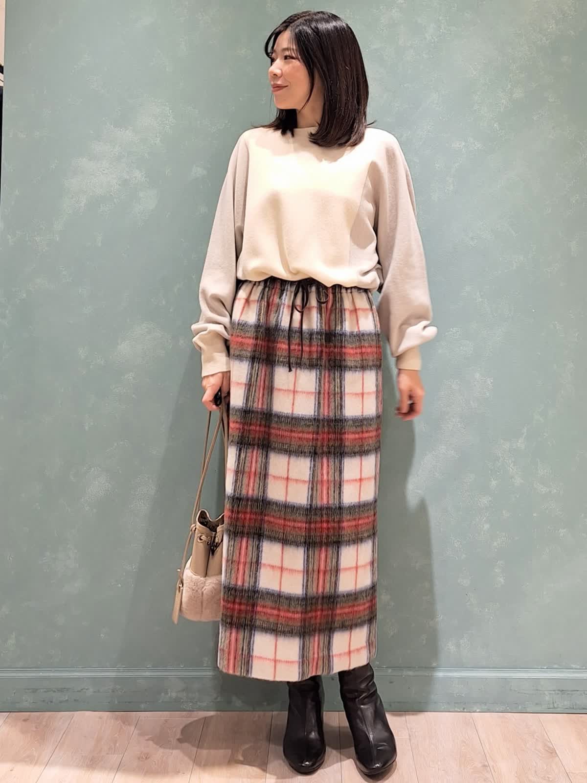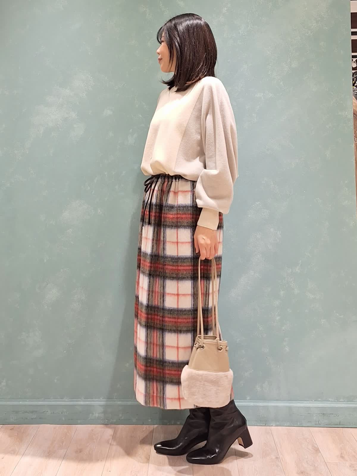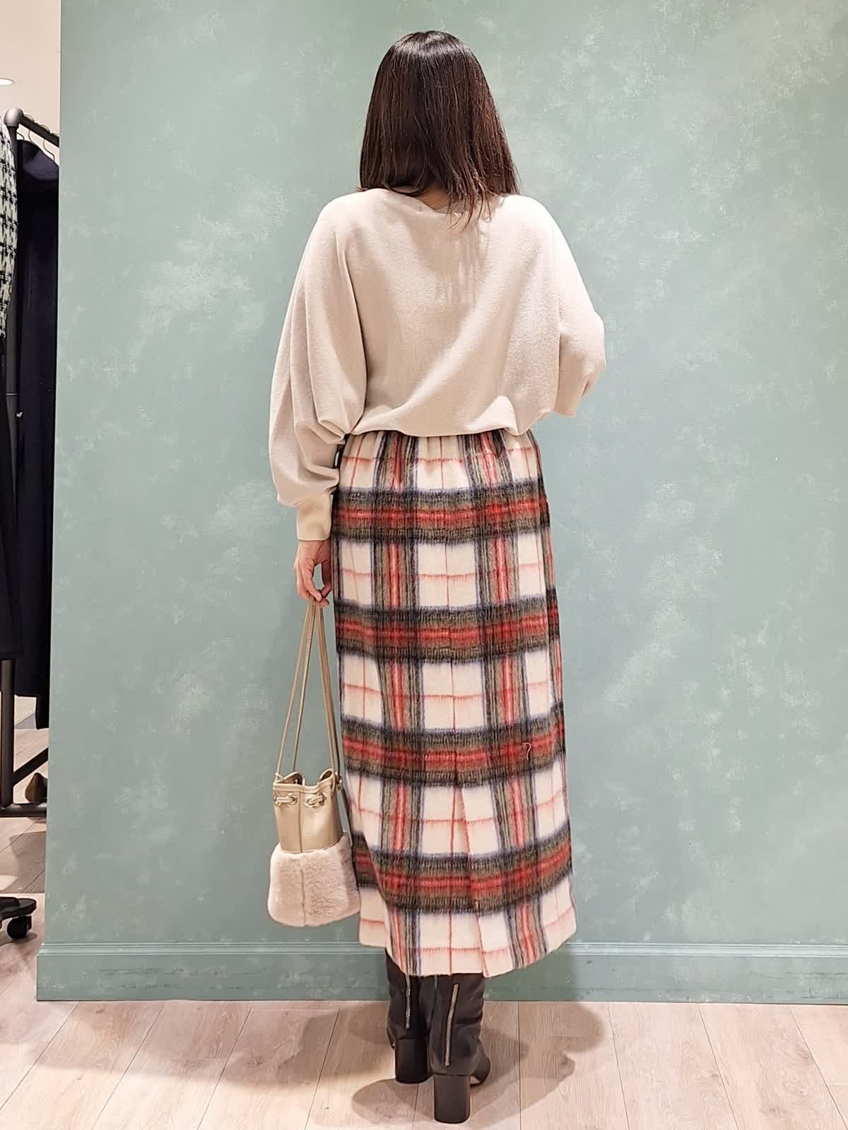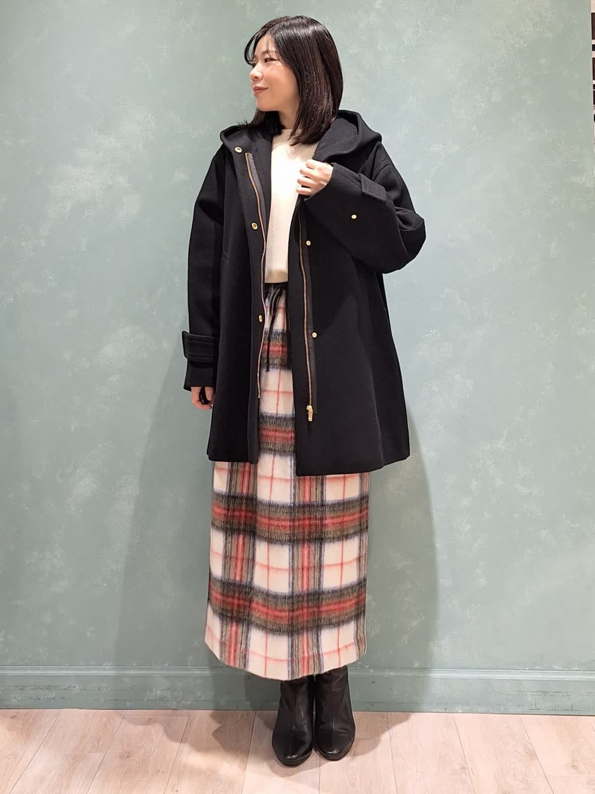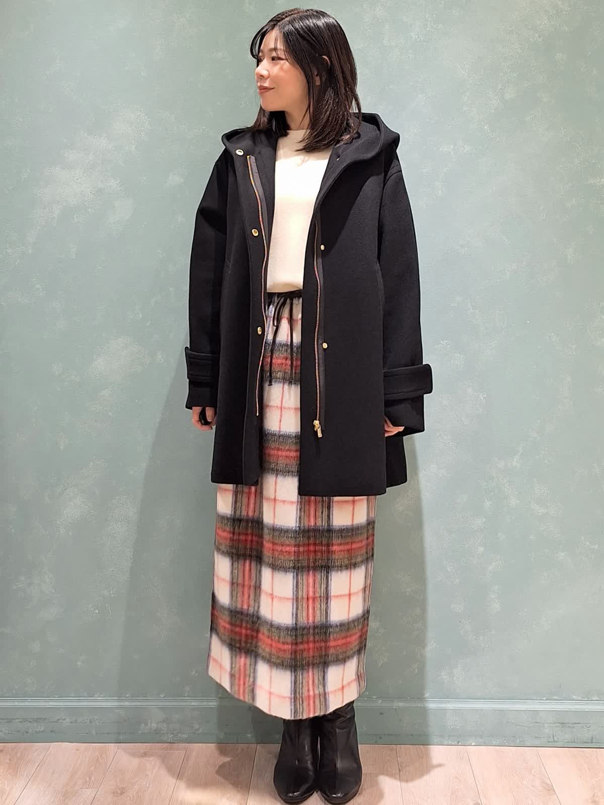 【着用サイズ、カラー】コート:7号、ブラック ニット:9号、オフホワイト スカート:9号、オフホワイト バッグ:グレーベージュ 休日のお出掛けスタイル。メルトンフードコートは、お尻が隠れる安心の着丈で、スカート、パンツどちらも合わせやすいです。シンプルなデザインで、流行りがなく毎年着ていただけます。着用のブラックはキュっとスッキリ見えます。インナーは、イヴォンのバイカラードルマンスリーブニット×チェックスカートを合わせました。冬らしく暖かみがあり、スッキリ見えするコーディネートです。