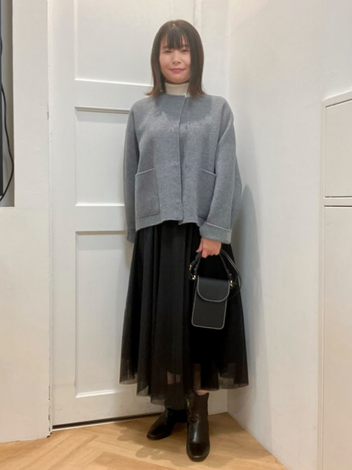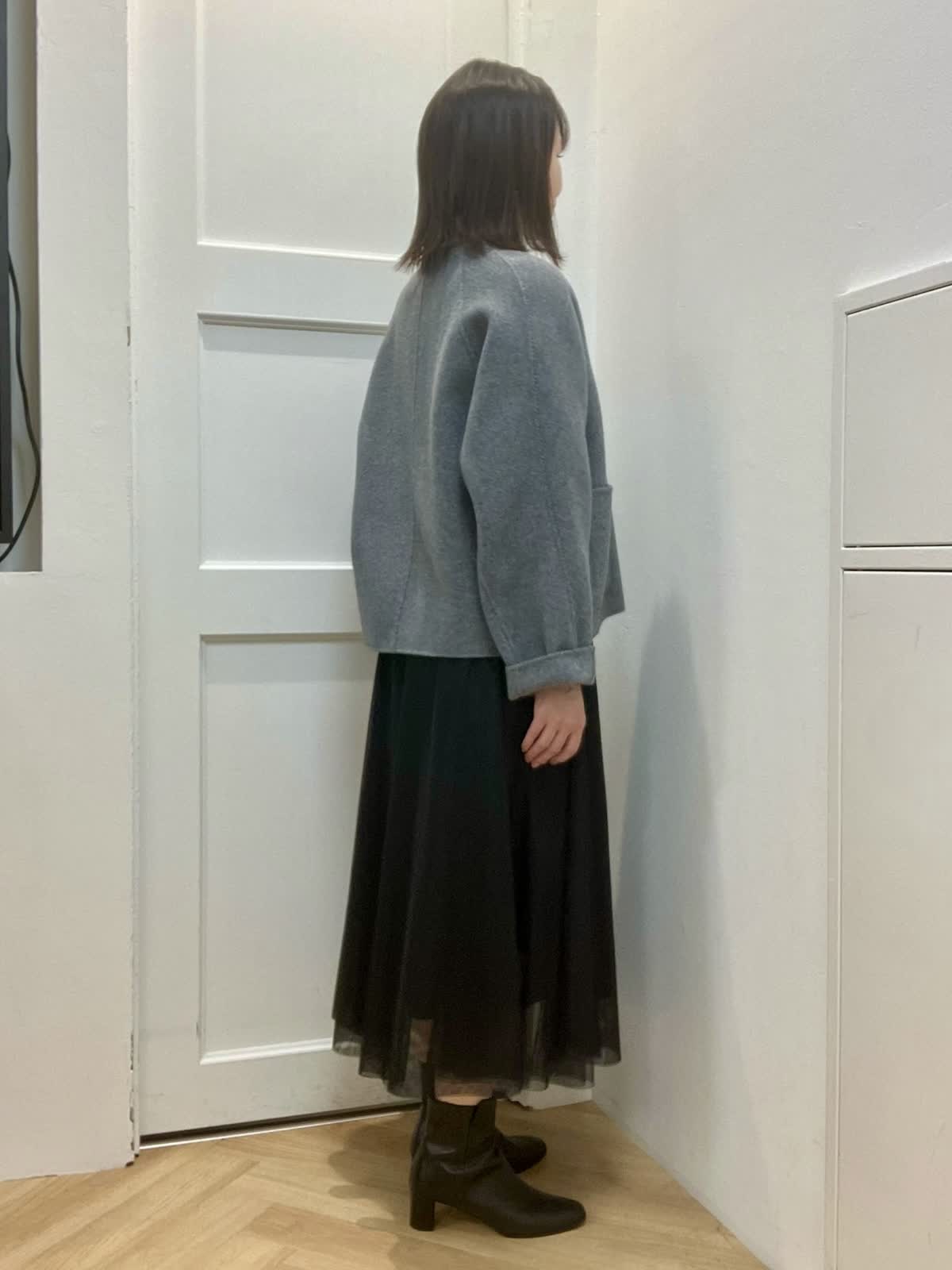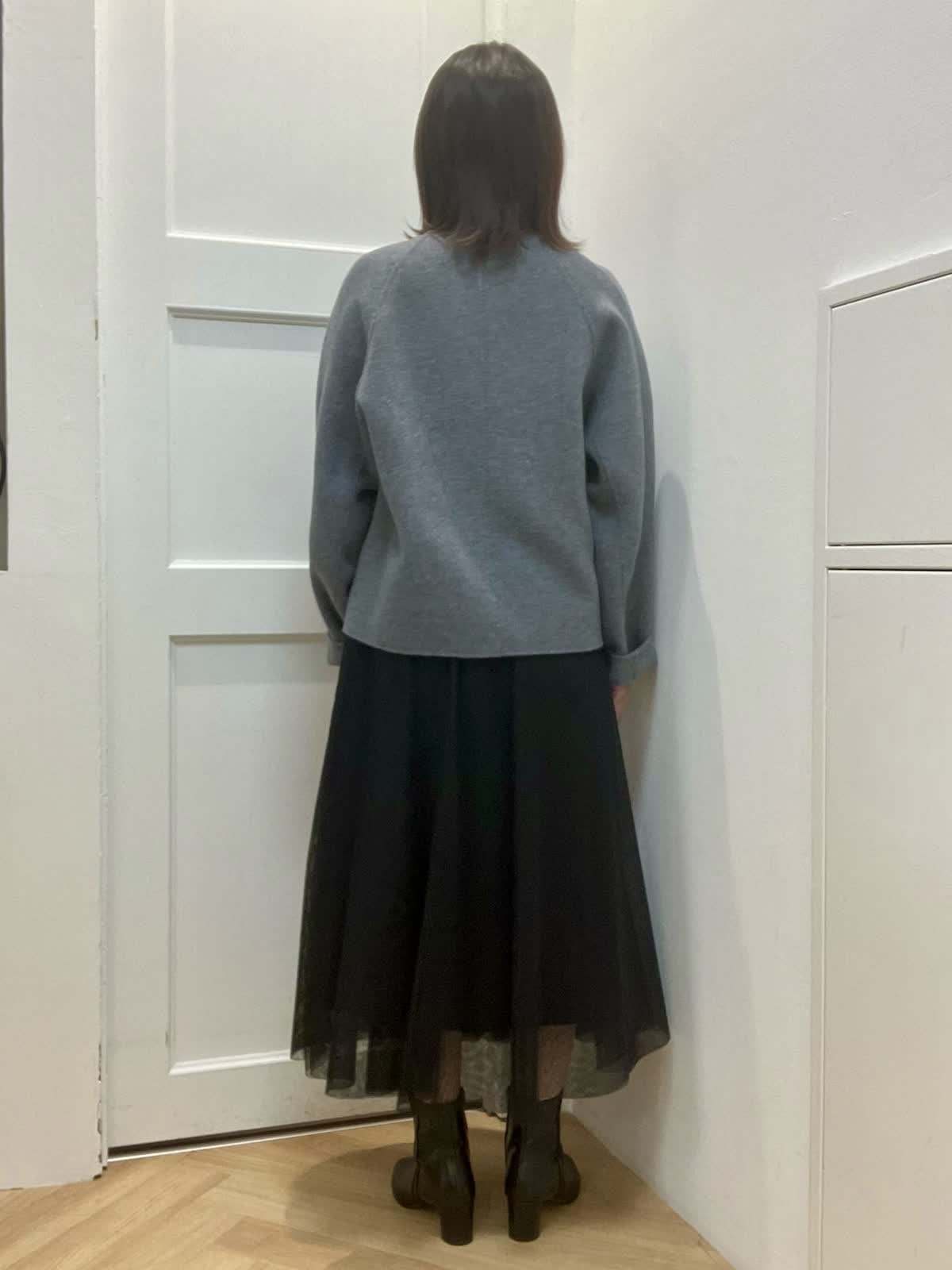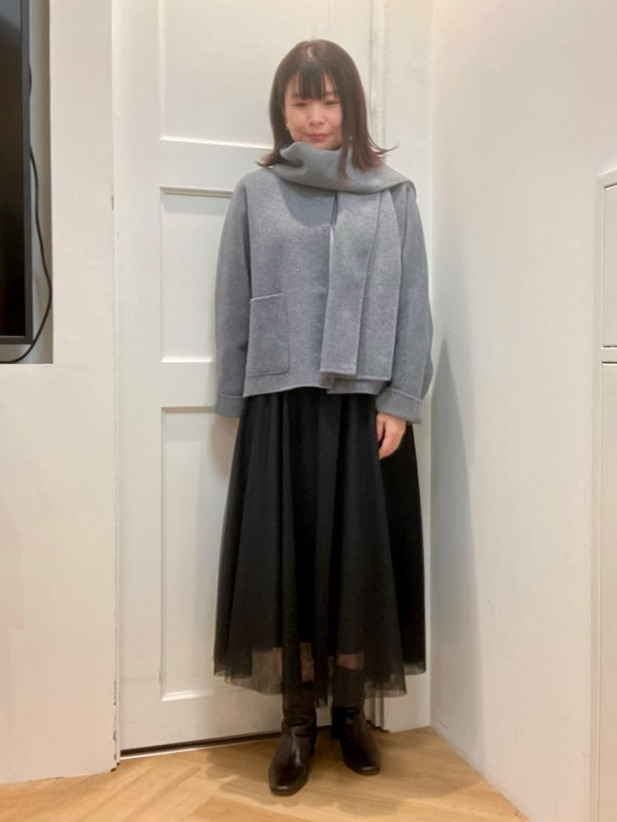 【着用サイズ】全て9号 【着用カラー】コート:グレー ニット:アイボリー スカート:ブラック 一枚仕立てのリバーコートはとっても軽く、カーディガン感覚で羽織って頂けます。 背中のフォルムが女性らしく、ストール付なのも嬉しいポイント。 チュールスカート合わせでフェミニンコーデにしました。