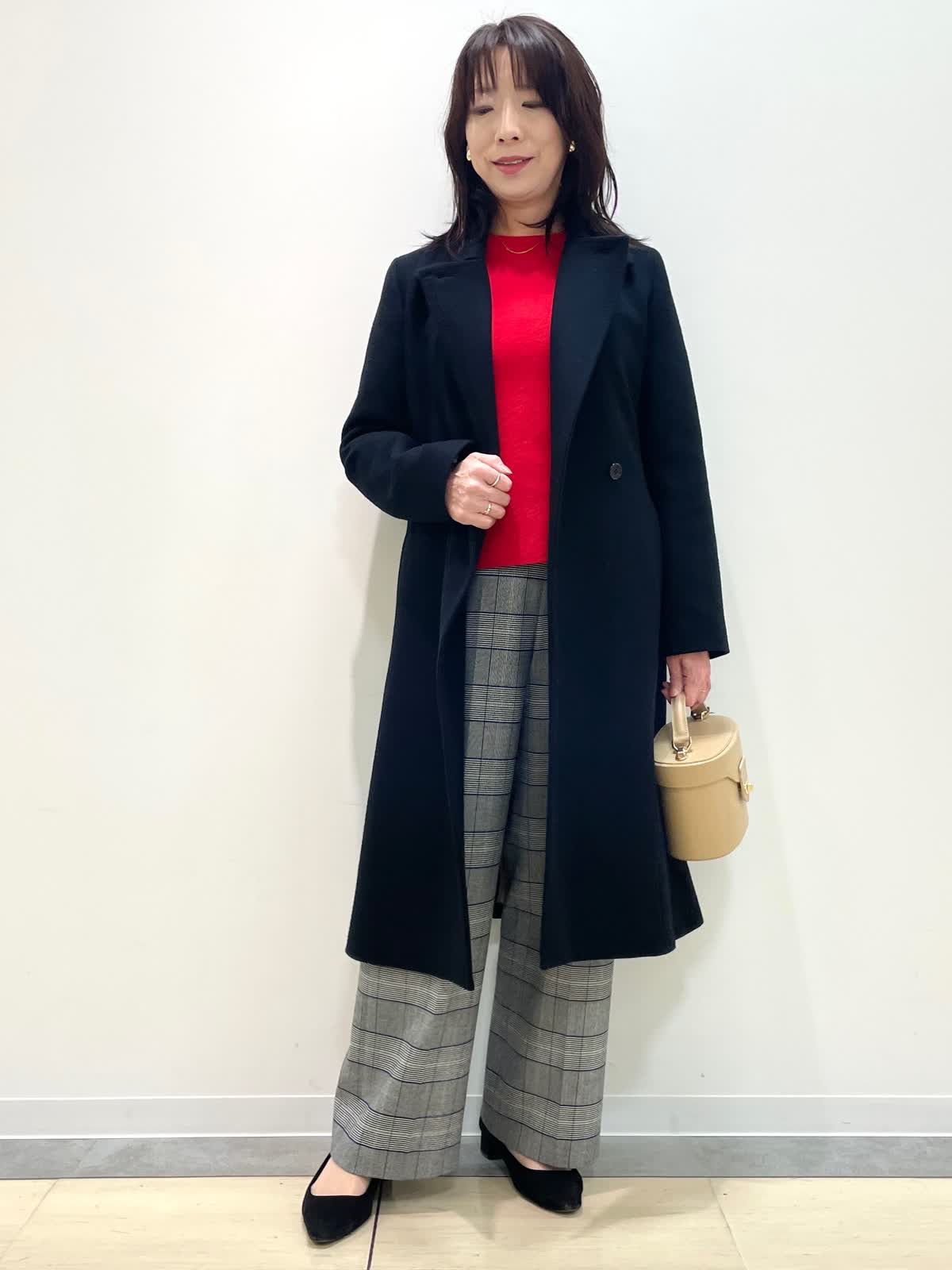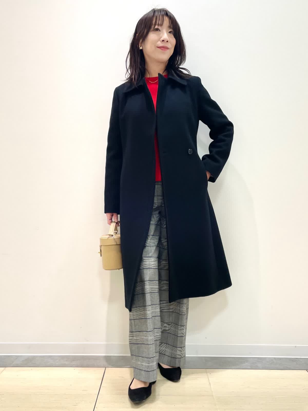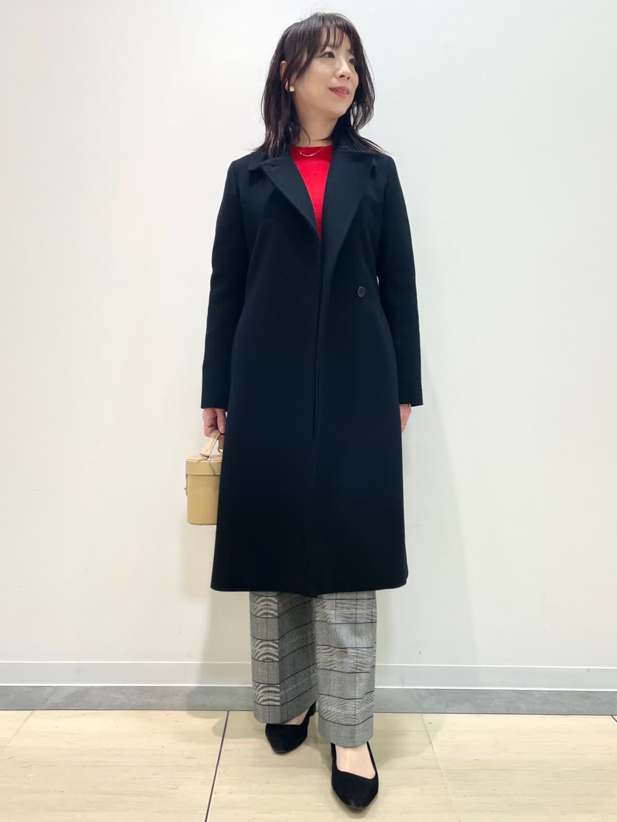 【着用サイズ】コート:9号 ニット:9号 パンツ:9号 【着用カラー】コート: ブラック ニット:レッド パンツ: グレンチェック バッグ:ベージュ 冬のお出かけスタイル。テーラードカラーコートは流行に左右されず様々なシーンに対応。スタイルアップ見えするシルエットで、前を閉じると雰囲気を変えて着用いただけます。
