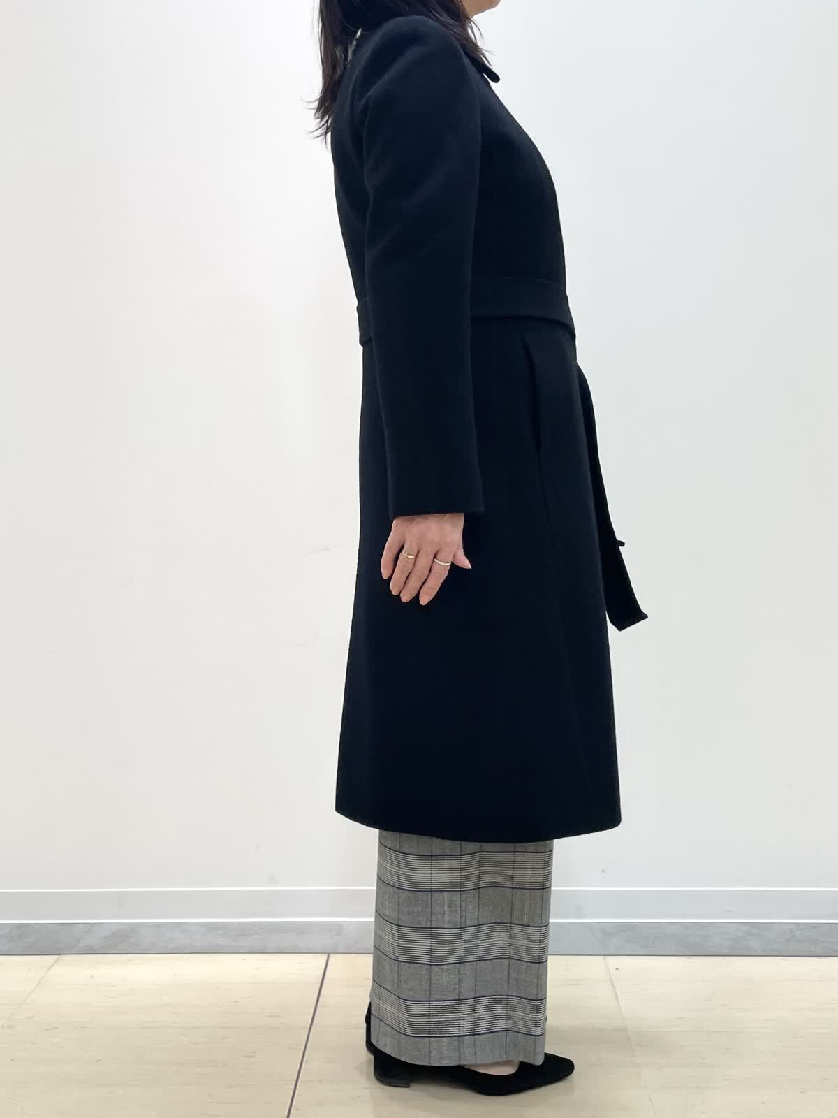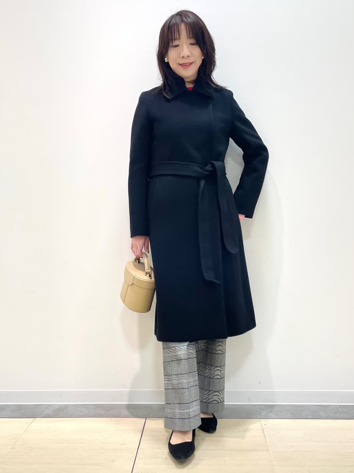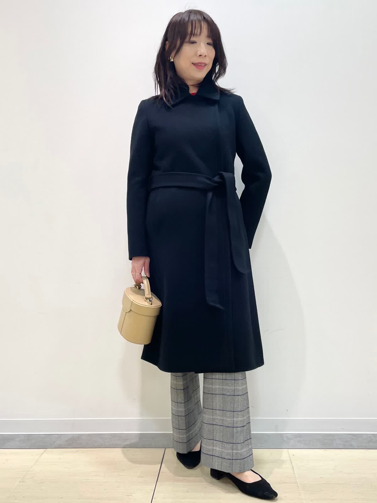 【着用サイズ】コート:9号 ニット:9号 パンツ:9号 【着用カラー】コート: ブラック ニット:レッド パンツ: グレンチェック バッグ:ベージュ 冬のお出かけスタイル。テーラードカラーコートは流行に左右されず様々なシーンに対応。スタイルアップ見えするシルエットで、前を閉じると雰囲気を変えて着用いただけます。