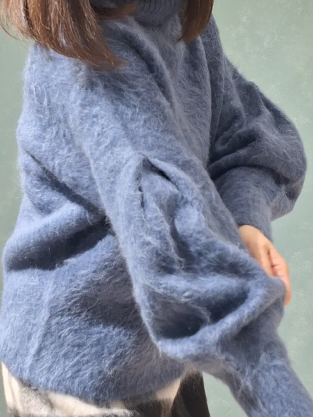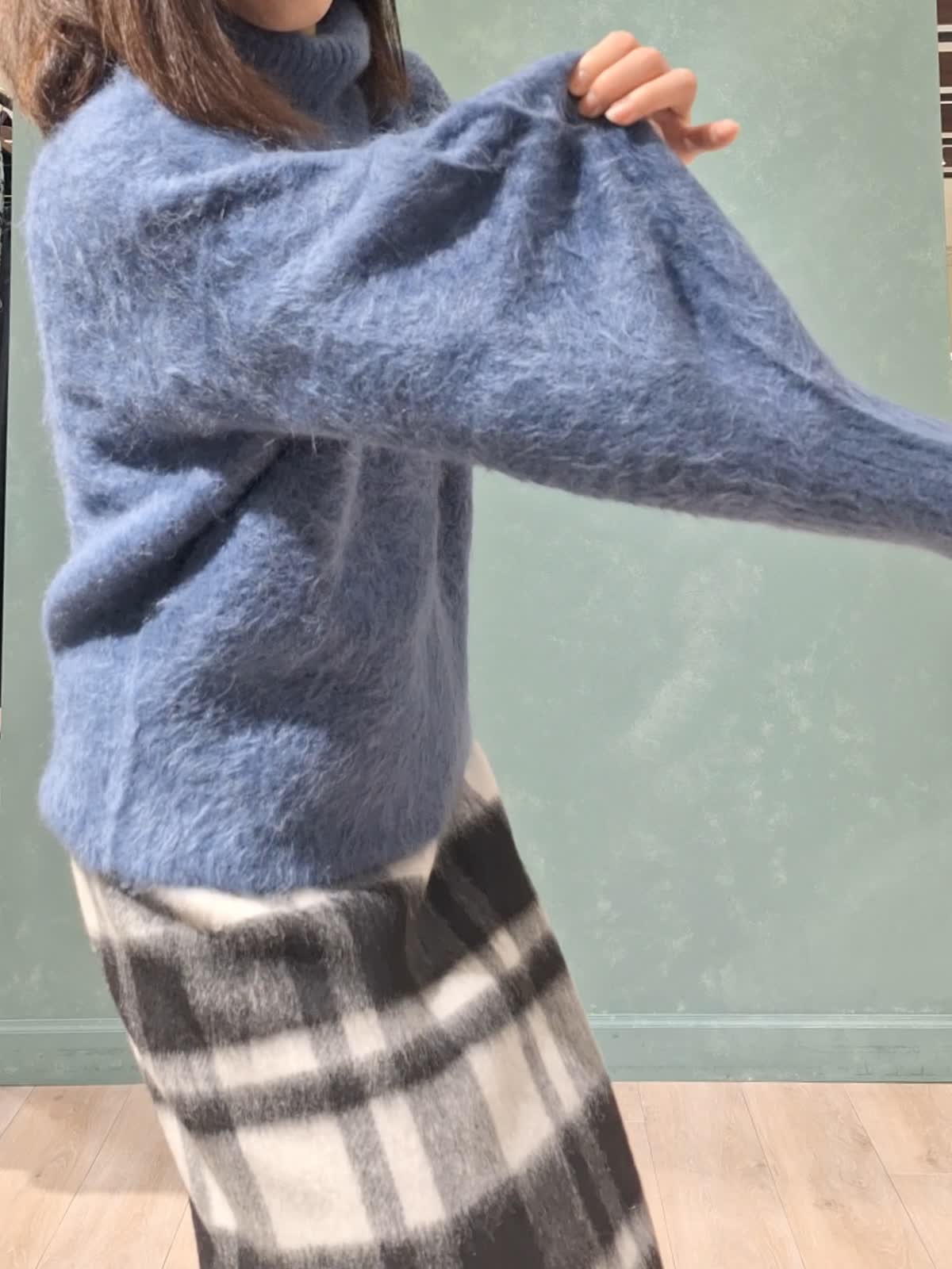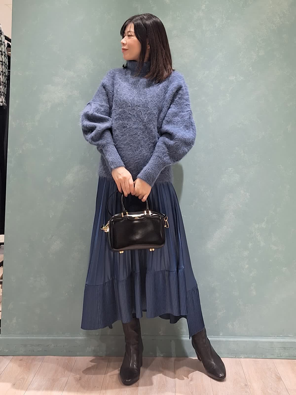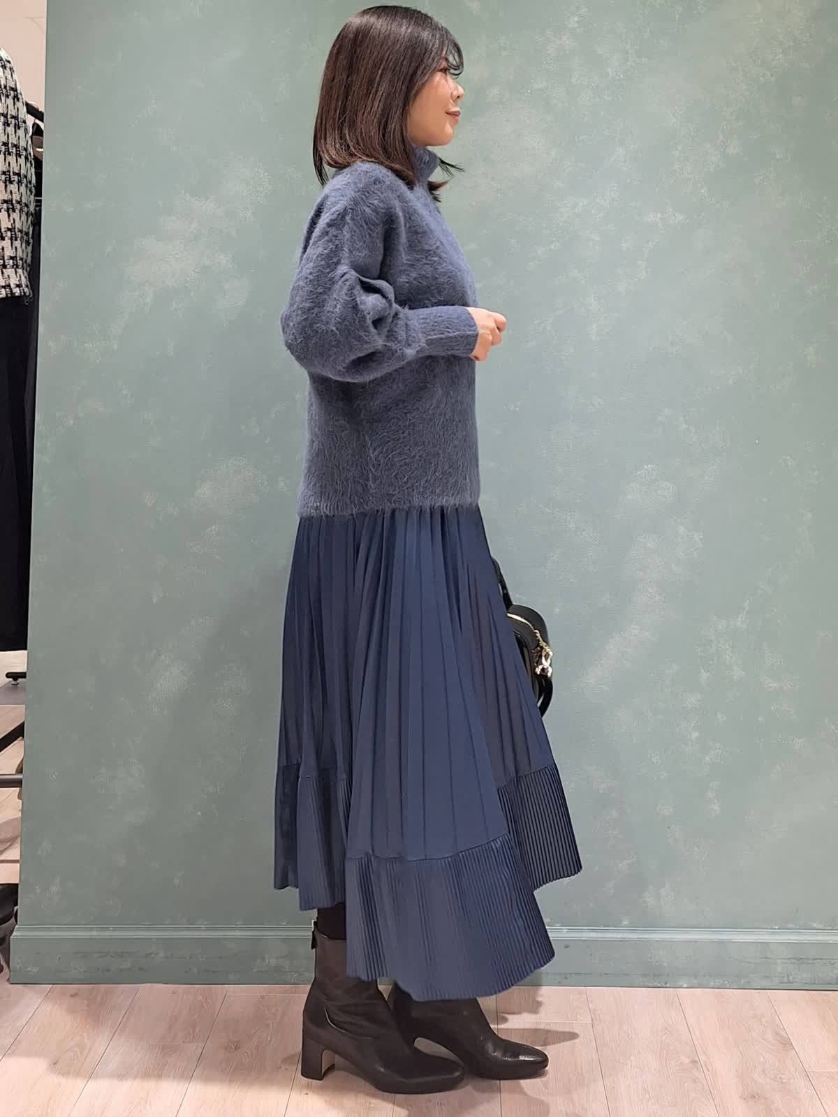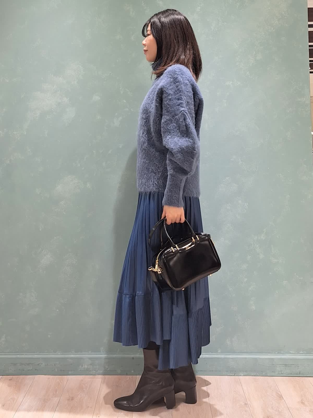 【着用サイズ、カラー】ニット:9号/ブルー スカート:9号/ブルー 大好きなブルーのワントーンコーディネート♪?トップスのニットはアルパカ混の素材でフワフワ。ボリュームスリーブがお洒落ポイントです!スカートやワイドパンツとの相性が良く、インしなくてもバランス良く着ていただけます。今回は、アシンメトリープリーツスカートを合わせてフェミニンカジュアルにコーディネートしました。